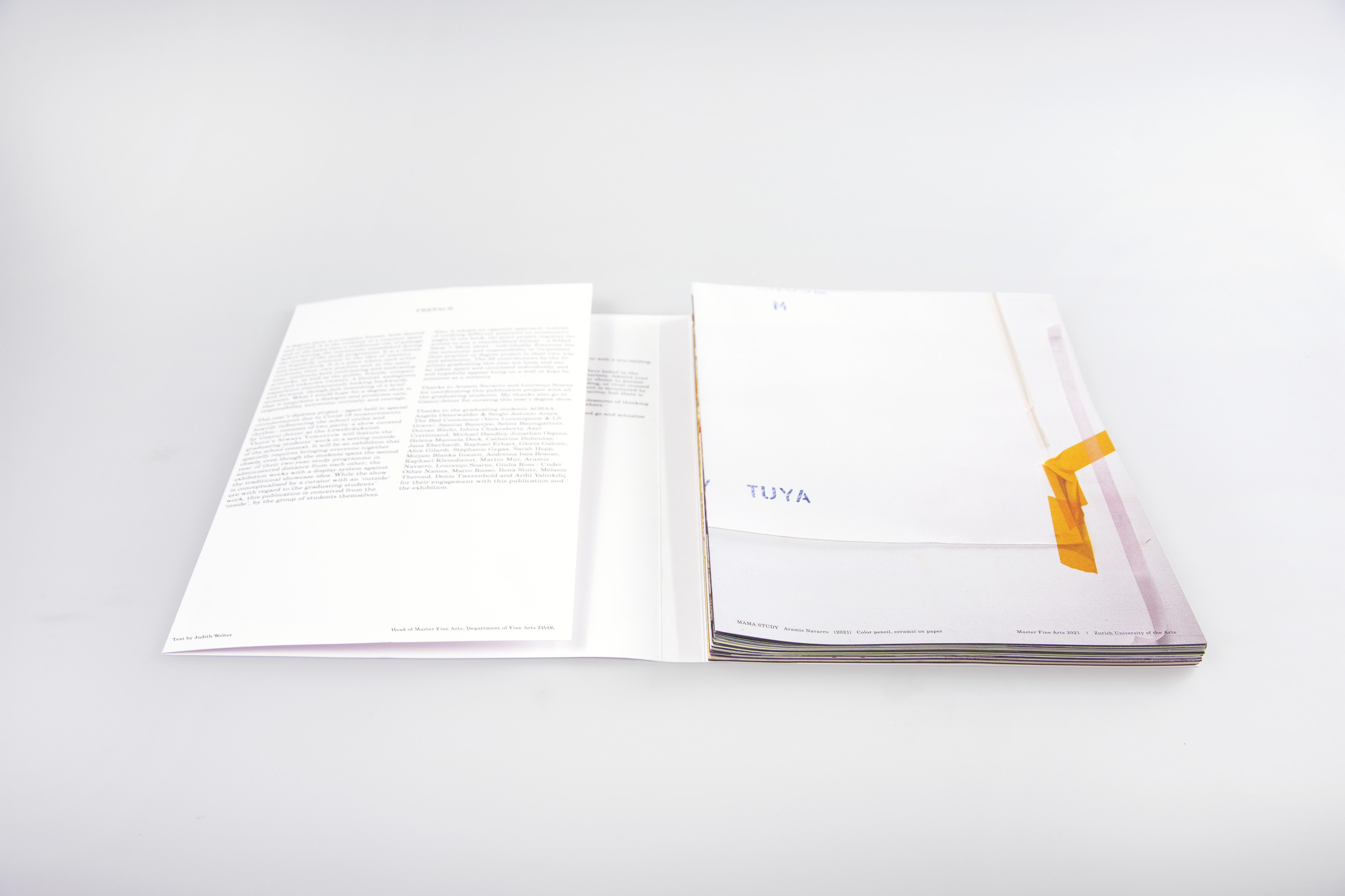 Das diesjährige Diplomprojekt – das aufgrund der Covid-19-Massnahmen, die den Schulzyklus und -rhythmus stark beeinflussen, erneut unter besonderen Umständen stattfindet – besteht aus zwei Teilen: Die von Gianni Jetzer kuratierte Ausstellung There’s Always Tomorrow zeigt die Arbeiten der Absolvent:innen im Löwenbräukunst, einer Umgebung ausserhalb des schulischen Kontextes. Die Ausstellung erfordert eine räumliche Nähe aller Beteiligten – und das, obwohl die Studierenden im zweiten Jahr ihres Studienprogramms gezwungenermassen Abstand halten mussten. Sie bildet ein Display, das sich von der traditionellen Idee des «Showcase» abhebt. Während die Ausstellung von einem Kurator konzipiert wird, der als «Aussenstehender» auf die Arbeiten der Absolvent:innen blickt, ist die vorliegende Publikation von «innen» heraus, das heisst von den Studierenden selbst, konzipiert. Diese Publikation verfolgt zudem einen gegenläufigen Ansatz: Anstatt die verschiedenen künstlerischen Praktiken in aufeinanderfolgenden Seiten in einem Buch zu vereinen, wurden die Künstler:innen dazu eingeladen ein standardisiertes Format – ein gefaltetes Blatt im Format 50 x 50 cm – individuell zu bespielen. Jede und jeder hat die Autonomie und Verantwortung, seine/ihre künstlerische Praxis oder das Diplomprojekt auf eine eigenständige Weise und Ästhetik zu (re)präsentieren. Die 29 Beiträge der 31 Künstler:innen, die in diesem Jahr Studium abschliessen, sind lose und können einzeln herausgenommen werden. Hoffentlich werden sie irgendwo an einer Wand hängen oder von jemandem als Erinnerungsstück aufbewahrt werden.