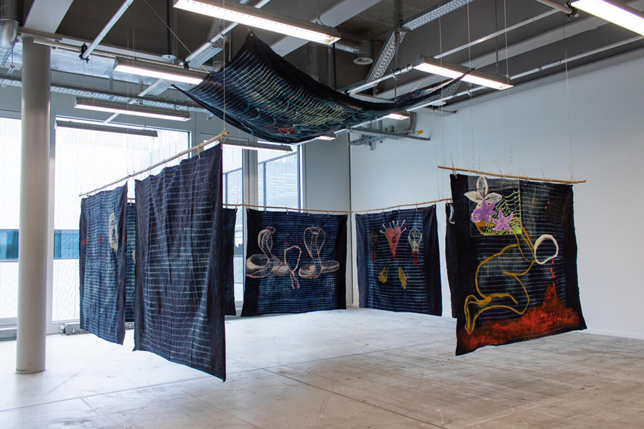 Multimedia Installation; Öl und Ölpastell auf nachträglich gebleichten Stoffen vom Fula Volk (Traditionelle Stoffe, gefärbt von Musa Jaiteh aus Gambia)