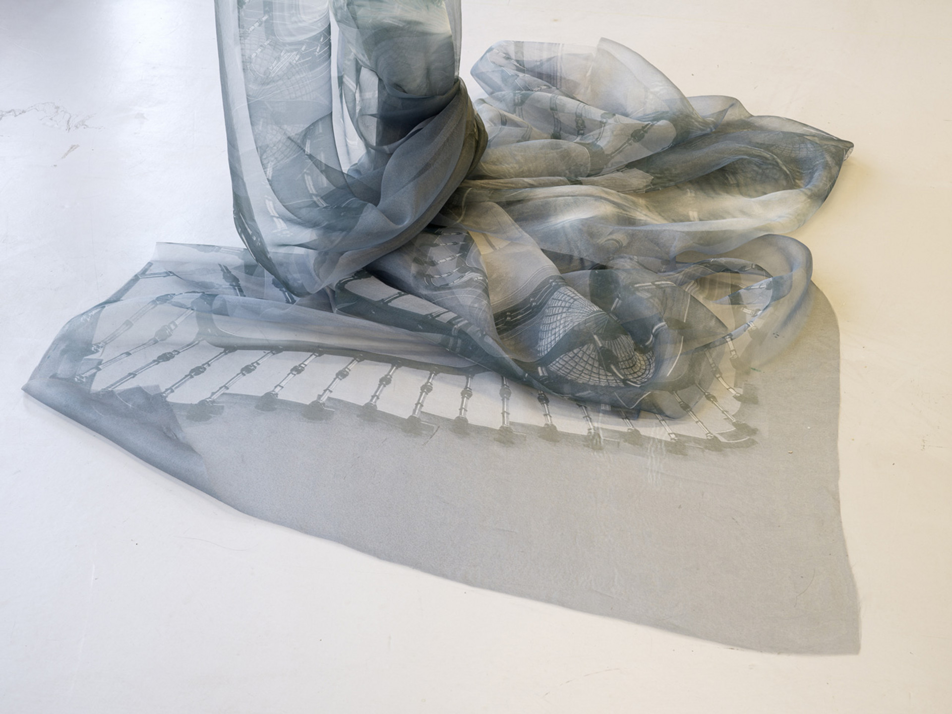 (…) THE THING ITSELF ALWAYS SLIPS AWAY 2025 Sublimationstransferdruck auf Polyester, Metallstab 300 x 300 cm