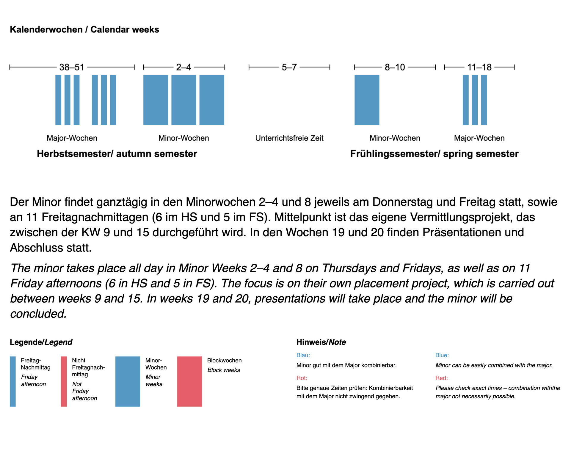 The minor takes place as a full-day course in the minor weeks in week 2 to 4 and week 8 to 10 and continues on Friday afternoons during the semester.