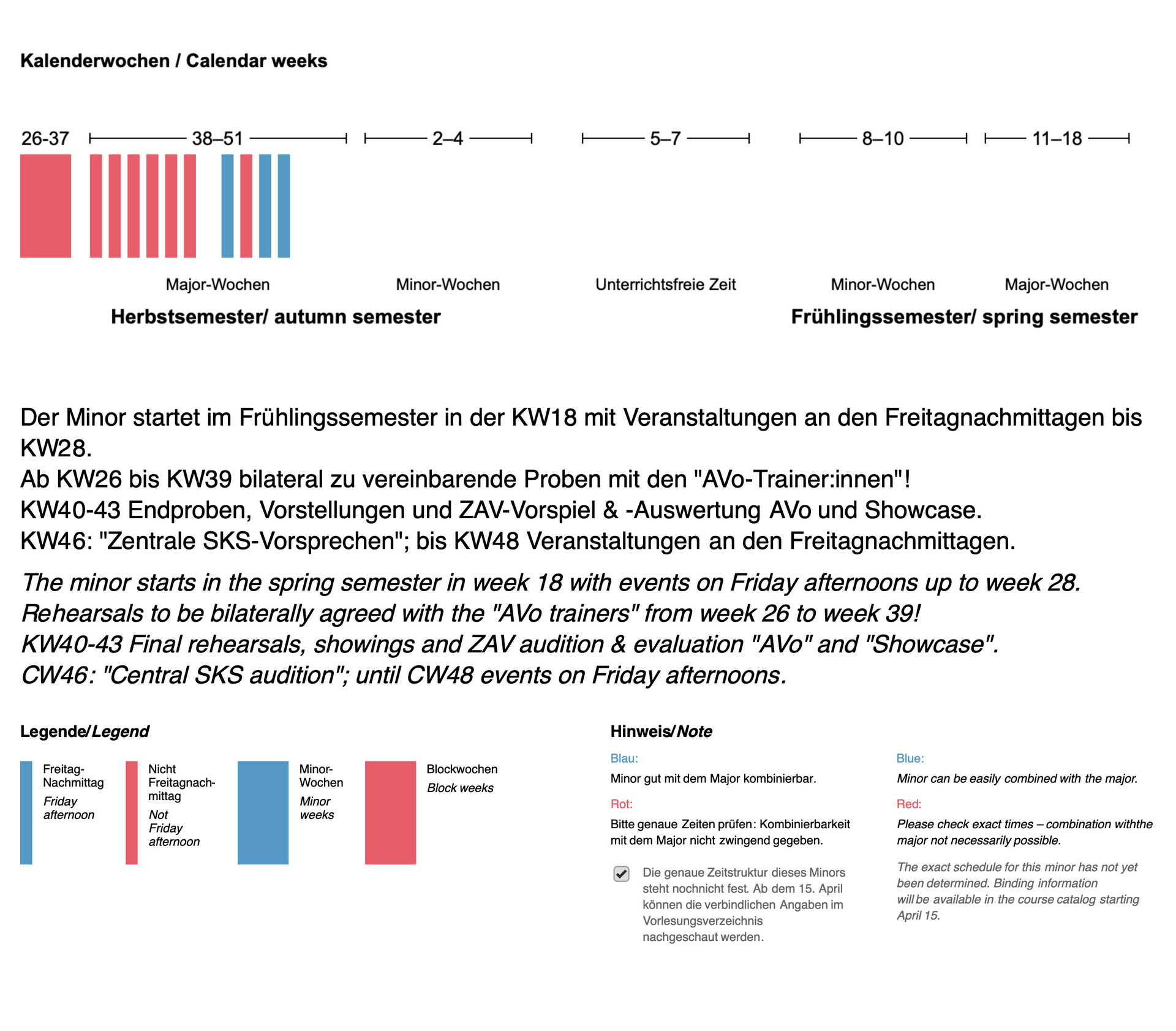 The minor, offered by the Theatre discipline, is taught in German and English and aimed at Bachelor’s students. It is open to Level 3 students from the Acting major and is offered once a year.