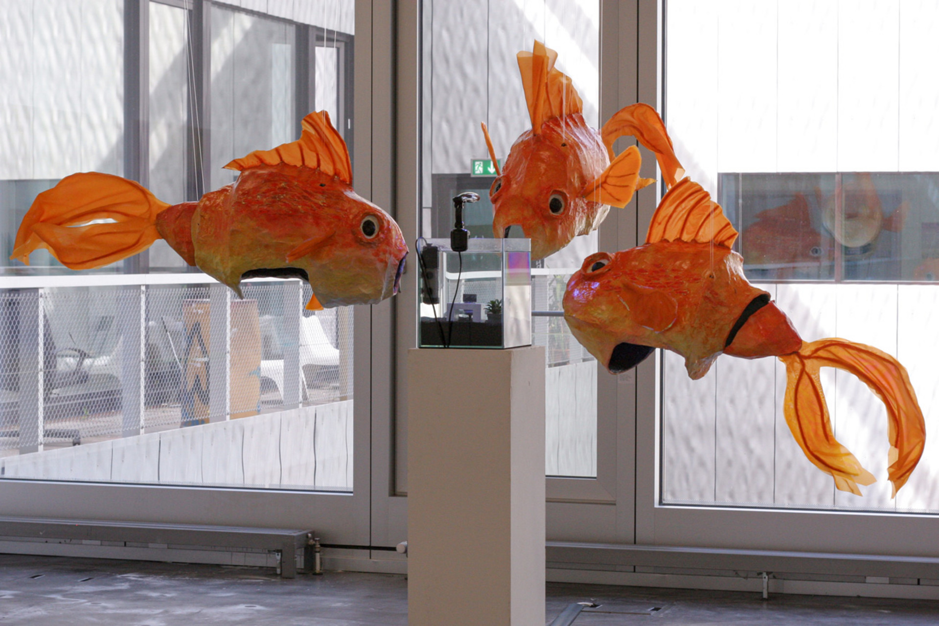 KEPT FISH NEVER STARVE 2025 Paper mache fish masks, aquarium, lamp, office space model 212 cm x 240 cm x 163 cm