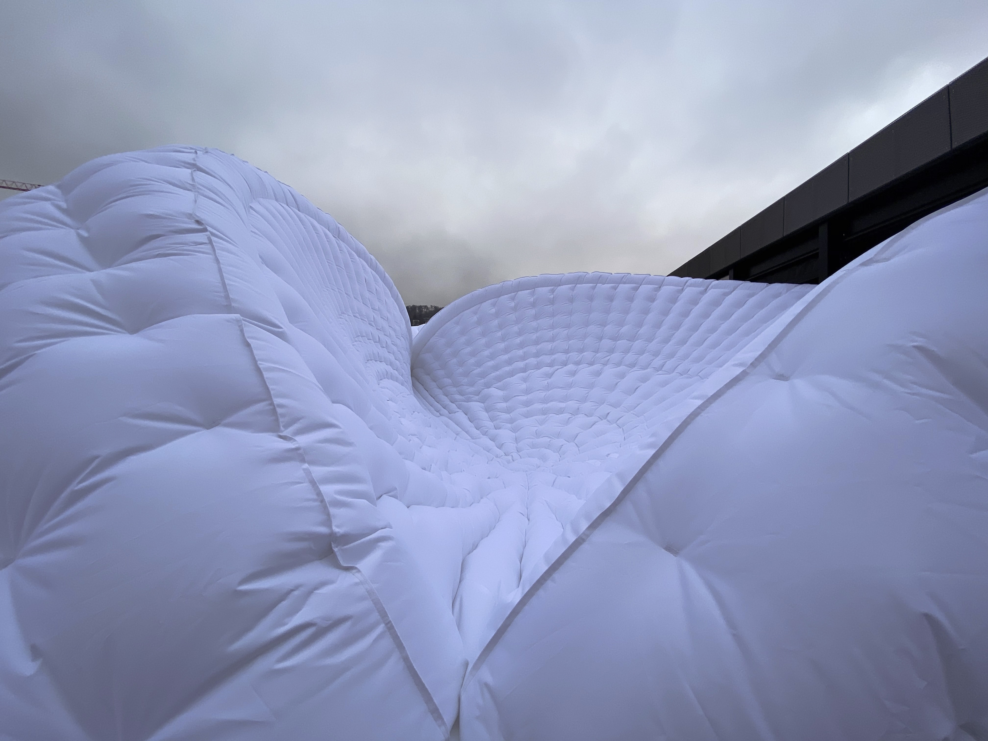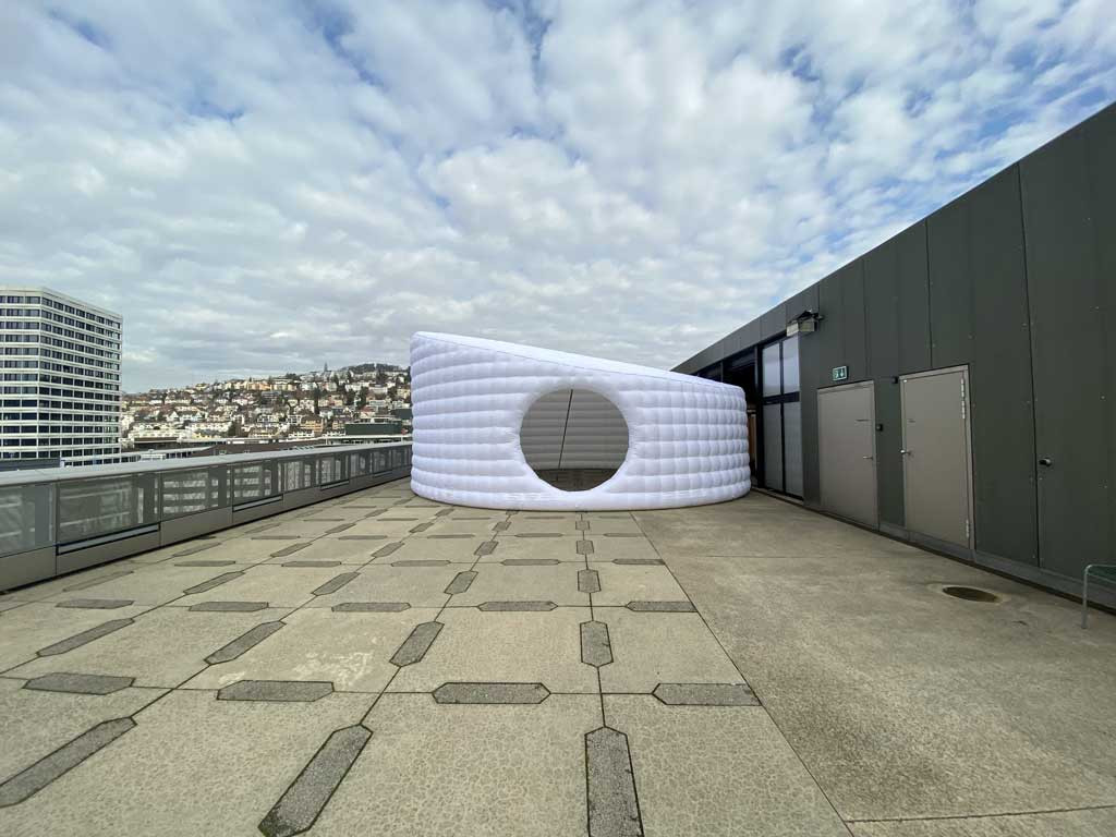 How does air become space? As an extension of our wind tunnel and at the same time as a pop-up sculpture, the Inflatable Pavilion With a Hanging Roof (2020) makes an appearance wherever 220 V is available. The pavilion was developed by Florian Dombois and Fabio Don and realized by eight seamstresses from the company X-Ballon.