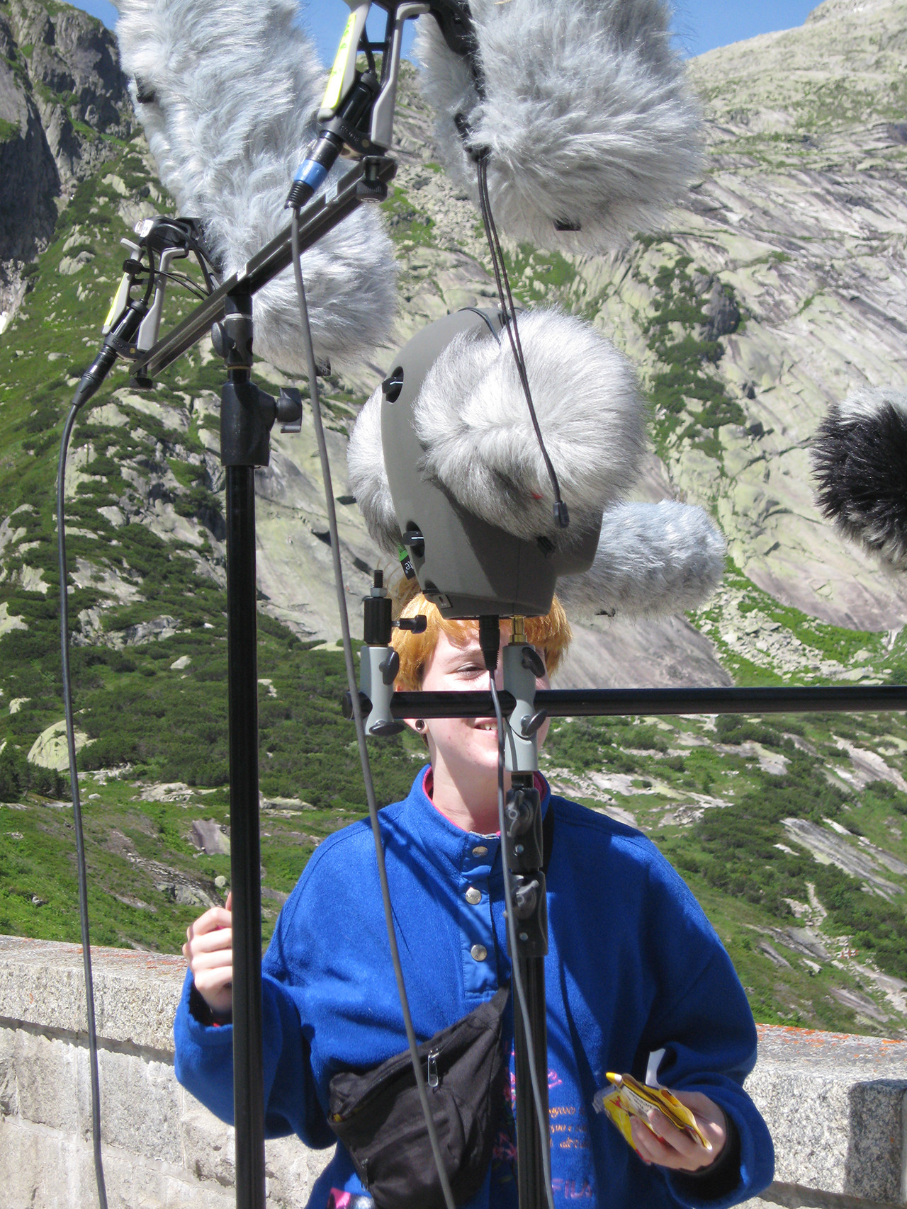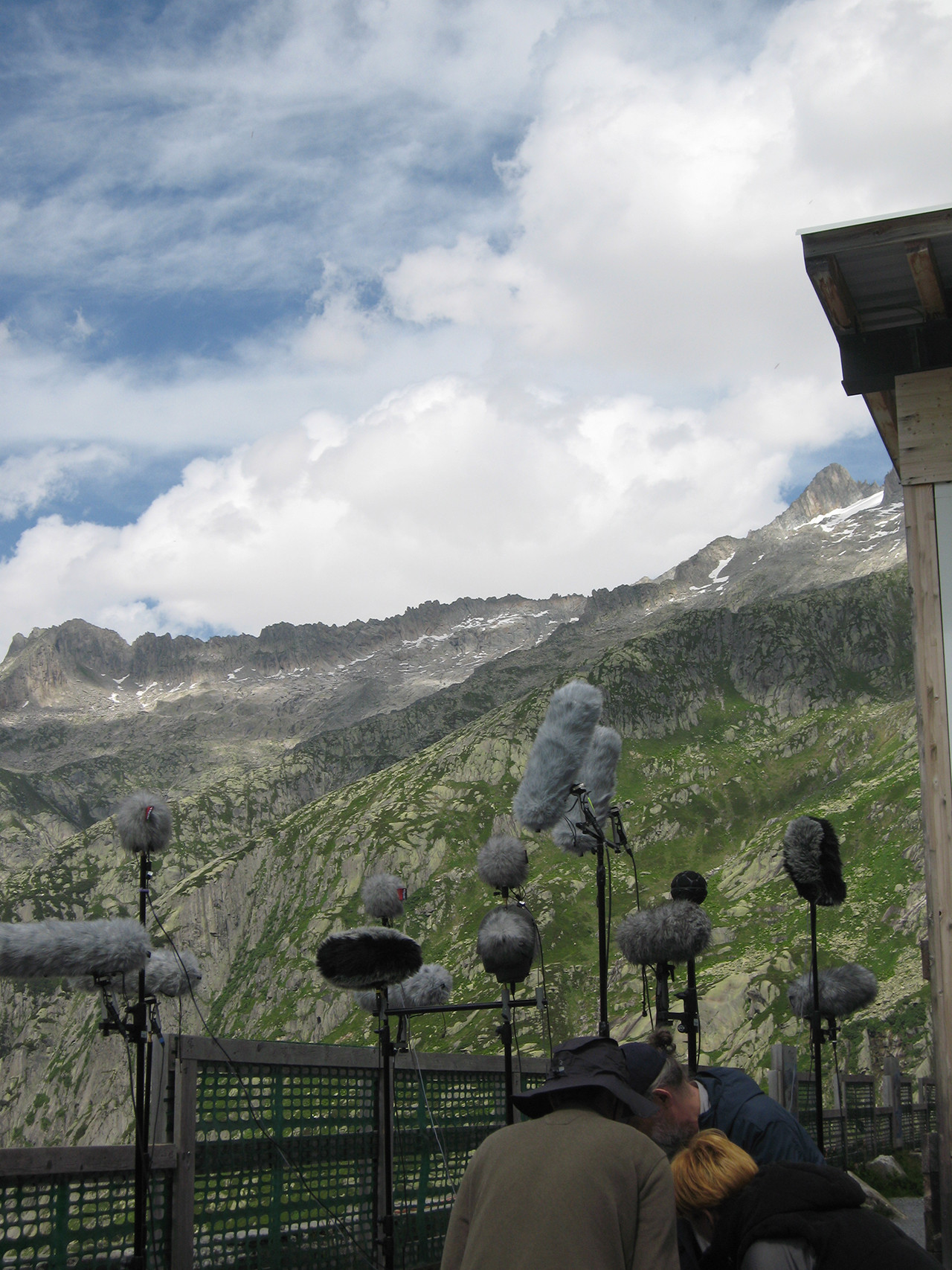 • The image on the screen of the Grimsel valley by day is a kind of visual overload. There is a lot going on on the meandering pass road. Colonies of cars move uphill, motorcyclists overtake trucks, even yellow postbuses appear. An excavator suddenly starts working in the gravel pit. The acoustic events that are visible in the picture are present and yet far away. Can't we also hear the rushing of a mountain stream? The wind from the mountain tops? The passing of an airplane far up in the sky? How do we construct an acoustically believable soundscape with all these sound events that allows us to immerse ourselves in this bizarre image of busy mountain landscape that doesn't want to be idyllic at all? How strong is the immersive effect of the array recording technique applied here? How do we achieve this immersion effect, which is used for the perception of a large space and produces the feeling of being right in the middle of it?