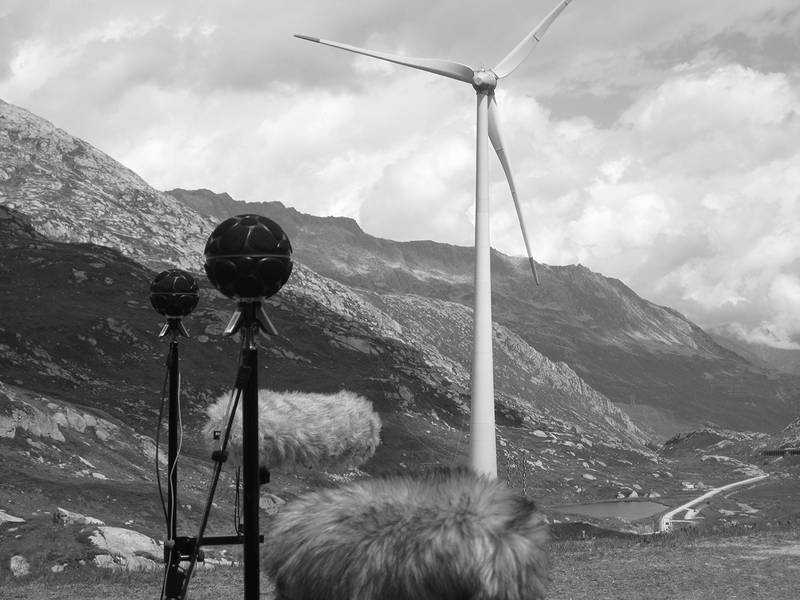• On the screen, the Gotthard landscape with a wind turbine can be seen at a distance of around 200 meters. In addition to the expected mountain atmosphere, the hissing and whooshing sound of the wind turbine's rotor blades can be heard.