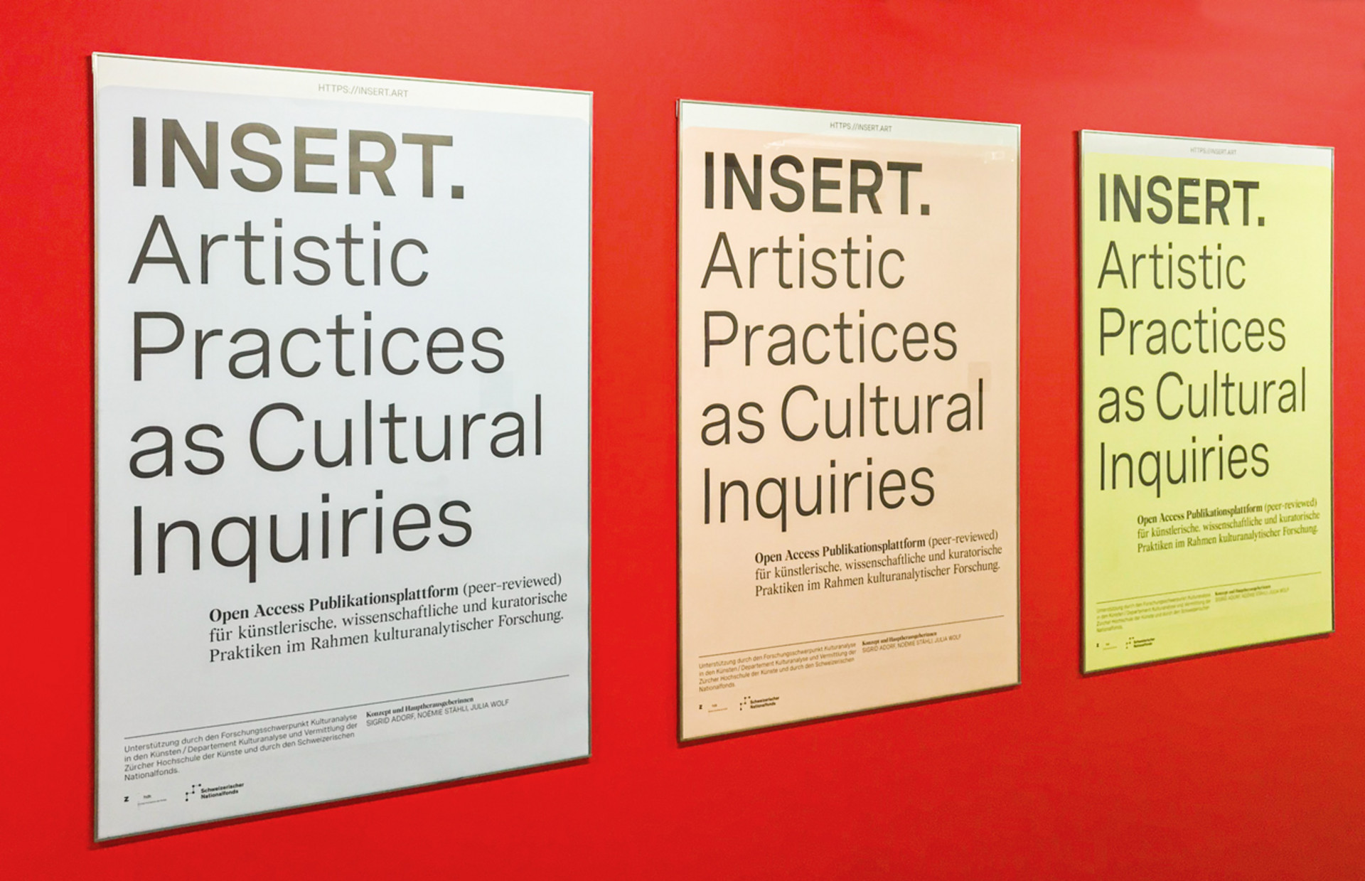 The open access publication platform is seeking to bring together artistic, scientific and curatorial practices in the frame of culture analytical research. INSERT was developed by Sigrid Adorf, Noëmie Stähli and Julia Wolf at the Research Focus Cultural Analysis in the Arts and was first published in October 2021. The issues (usually two per year) focus on different topics and are edited by different editors.