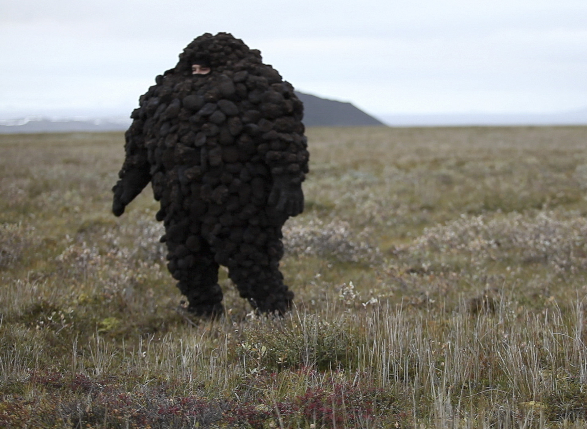 A Wideness strewn with rocks, with mountains on the horizon. And a figure, made of lumps of earth overgrown by something, in the midst of it. Restlessly moving through different topographies, passing by moors, lakes and mosses. Then there's a portrait of a woman, and bumblebees going into her mouth, after she opened it. An other portrait of a man, who's skin is at first moistly and then gets fissured, and again the woman who's countenance becomes fragile, and lightens up while it's getting dark. Walking by near boulders the figure arrives at the ocean, gets into it and in the end dissolves.