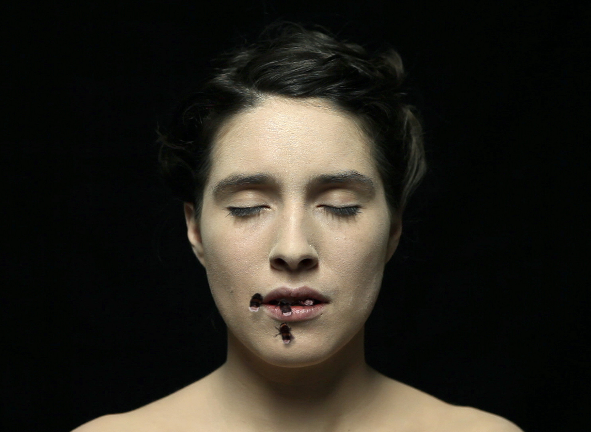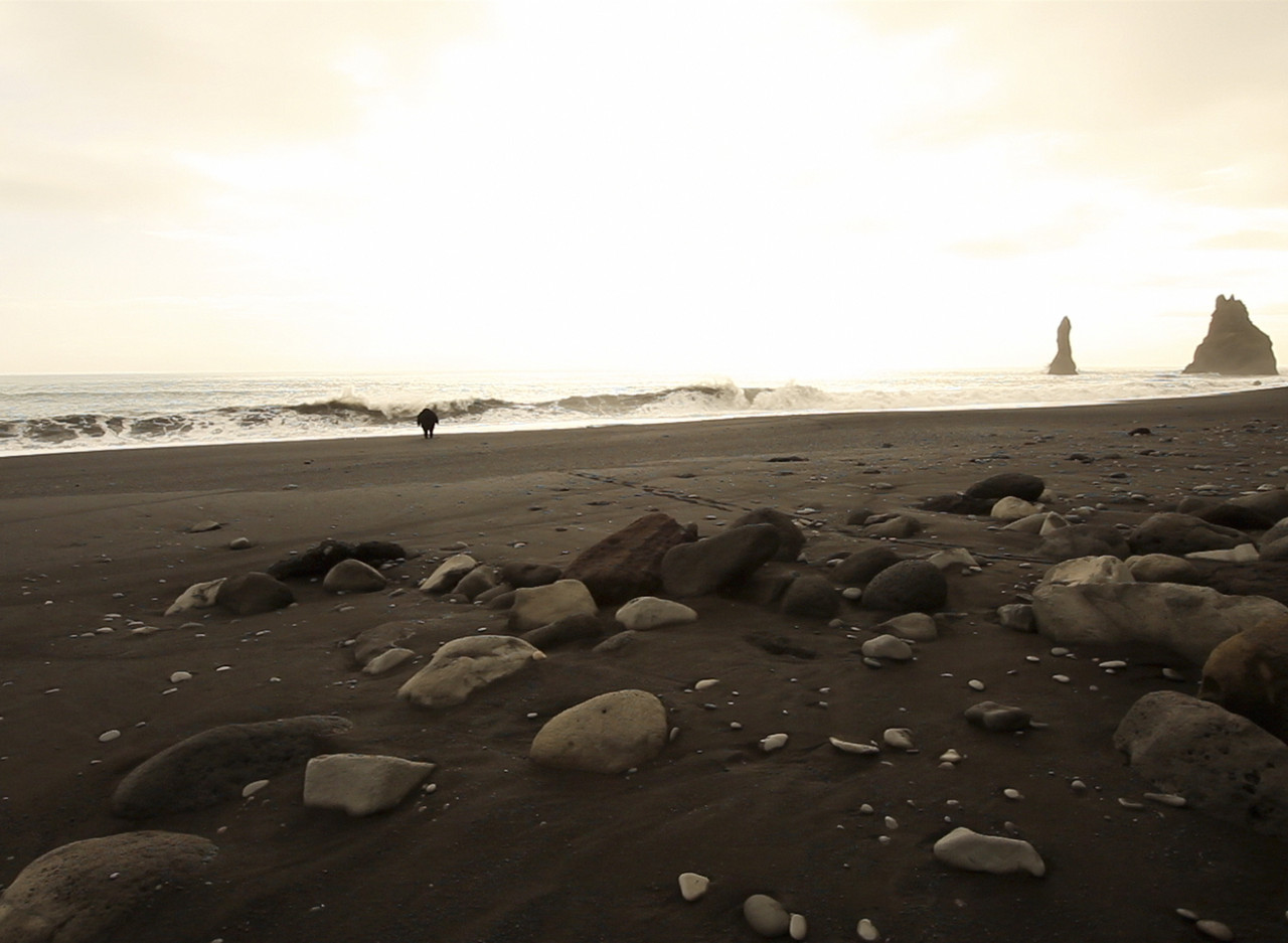 Weite, und eine Figur aus Erde beschaffen, die sich darin bewegt, immerfort und an verschiedenen Topografien vorbei, bis sie ankommt, anhält und eintaucht ins Meer, um sich schliesslich darin aufzulösen. Dazwischen Bilder, Portraits einer Frau und eines Mannes, in deren Mund sich Hummeln begeben, dessen Haut trocknet, und deren Antlitz zu leuchten beginnt, bevor es in der Dunkelheit entschwindet.