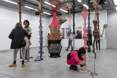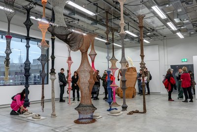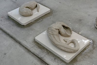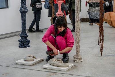 Installation | Recyclingmaterialien | Baumwoll-Polyesterstoff- und Wollgarne | Metall | Ungebrannter Steinzeugton | Gips