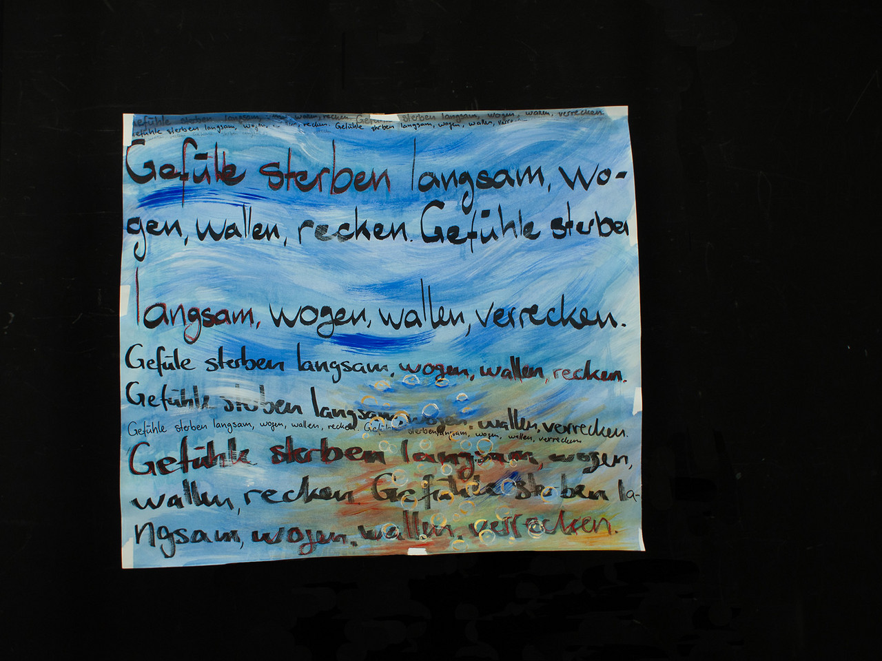 Diese Arbeit handelt von den Schmerzen einer unglücklichen Liebe während meiner Jugendzeit und verbindet Texte mit Bildern. Ich habe eigene Gedichte geschrieben und diese in Bildern ausgedrückt. Dabei erforschte ich mich und meine Gefühle. Mit meiner Arbeit versuchte ich, Enttäuschung, Herzschmerz und die zerrüttete ­Seelenlandschaft darzustellen.