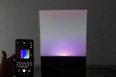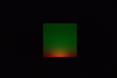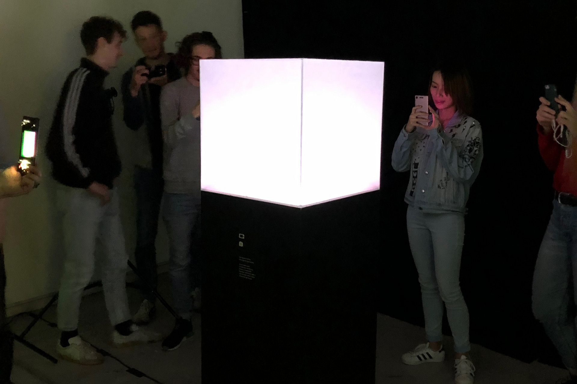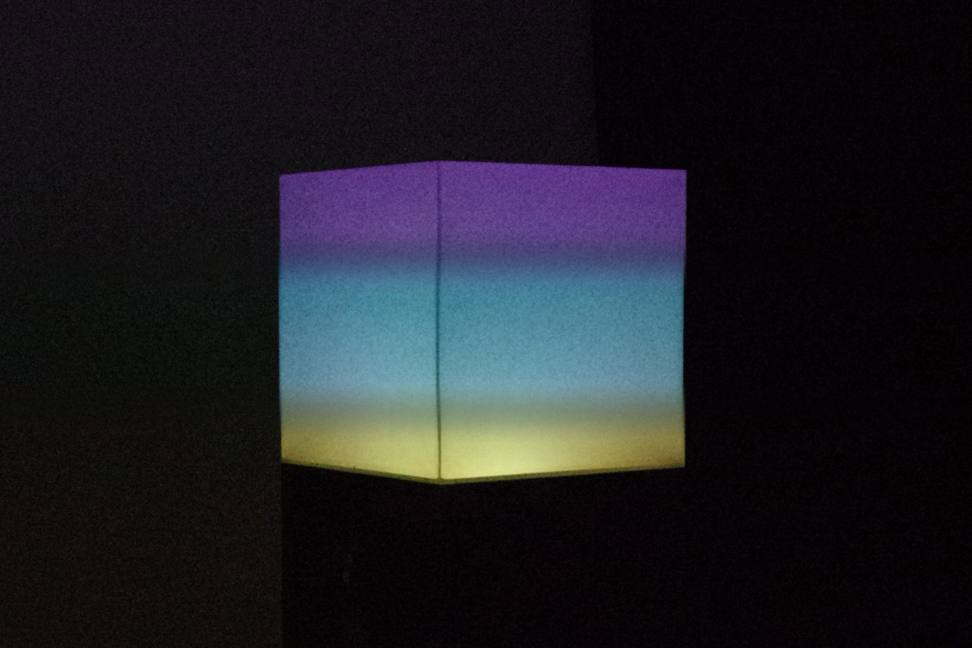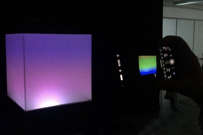 Ein Plexiglas-Würfel wird mit stroboskopischem RGB-Licht von innen beleuchtet. Die gewählten Frequenzen sind so hoch, dass die einzelnen Farben nicht sichtbar sind und der Würfel weiss erscheint. Erst beim Blick durch eine Camera werden die Ausgangsfarben und farbige Muster sichtbar.