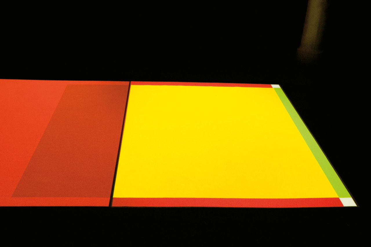 Lights of different colours pass over the pigment carpet one after another. A narrow strip on the outer edge of the white pigment surface serves as reference to indicate the colour of the projected light.
