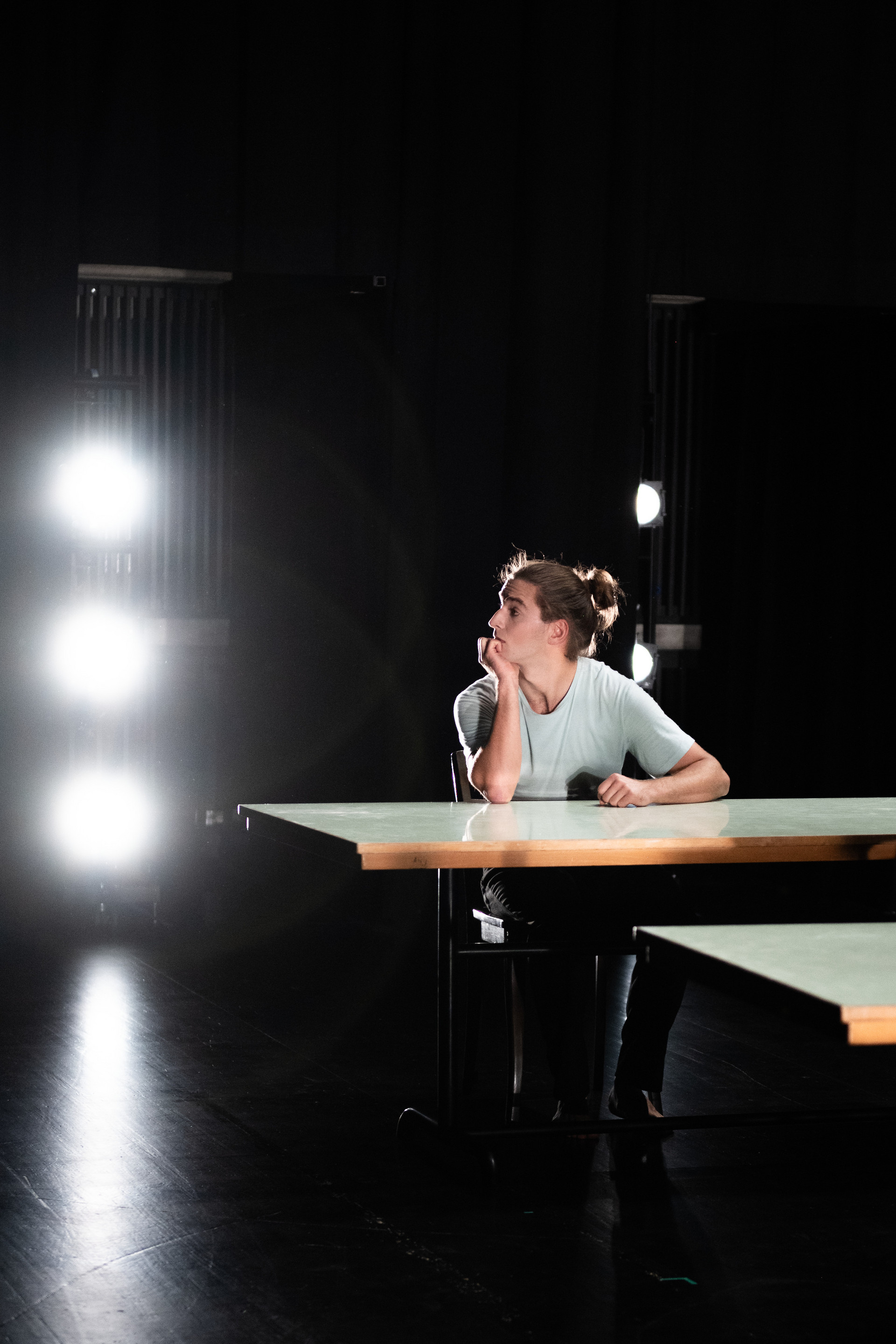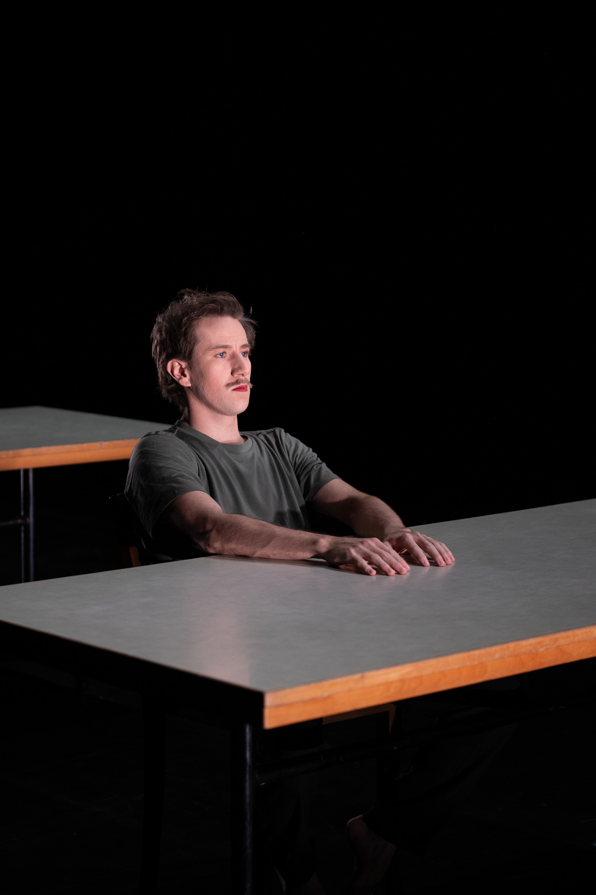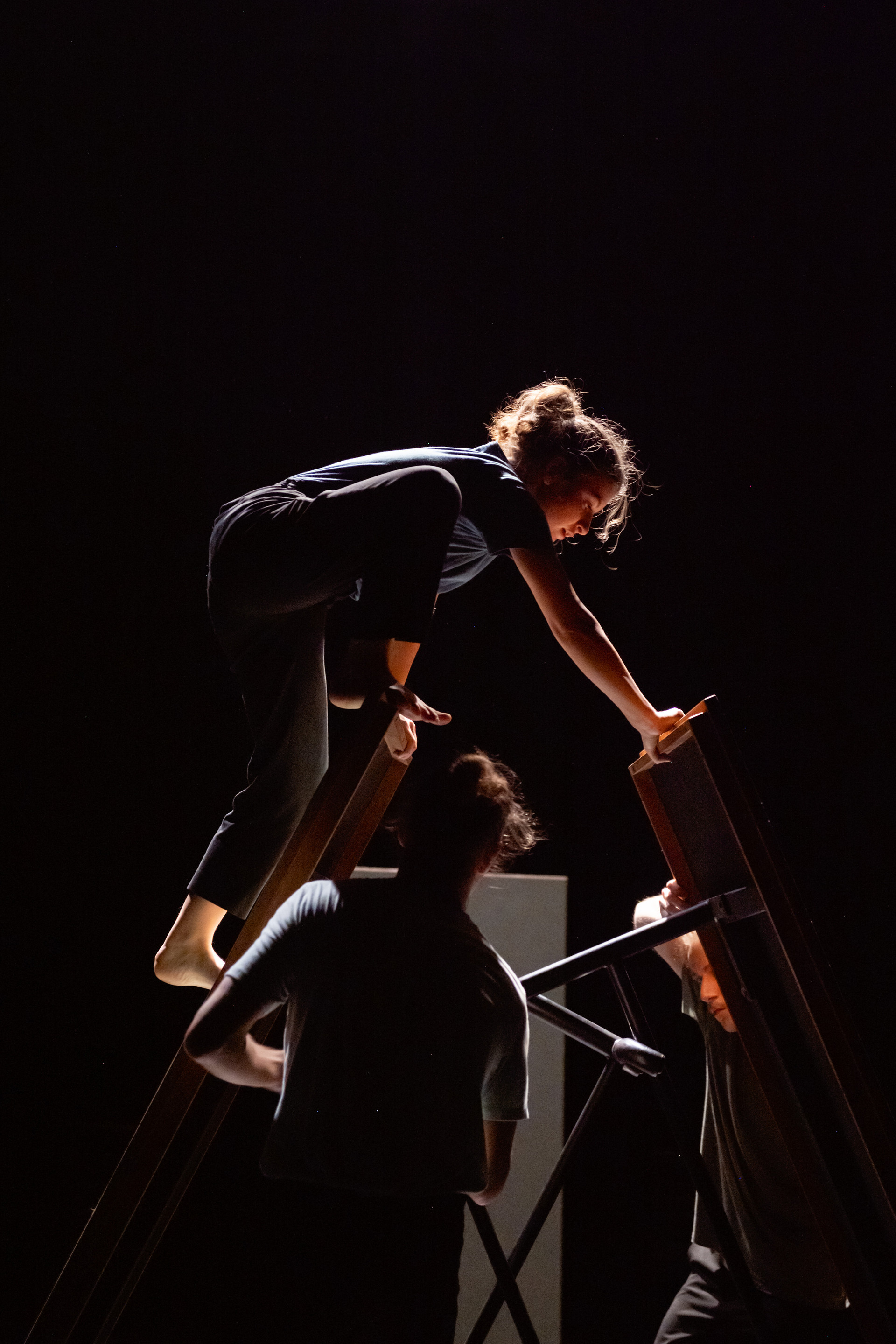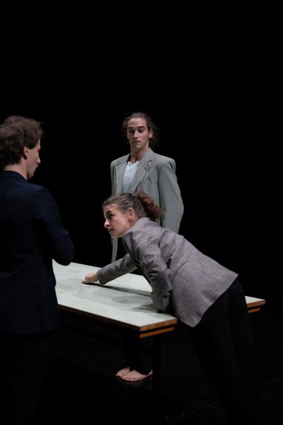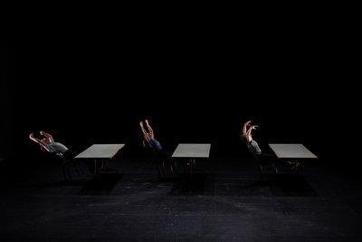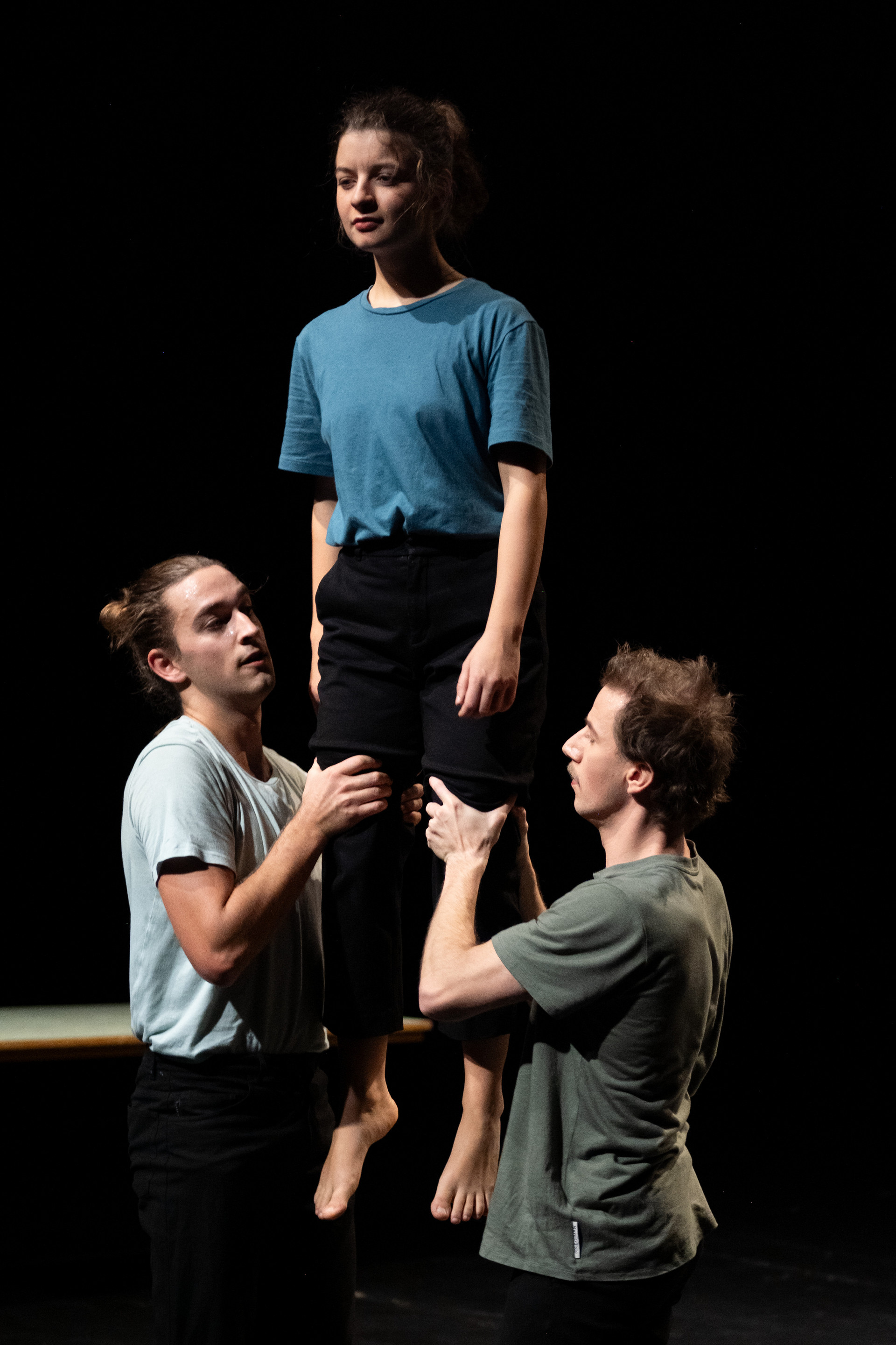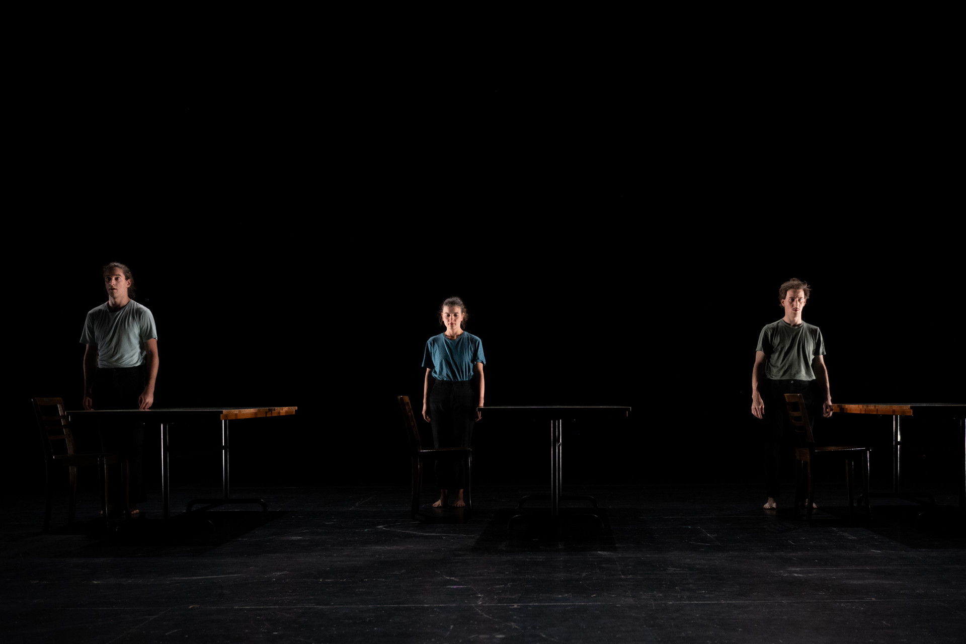 Zwischen drei Tischen und drei Stühlen erkunden drei Schauspielende die Herausforderungen des Erwachsenwerdens im Fluss dynamischer Choreografien, Akrobatik, Text und Musik.