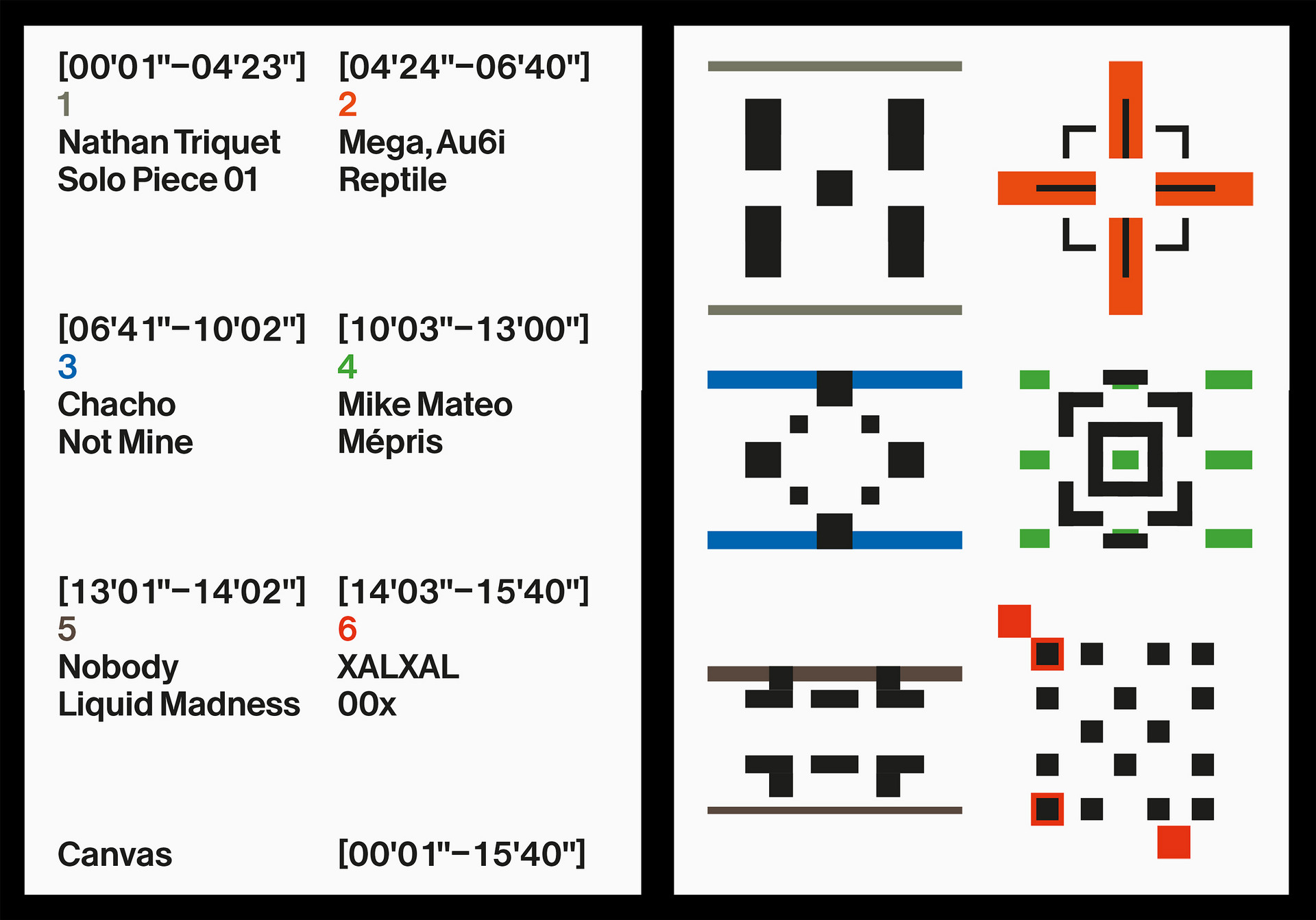 How can music be represented visually? Canvas is a project that examines this question with graphic tools, in a systematic way and in several mediums. A formal language is generated by six tracks, deciphered into a set of notes that each have their own visual code. The results are then presented as audiovisual animations, which are themselves sequenced in a publication, with the aim of displaying the rhythm and melody in printed matter and reinterpreting the musical score.