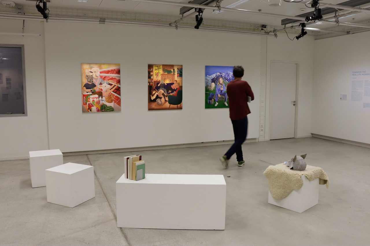 Die Bildserie Towards The Real Life Woman ist eine Interpretation des Texts Nomadic Subjects von Prof. Dr. Rosi Braidotti, der Phasen von Frauenemanzipation beschreibt. «Männliche» und «weibliche» Rollenbilder werden in den Malereien mittels Tiermetaphern dargestellt, die das Patriarchat auf die Menschen projiziert. Im Verlauf der Emanzipation streift die Frau* metaphorisch die Maske des Patriarchats ab, indem sie eine Art «Häutung» vollzieht, inspiriert vom gleichnamigen Roman von Verena Stefan.