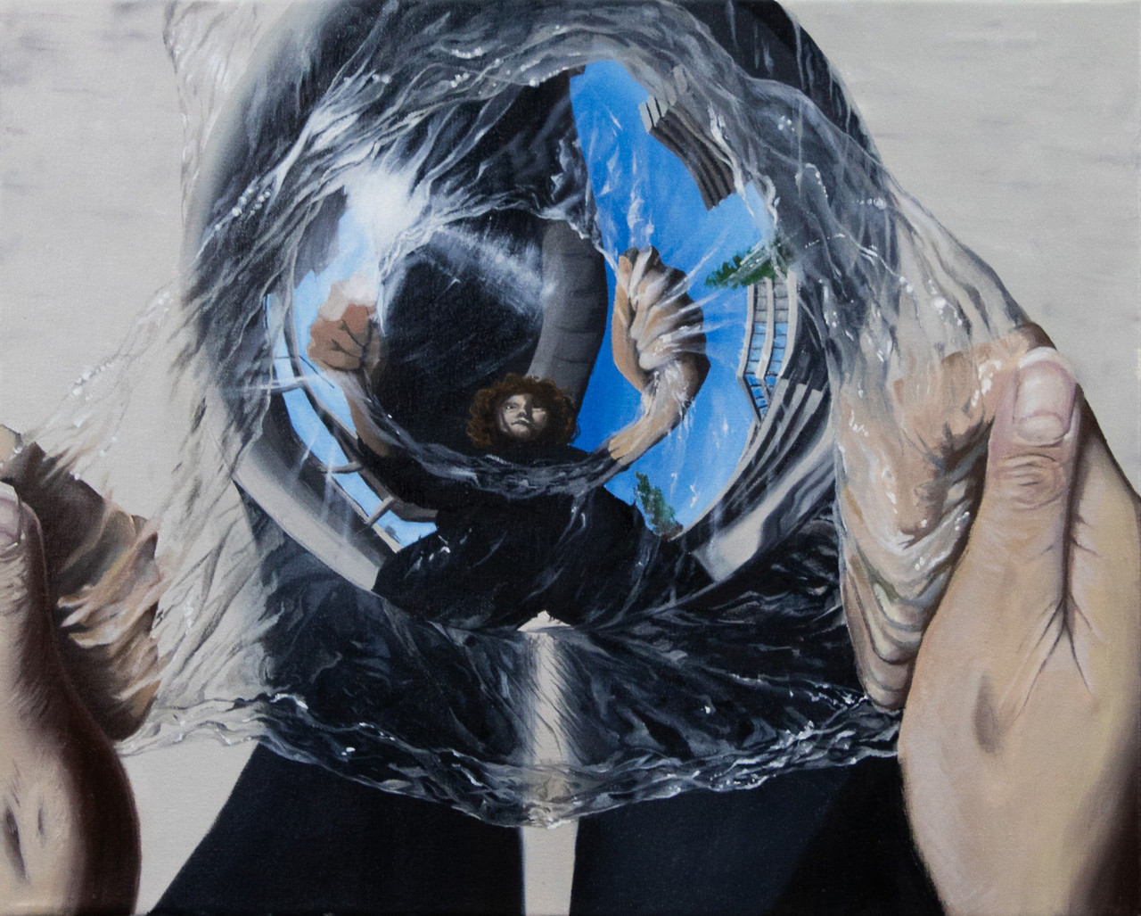 Mimikry und Imitation sind Teil des Daseins eines Menschen. Ob bewusst oder unbewusst, wir orientieren uns am Gegenüber. Wir beobachten und lernen. Wir ahmen nach. Wir bilden uns und unser Dasein durch das Synchronisieren mit Personen aus unserem Umfeld. Dies zeigt eine gewisse Abhängigkeit auf, da wir unsere Mitmenschen brauchen, um zu entdecken wer wir selber sind. Die Arbeit setzt sich malerisch mit dem Thema der Selbstwahrnehmung auseinander, die aus einer Wechselwirkung von inneren Vorgängen und äusseren Einflüssen besteht. Verzerrte Spiegelungen und diffuse Selbstportraits zeigen, dass die Empfindung des Ichs ohne Mitmenschen vage ist. Rezipient*innen sind bedeutsam und komplettieren das Werk, indem sie sich als Gegenüber wahrnehmen.