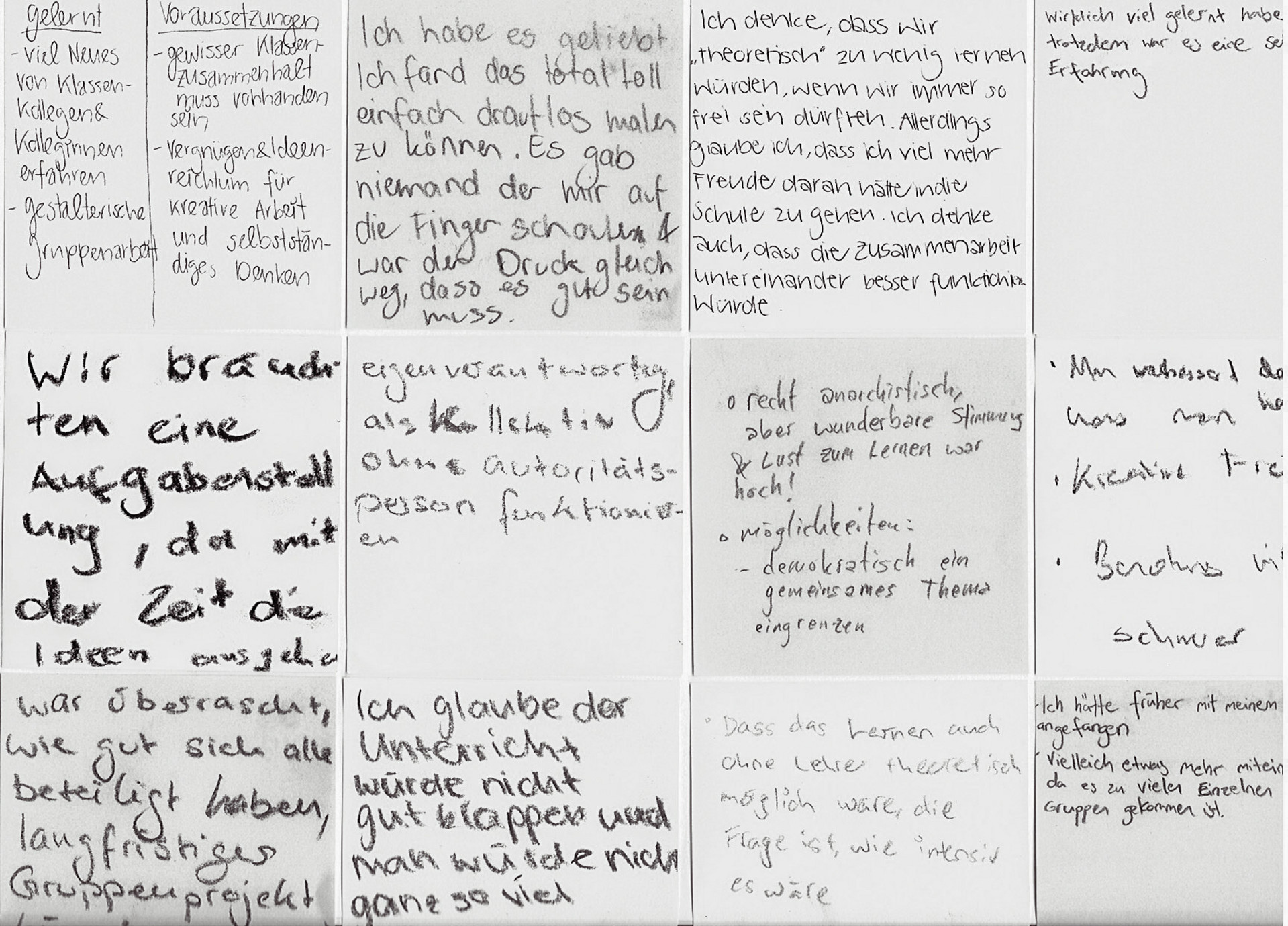 Im Rahmen eines Projekttags auf Sekundarstufe 2 versucht Noé Freuler, Handlungsformen eines «Mit-Werdens» zu initiieren, um so ihren eigenen Unterricht zu beforschen. Die Erprobung eröffnet Fragen zu hierarchischen Strukturen, Vertrauen, Verantwortlichkeiten sowie Beziehungsgefügen im Klassenzimmer. Ziel der Arbeit ist es, aus dem durchgeführten Unterrichtsexperiment und den daraus entstandenen Fragen, Reibungen und Konflikten eine konkretere Vorstellung davon zu bekommen, was «Unruhig unterrichten» voraussetzt und bedeutet.