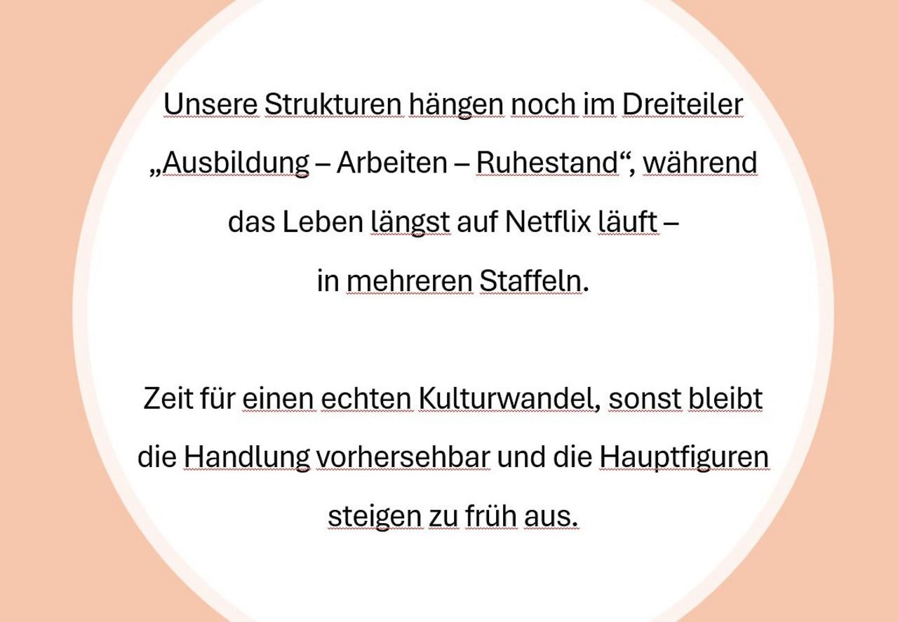 This paper addresses the change that many performance-oriented individuals over the age of 50 experience: a phase in which the search for meaning and new priorities come to the fore. How can we establish a culture in which older performance-oriented individuals continue to be recognized as an essential resource? What do these individuals need in order to continue making a valuable contribution to the world of work and society with their experience and “crystallized intelligence”? Drawing on her own experience as a former passionate career woman in middle management, the author uses a number of design methods and identifies the dimensions of ‘individual’ and “company” as key levers for bringing about effective change. Her concrete recommendations for action make it possible to shape this transition into older age as an upgrade and to promote a culture of change.