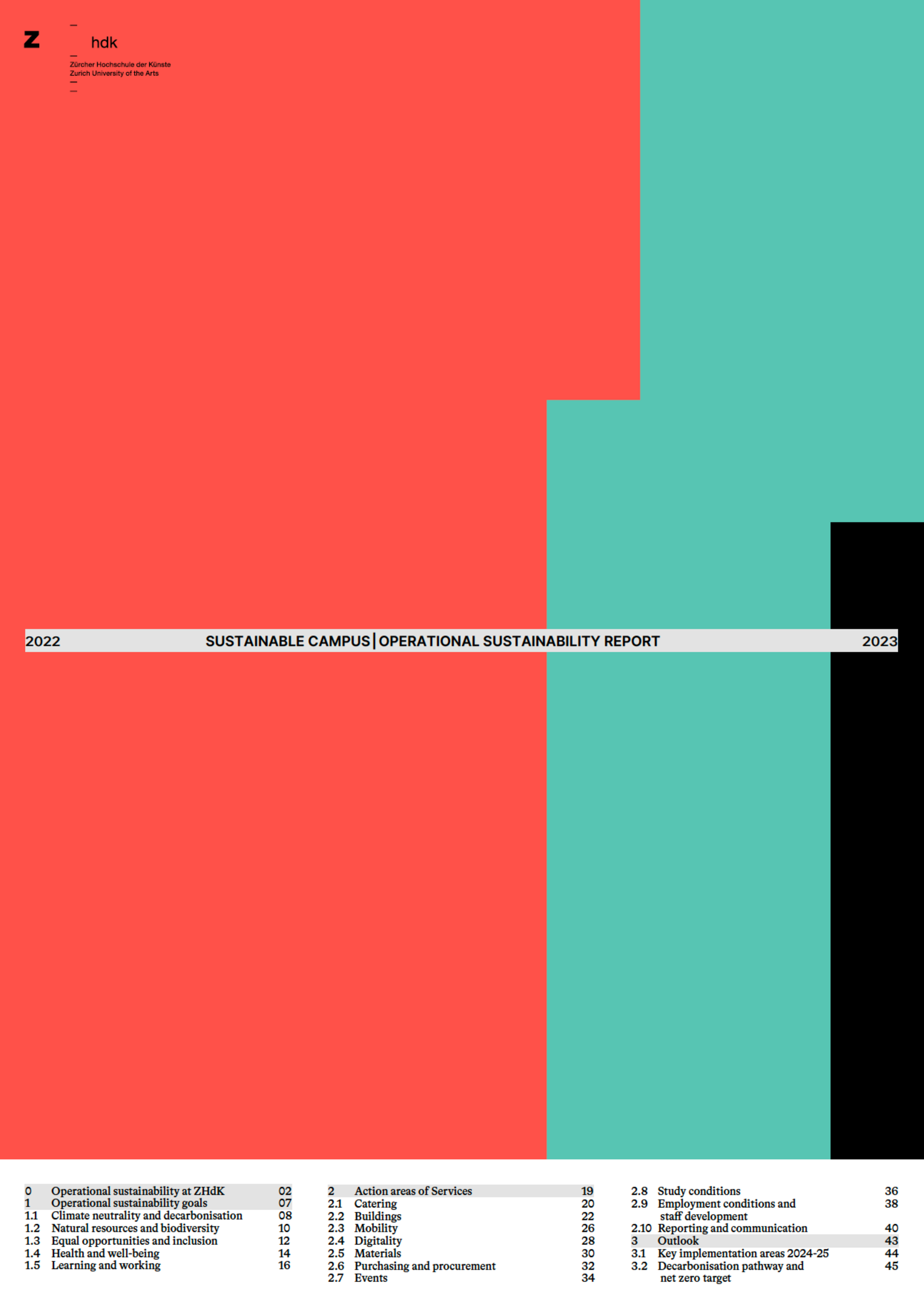 The ZHdK Sustainability Report presents relevant data, developments and opportunities for action in the context of the "Sustainable Campus" sub-strategy, including ZHdK’s eco-balance. The report is published every two years and is continually developed.