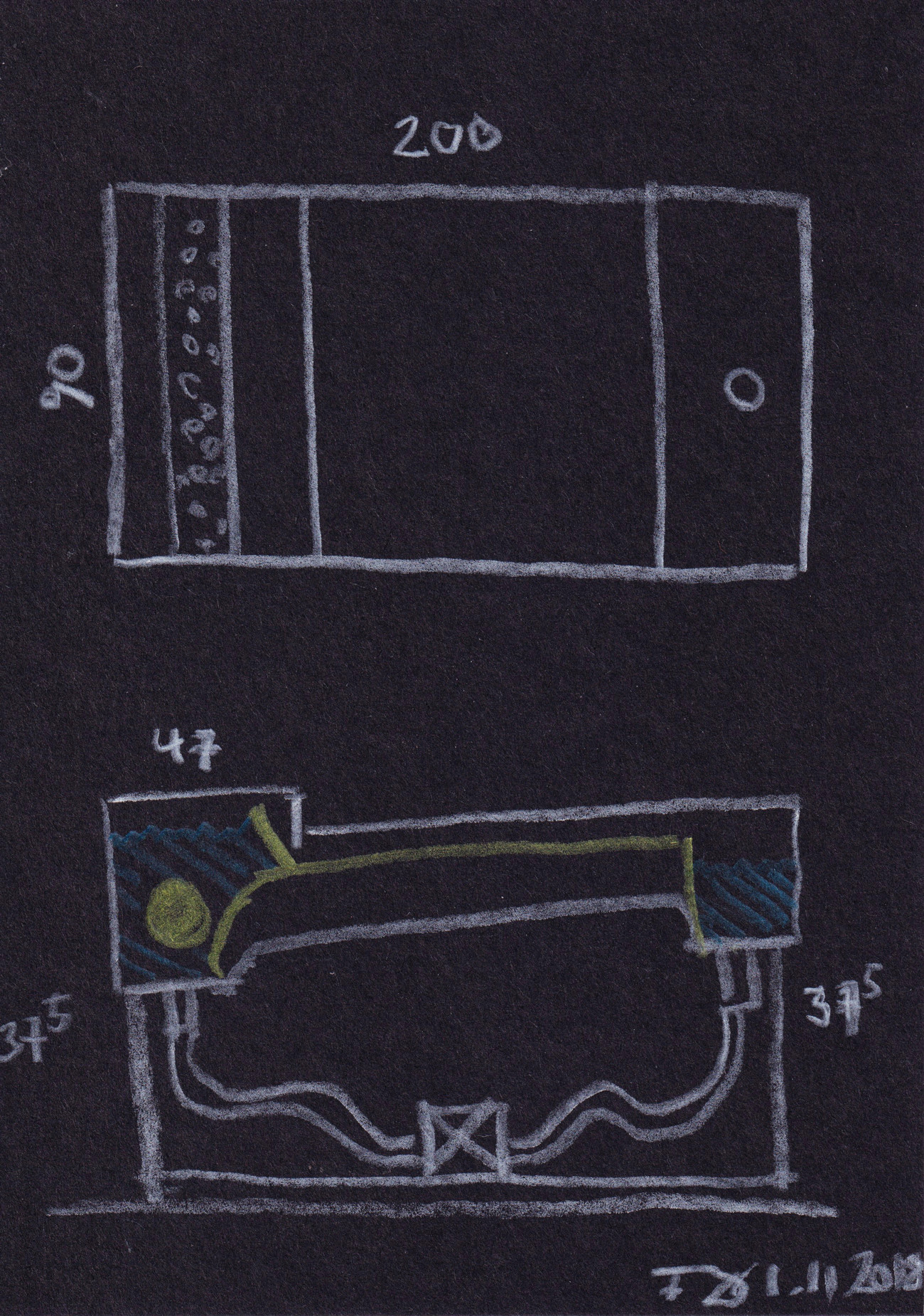 Wenn die Zeit schneller verfliesst, als sich der Schall ausbreitet, dann verhält sich die Luft wie eine Flüssigkeit. Die Skulptur Water Table (2018) von Florian Dombois erlaubt die Interaktion mit dem Flow und das Studium seiner Verwirbelung. Der Tisch ist 90 x 200 cm gross und an seinem Kopfende erhöht ein Schleusenbrett den Wasserspiegel, bevor das Wasser über eine Glasplatte von rund 90 x 100 cm dahinschiesst.