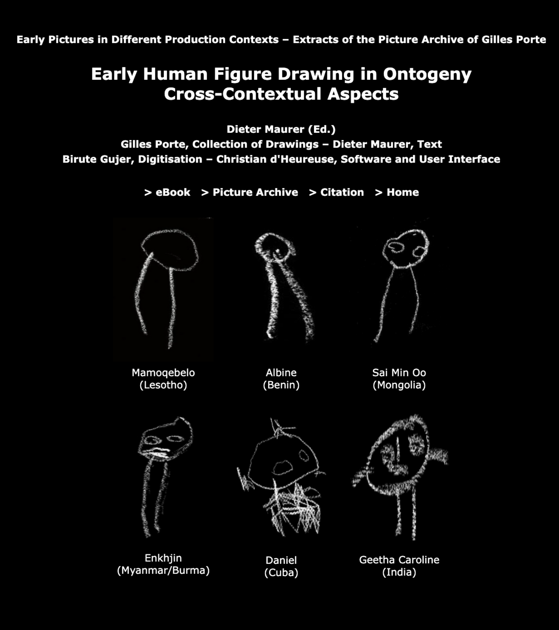 Since 2005, from all over the world, the artist Gilles Porte is documenting drawings of the human figure, created by children in their first years of life in terms of selfportraits. Having observed a cross-contextual structure of early pictures in ontogeny in our own investigation, when for the first time looking at the drawings Gilles Porte has brought back from his journey, we felt that these drawings carry a scientific value and can substantially contribute to clarify the relation between the early graphic qualities or drawings models and the concrete context of picture production.