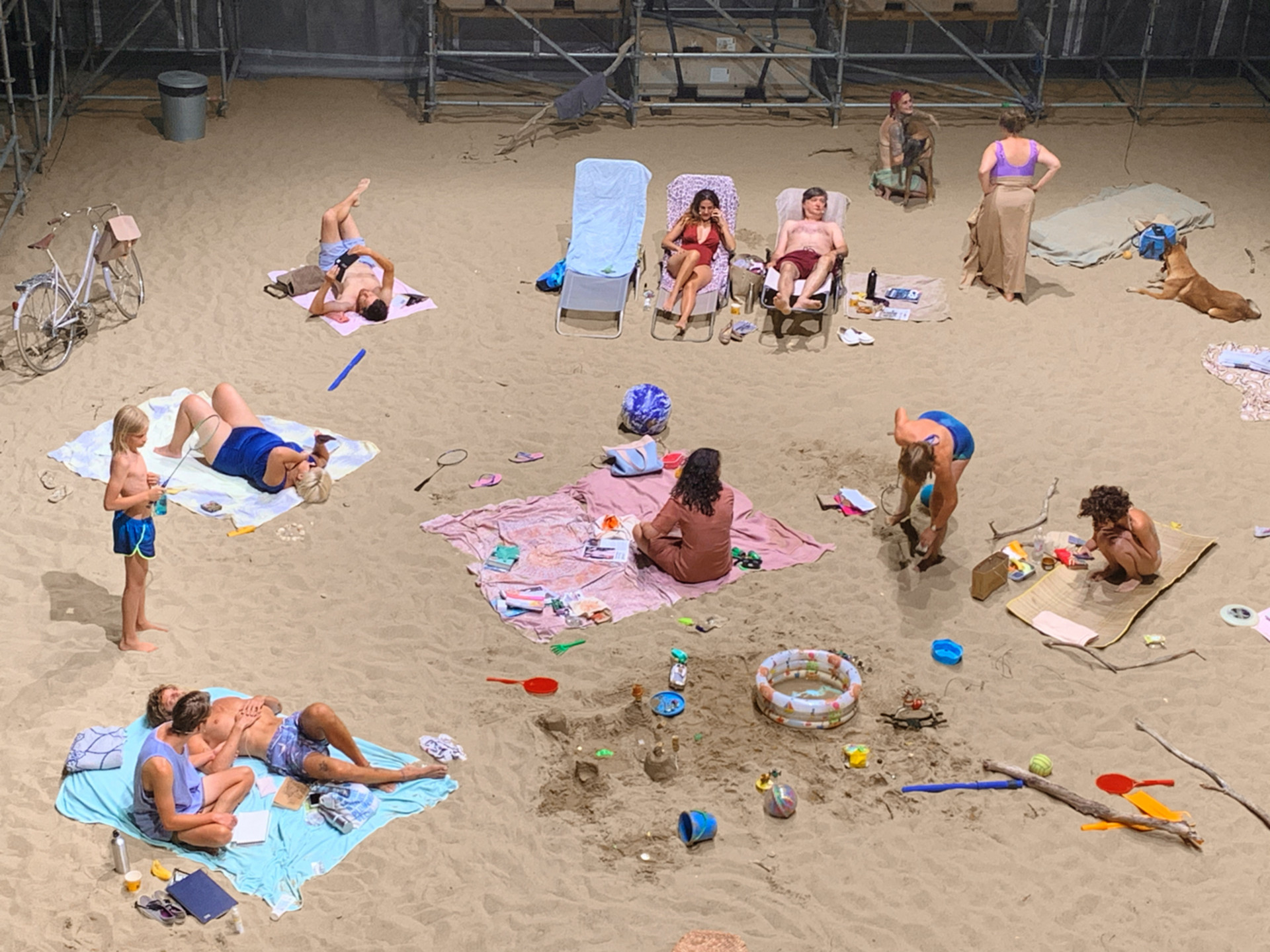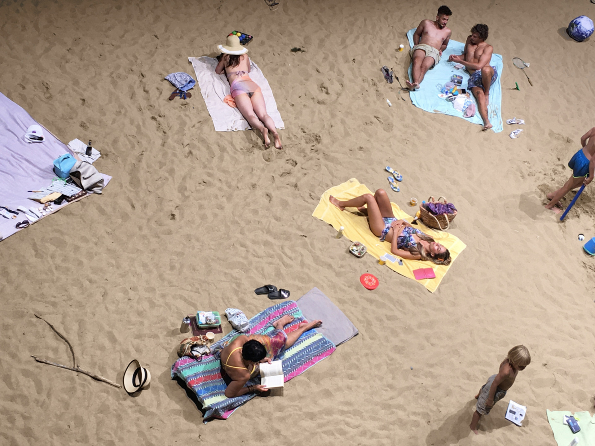 Ich finde mich also um 16 Uhr im Statist*innen Eingang ein, vorerst noch ziemlich alleine. Mein Bikini wird kurz gesichtet, ausserdem bekomme ich ein Handtuch, Flip-Flops und einen riesigen Hut ausgehändigt. Ich könne jederzeit raus, schwimmen im See, auf die Toilette gehen oder Getränke und Snacks holen, die ich auch gerne zurück an den Strand bringen dürfe. Ansonsten lesen, Badminton spielen, schlafen, aber auch Handy, Kopfhörer und Laptop dürfen benutzt werden. Nur nicht flüstern – wenn reden, dann in normaler Lautstärke. Ich soll einfach das machen, was ich auch sonst am Strand machen würde.