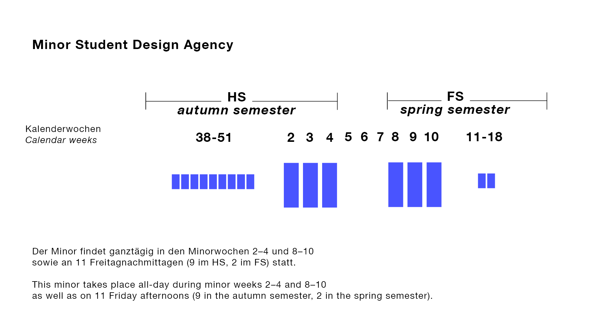 Der «Student Design Agency» Minor steht allen Bachelor-Studierenden der ZHdK offen und empfiehlt sich für Studierende aller Majors im Bachelor Design, die ein grosses Interesse mitbringen, in interdisziplinären Designteams an Kundenaufträgen zu arbeiten. Spezifische Zugangsvoraussetzungen für den Minor werden per Selbstdeklaration abgefragt.