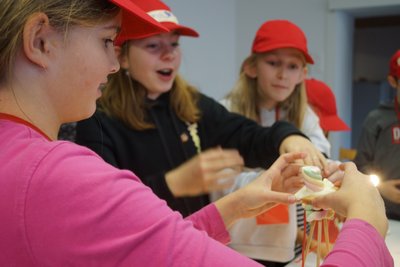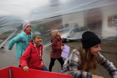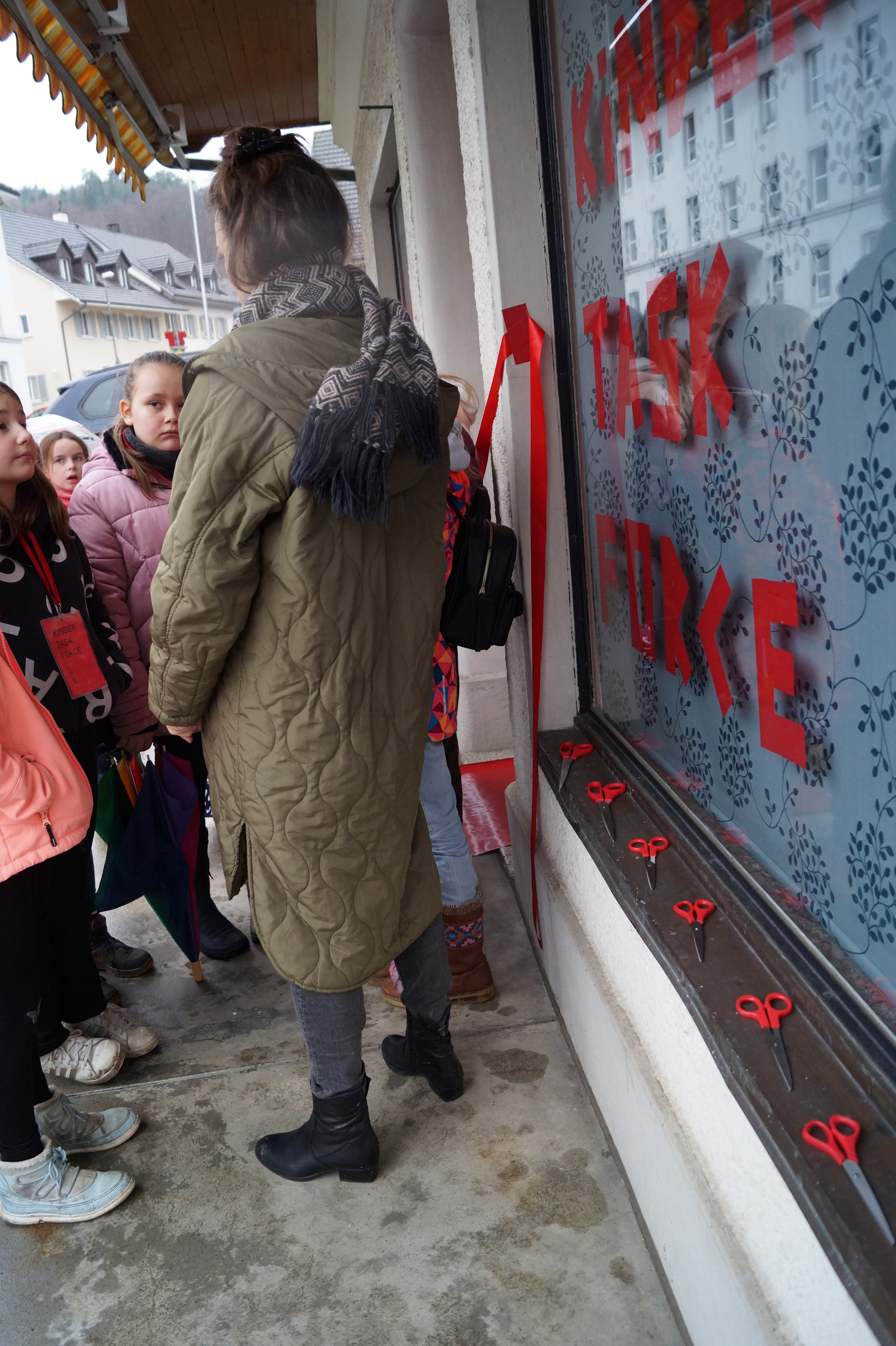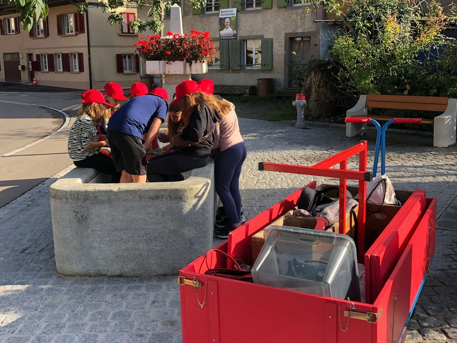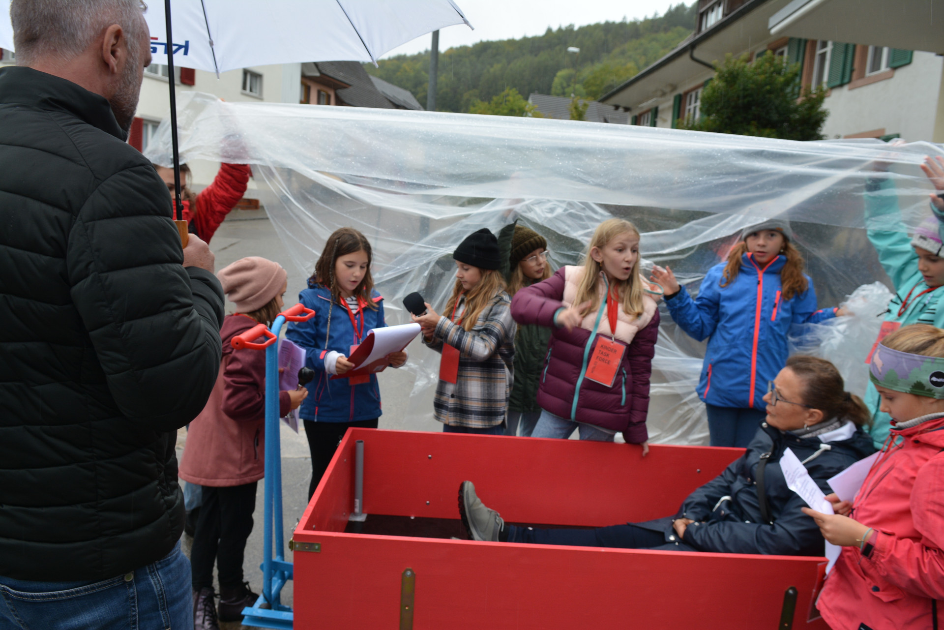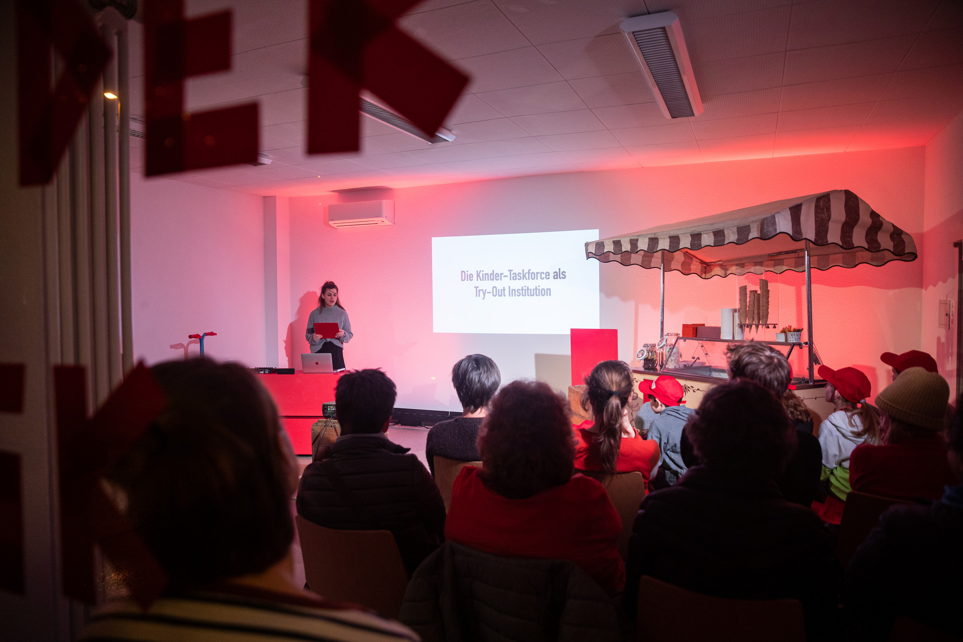 Die Kinder-Taskforce versammelt sich und bewegt sich mit einem grossen, roten Wagen, der jederzeit in eine Denkzentrale verwandelt werden kann, durchs Dorf. Mit dieser mobilen Szenografie nimmt die Kinder-Taskforce Plätze im öffentlichen Raum ein und untersucht, wo Kinder im Dorf mitgedacht werden und wo nicht. In performativen Anlagen treffen die Kinder auf die bestimmenden Erwachsenen und führen Dialoge, die bis dahin nicht geführt wurden.
