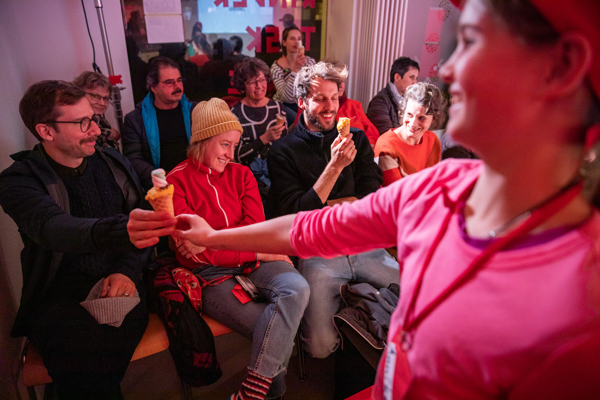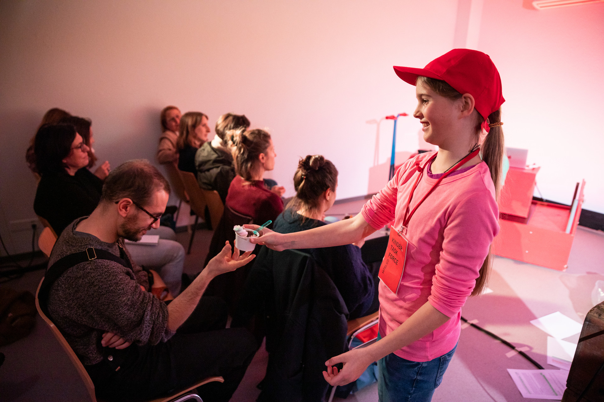 Im Kinder-Café werden die Kinder zu Gastgeber*innen des Show&Tells und bestimmen, wer der Erwachsenen im Publikum wieviel Glace bekommt. Mit klebrigen Fingern hören diese von Adultismus, Try-Out Institutions, gegenhegemonialen Interventionen, Utopien und den kleinen und grossen Bewegungen, die die Kinder-Taskforce in Gang gesetzt hat.