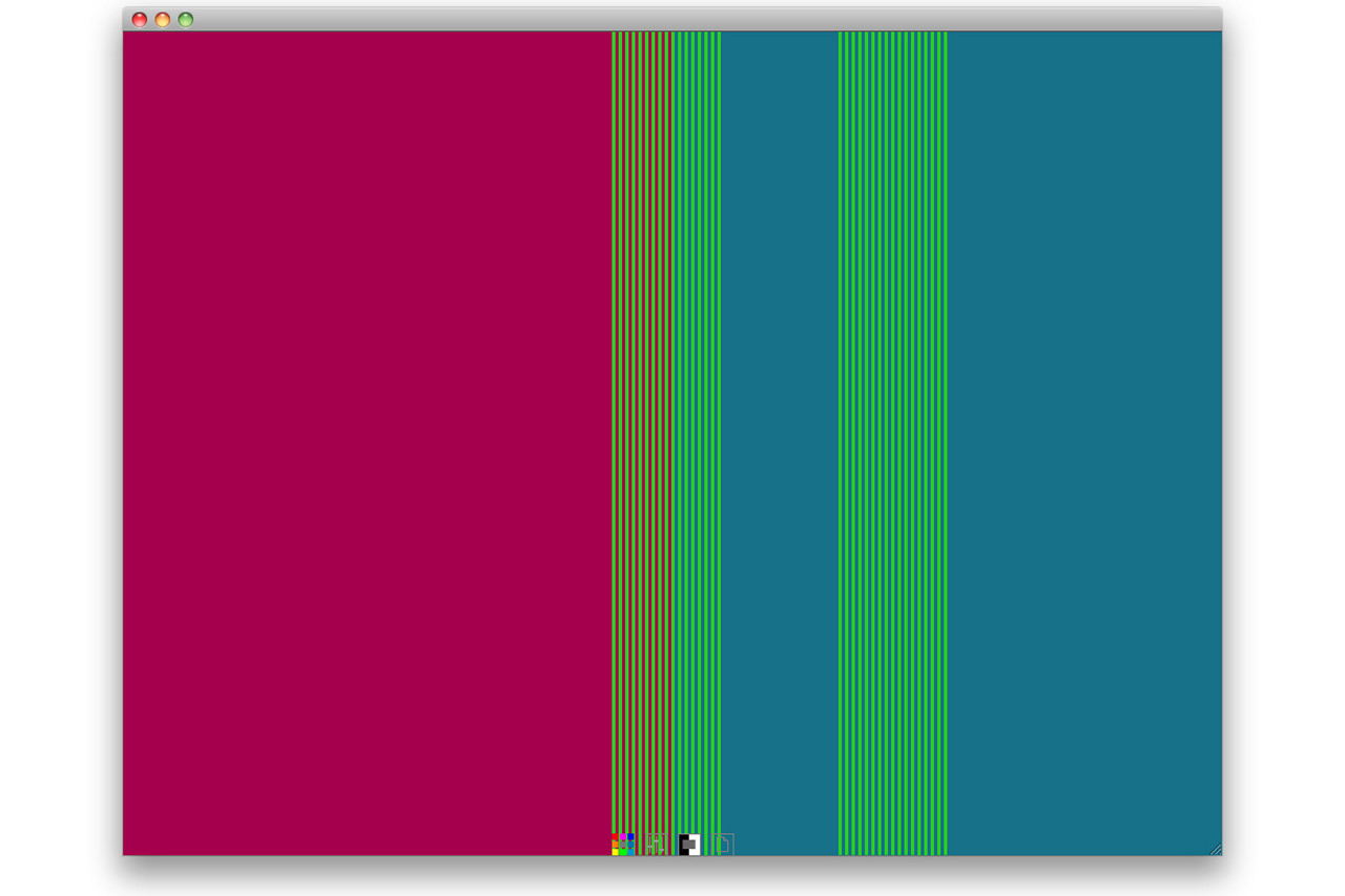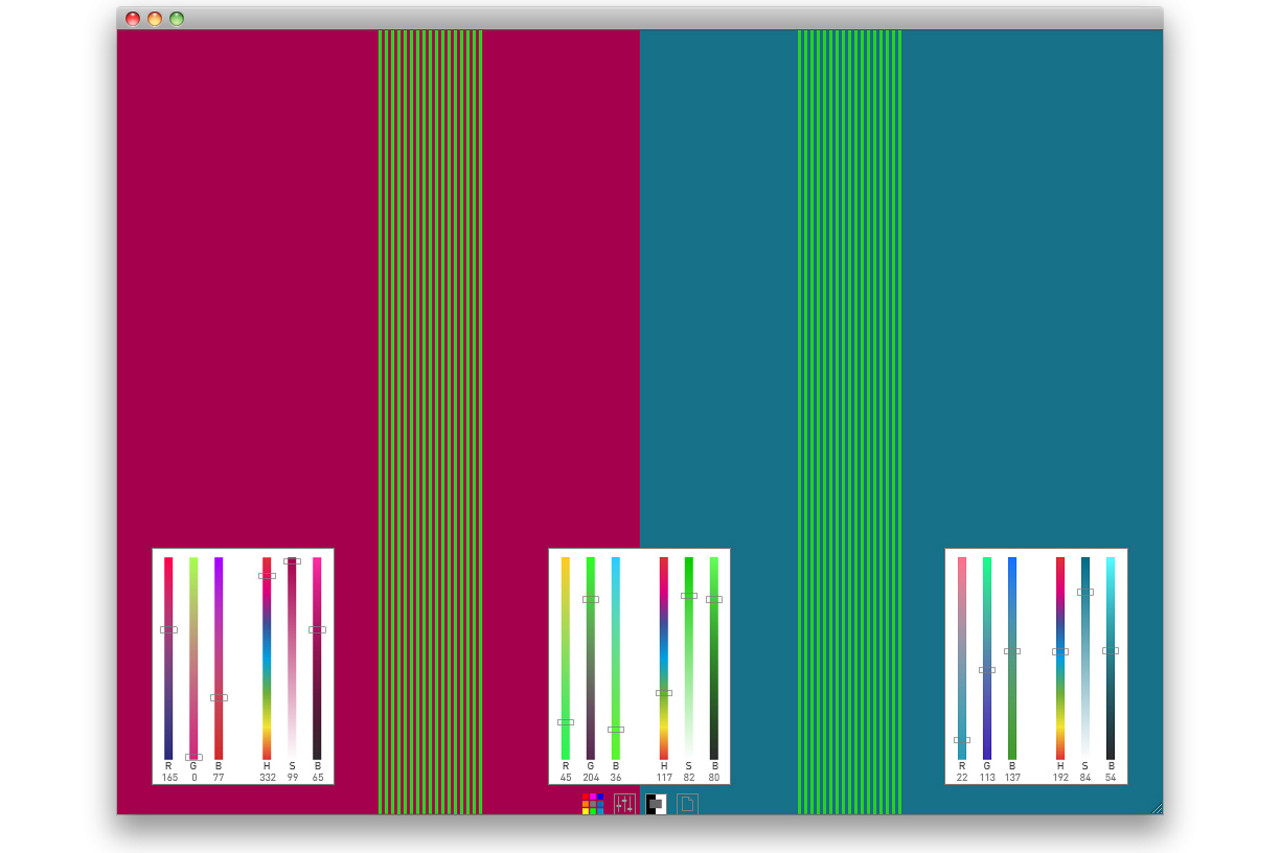 Der Computerbildschirm ist hierfür in zwei unterschiedliche Flächen unterteilt, deren Farben man interaktiv verändern kann. Innerhalb der beiden Farbflächen befindet sich zusätzlich je eine Gruppe gleichfarbiger Längsstreifen, die man davon unabhängig ebenfalls farblich verändern kann.