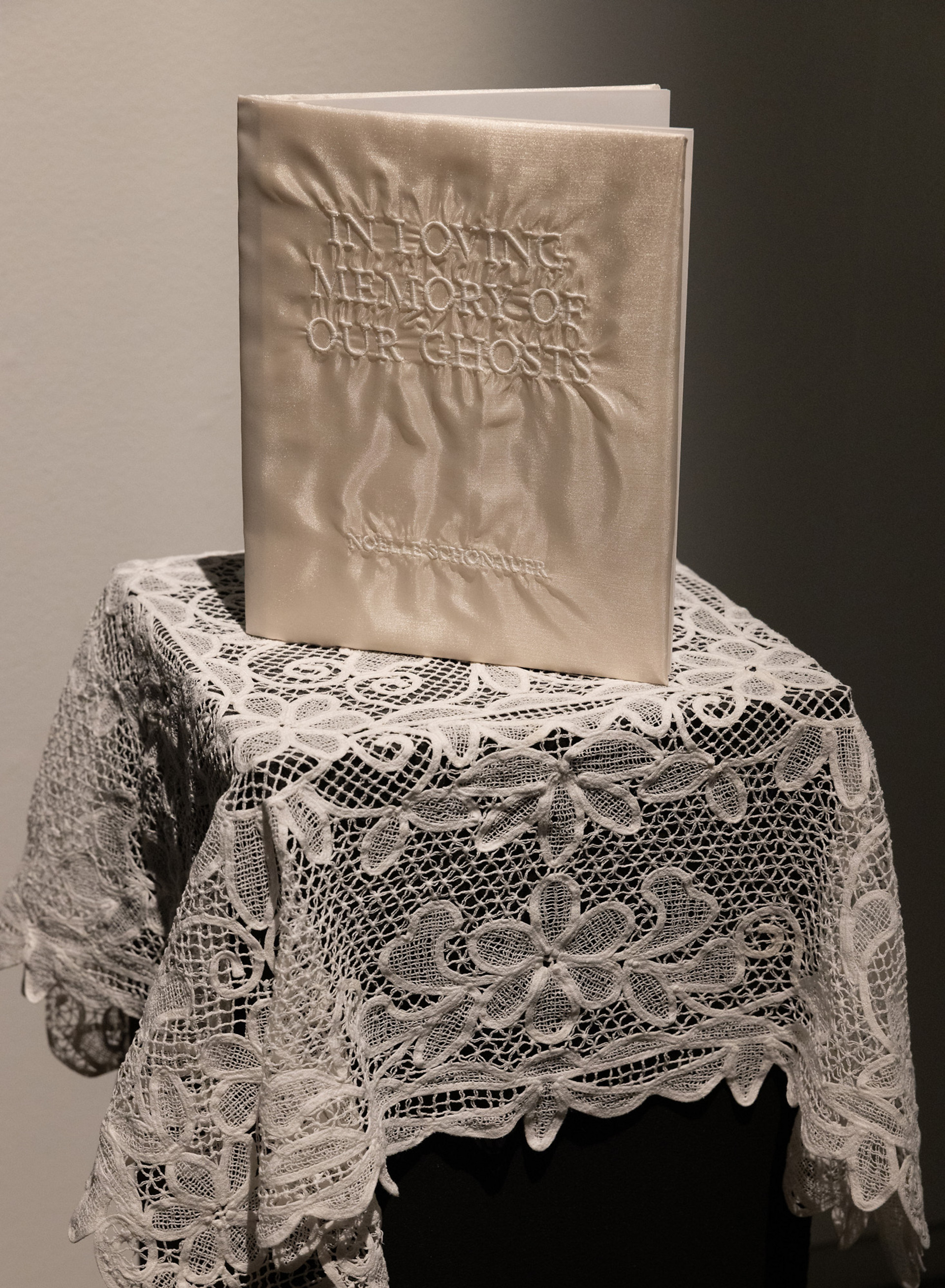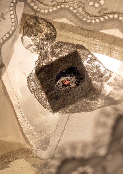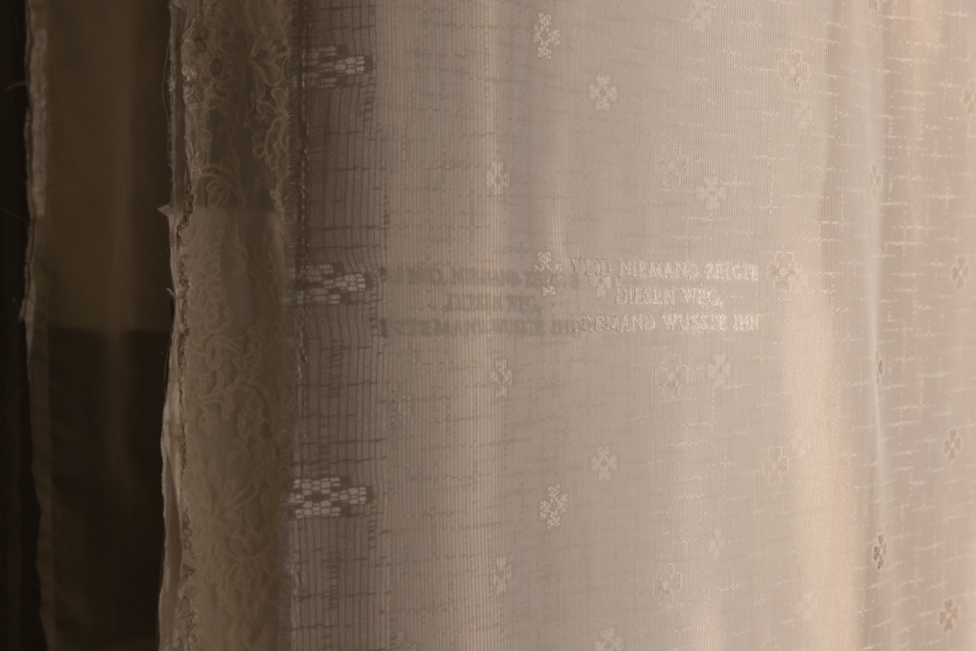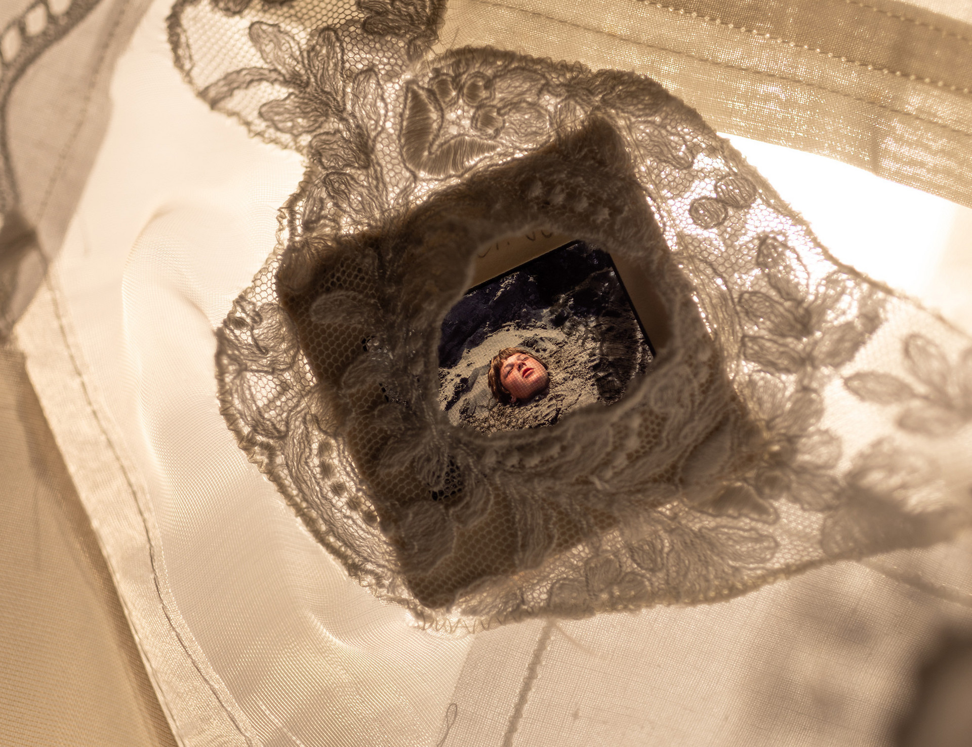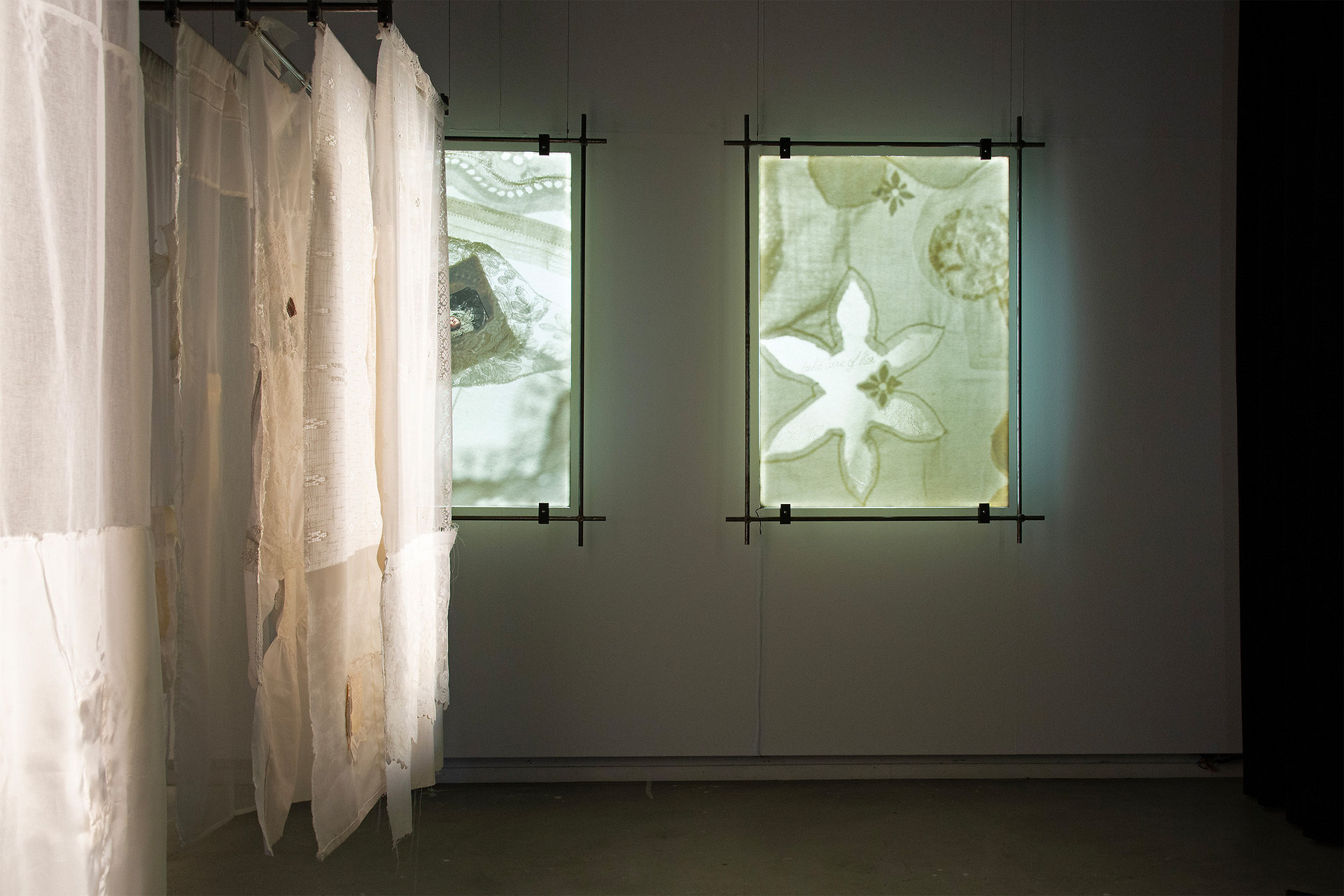 Im Dialog zwischen Vergangenheit und Gegenwart verbindet die Künstlerin Bildmaterial ihrer eigenen Familiengeschichte mit sakraler Bildsprache. Glaubensfragen sind fester Bestandteil ihrer Herkunft und sorgen, seit sie sich erinnern kann und darüber hinaus, für machtvolle Leitsätze. Die Installation zeigt die Zusammenhänge und Gegensätze ihrer Geschichte auf und verweist auf tiefere Verbindungen zwischen individueller Biografie und kollektiven menschlichen Erfahrungen.