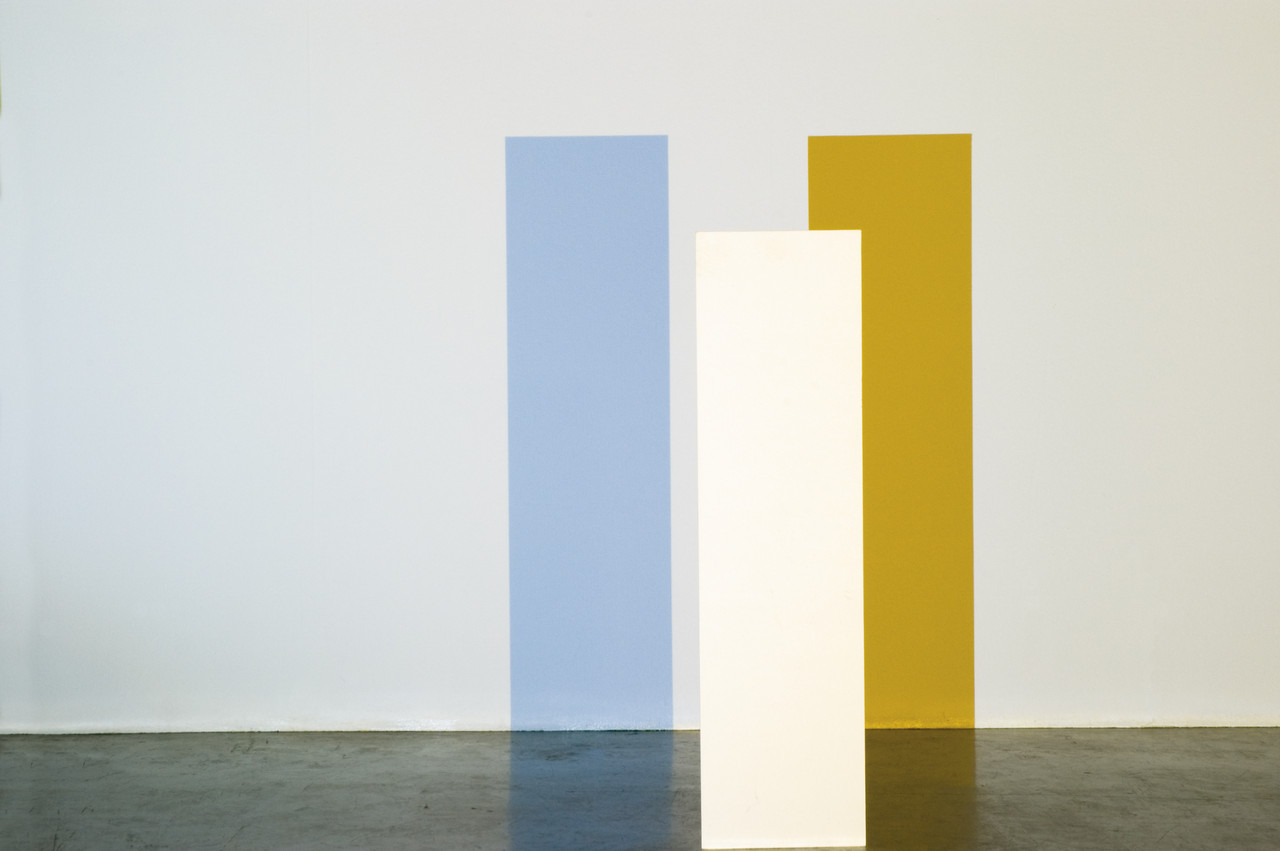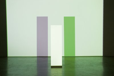 Die Installation Schattenfarben besteht aus zwei Beamern, deren Lichtstrahl von schräg links respektive von schräg rechts auf eine Wand fällt. Auf der Wand addiert sich das Licht zu einem helleren Farbton.