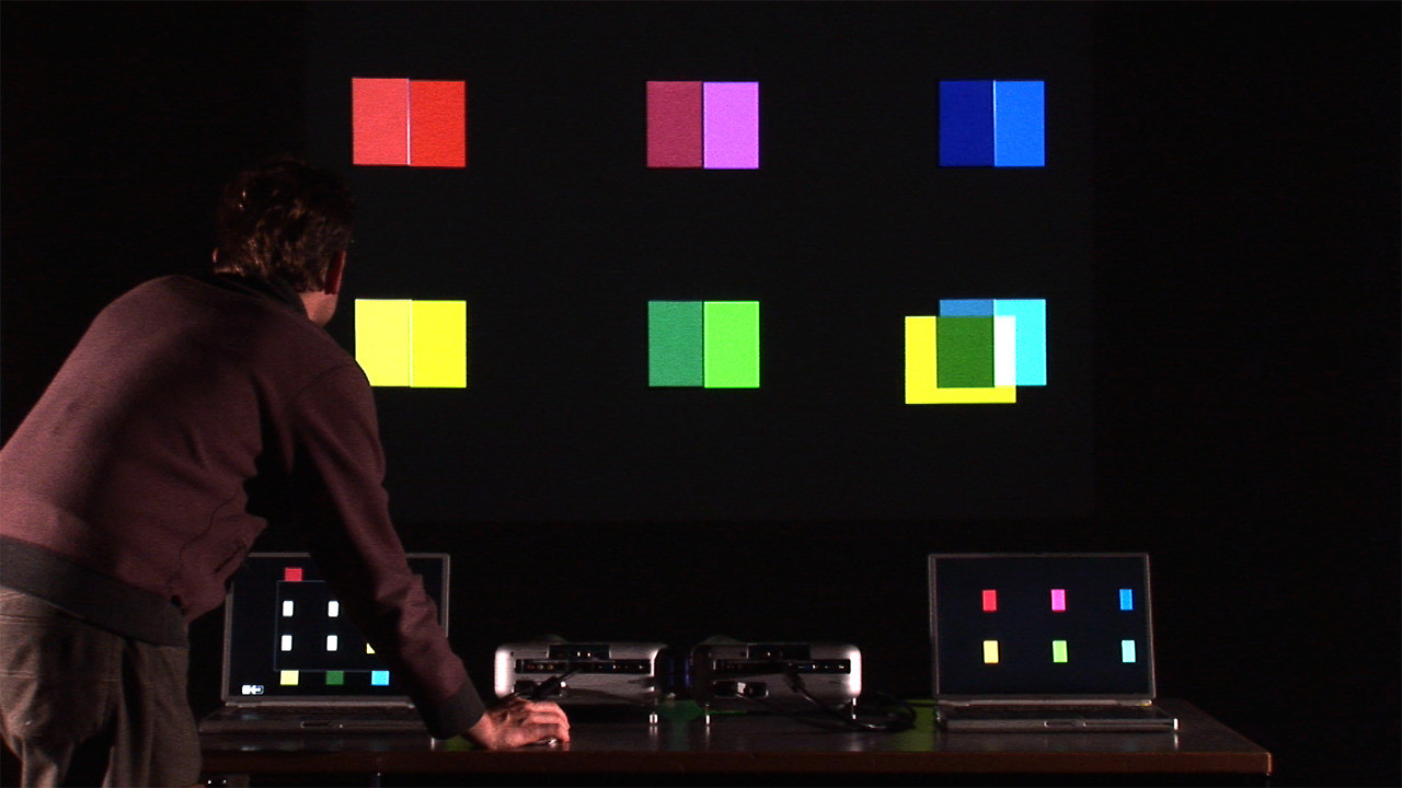 Bewegt man am Bildschirm eines dieser farbigen Rechtecke in den gemeinsamen Projektionsbereich, so wird dieses an die entsprechende Stelle an der Wand projiziert. Überlagert es eines der vom anderen Beamer projizierten, farbigen Rechtecke, entsteht eine additive Farbmischung. Bewegt man ein farbiges Rechteck über eine Farbkarte, wird das weisse Licht durch das farbige ersetzt, sodass subtraktive Farbmischungen entstehen. Wird z.B. das cyanfarbige Rechteck über die magentafarbige Karte bewegt, so erscheint der überlagerte Teil blau.