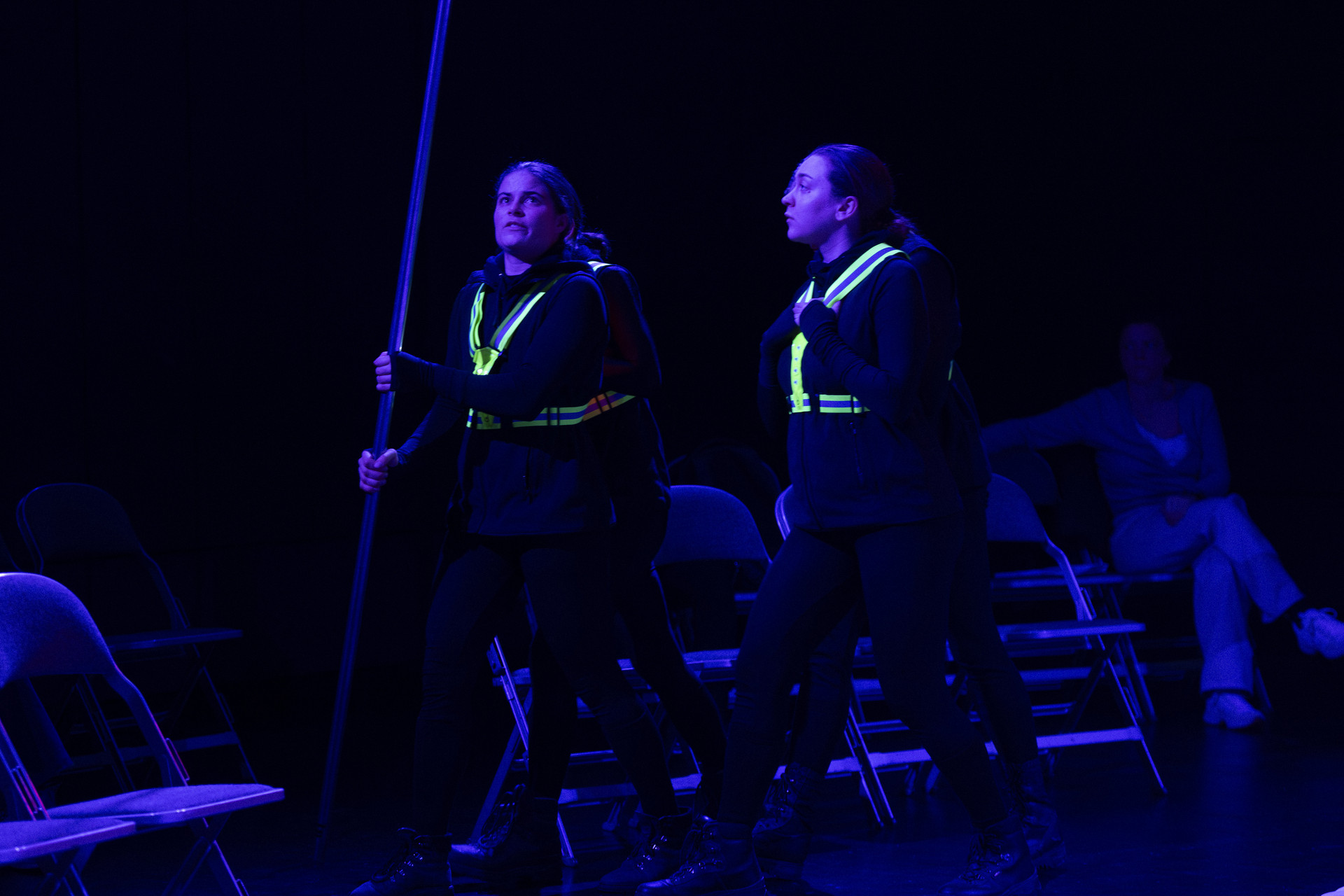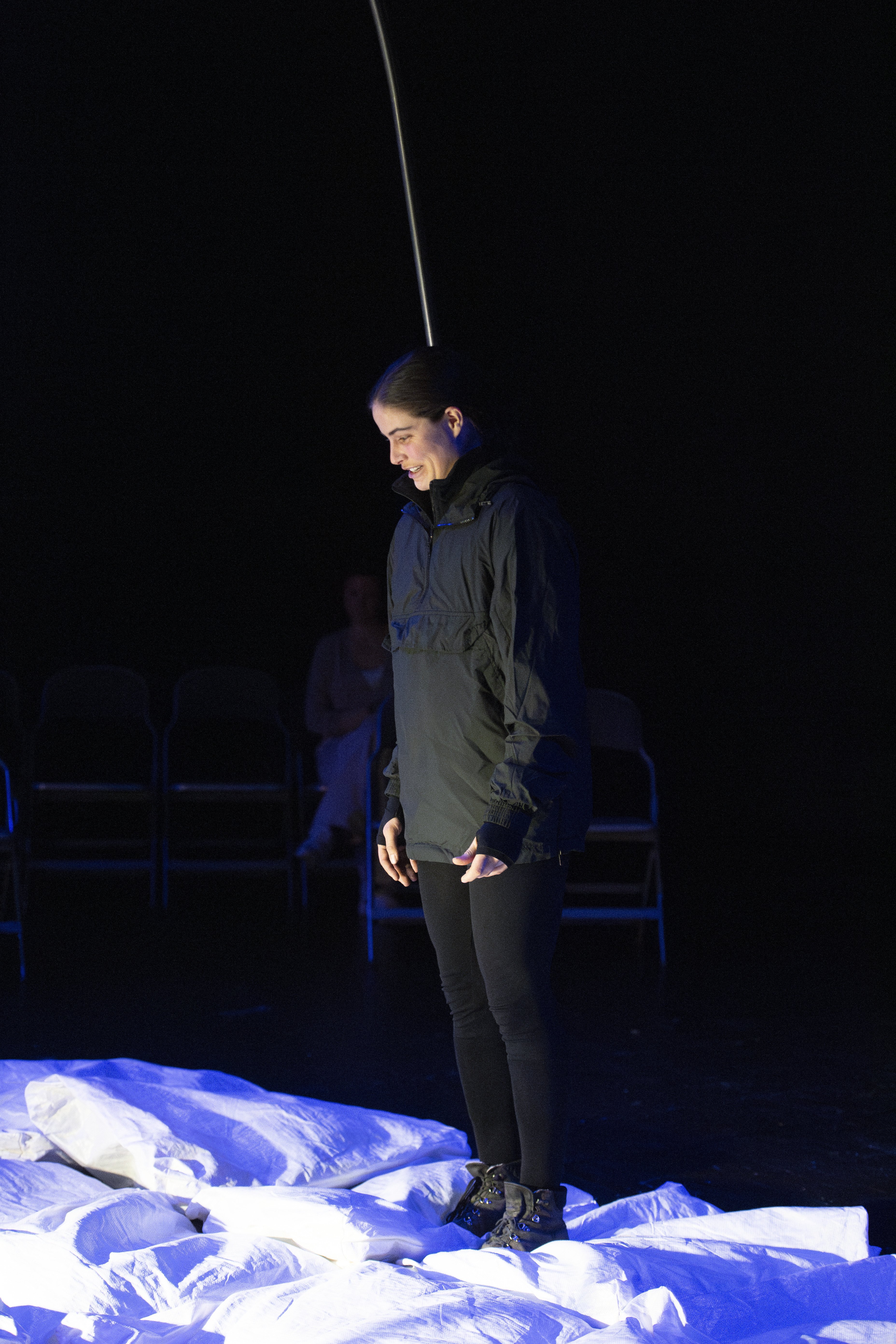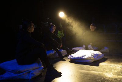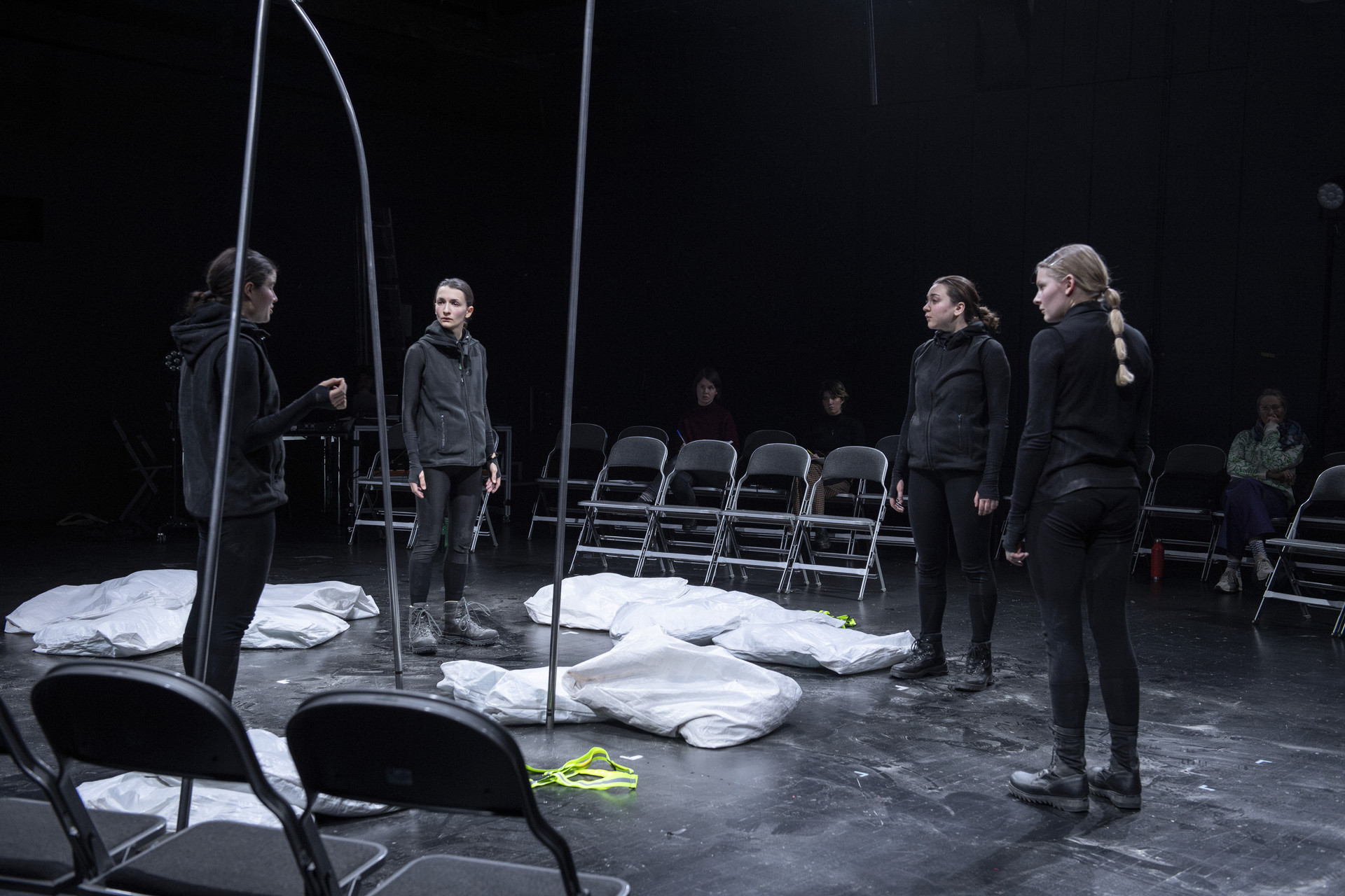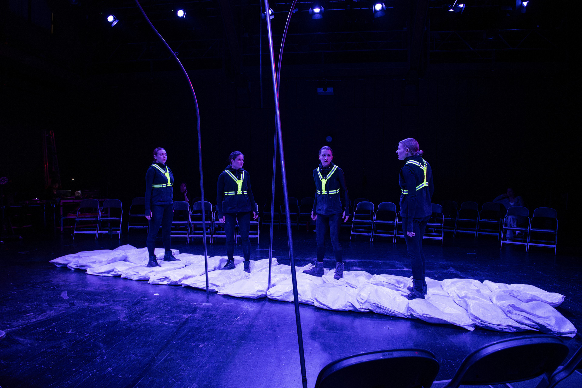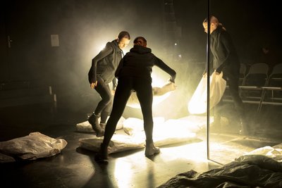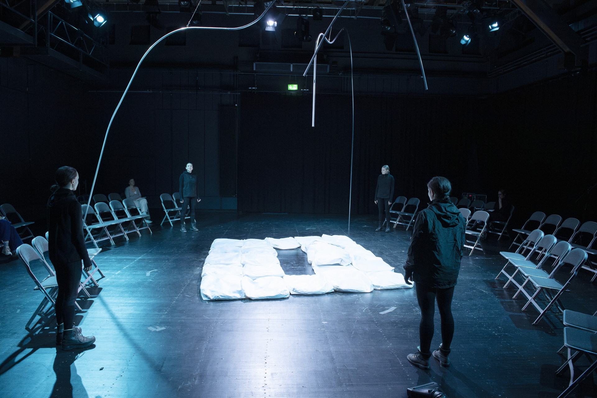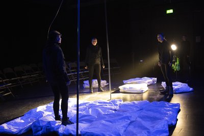 In unserer Inszenierung sind die Ereignisse aus dem Stück längst vergangen. Der Schneesturm beschwört die Arbeiter und den Ingenieur wieder herauf. Können sie sich jetzt einander verletzlich zeigen, in ihrer Schuld und in ihrer Sehnsucht?