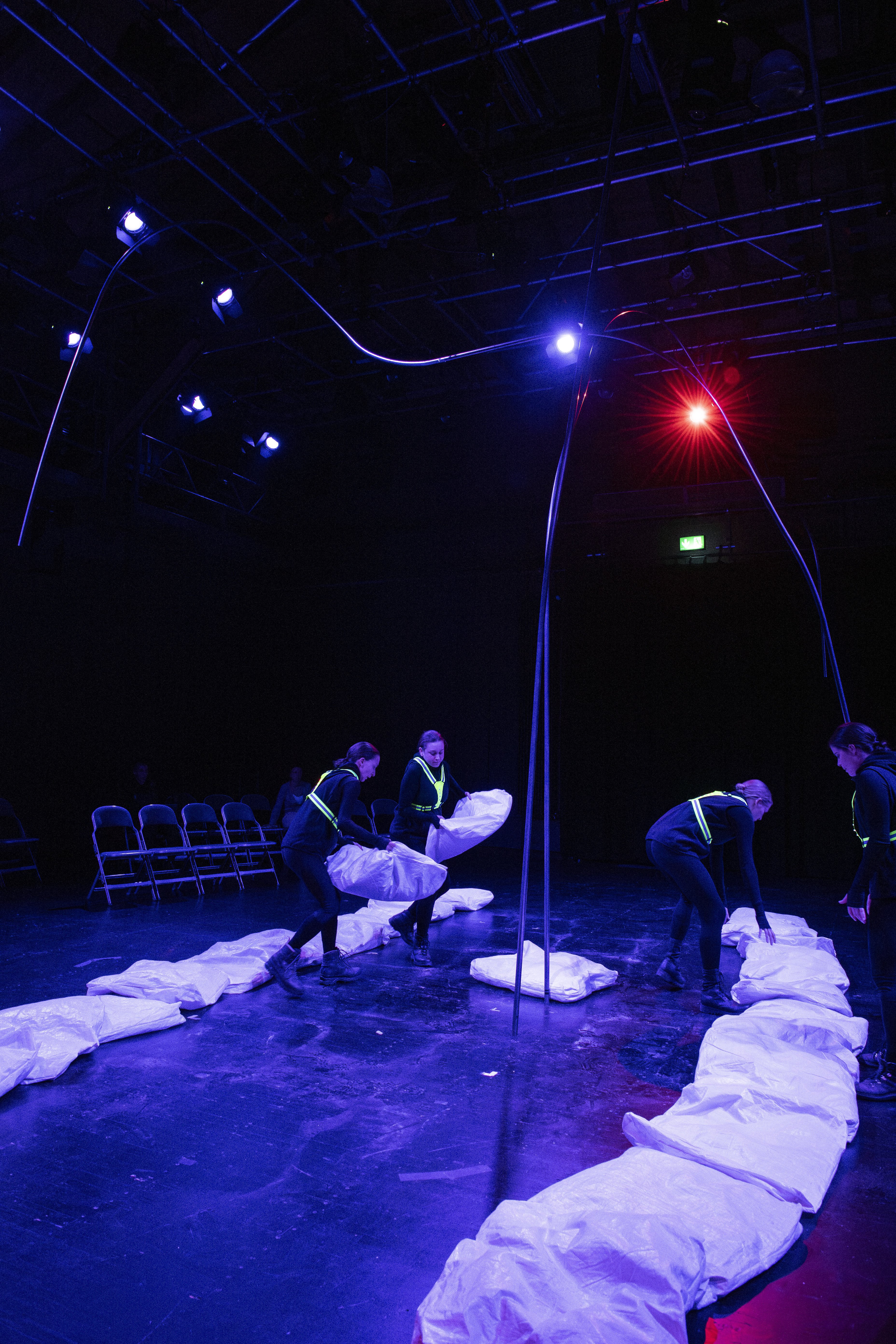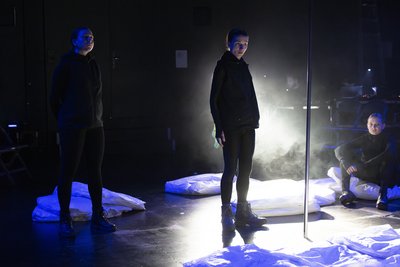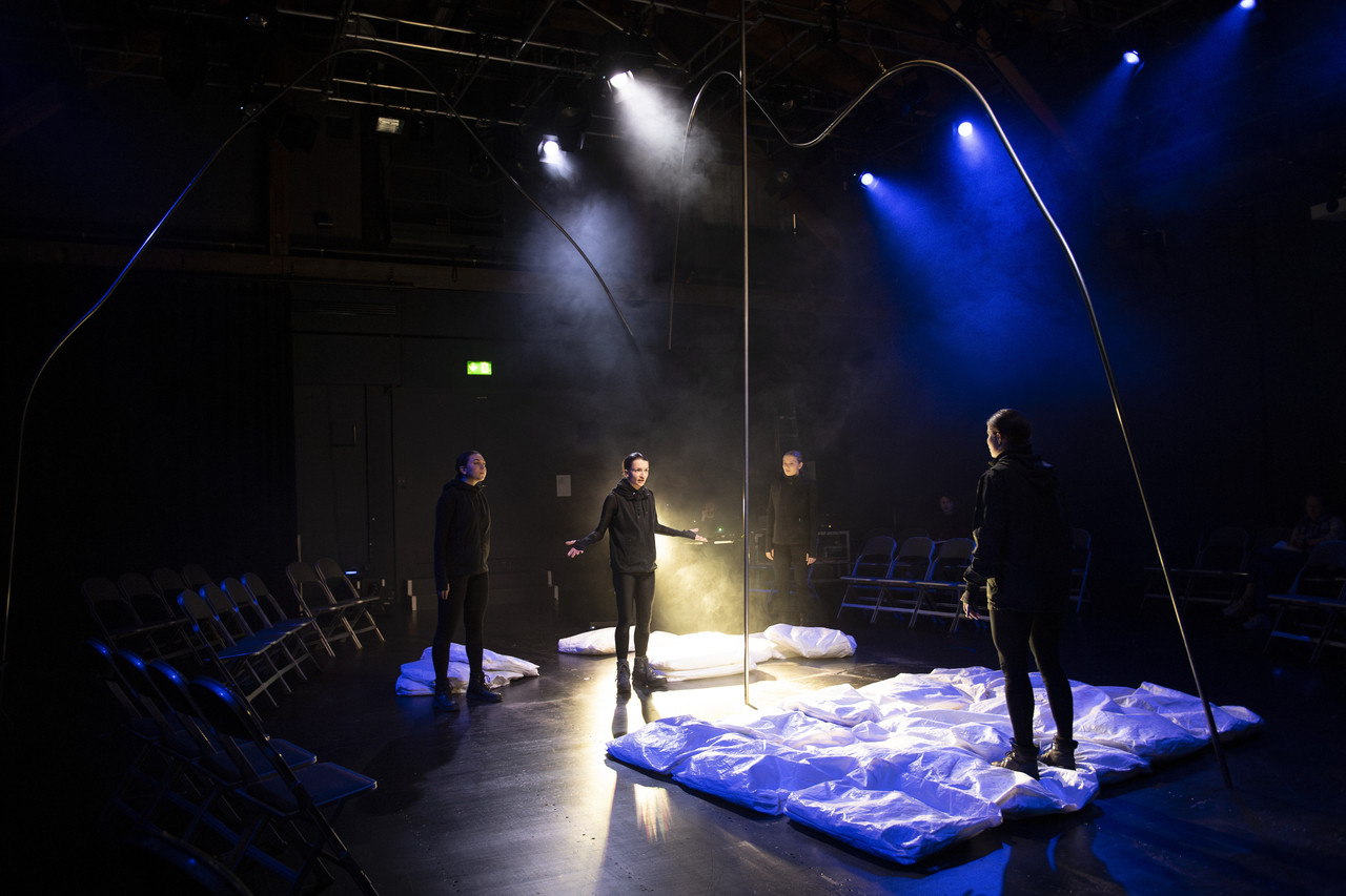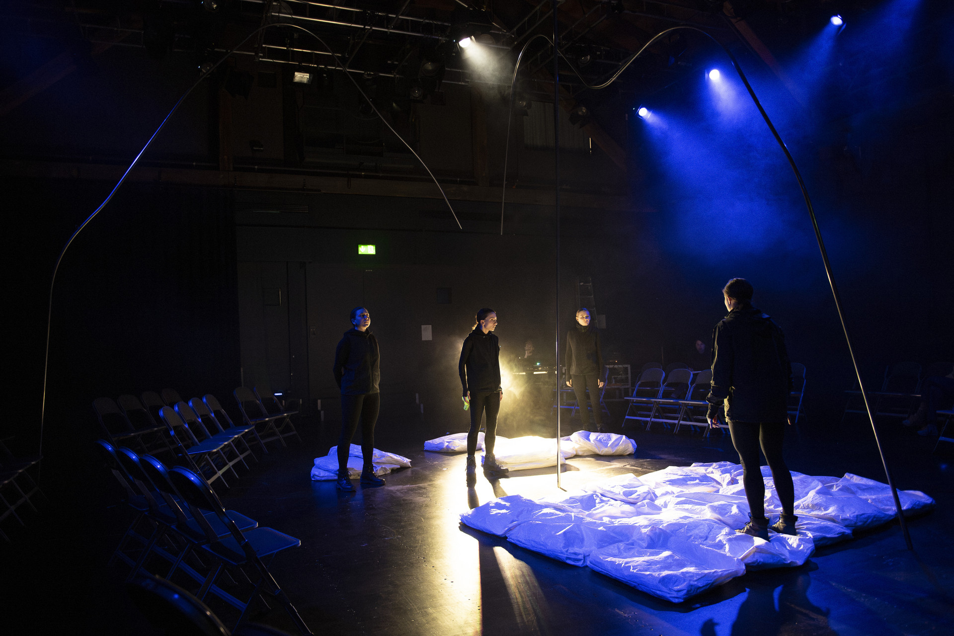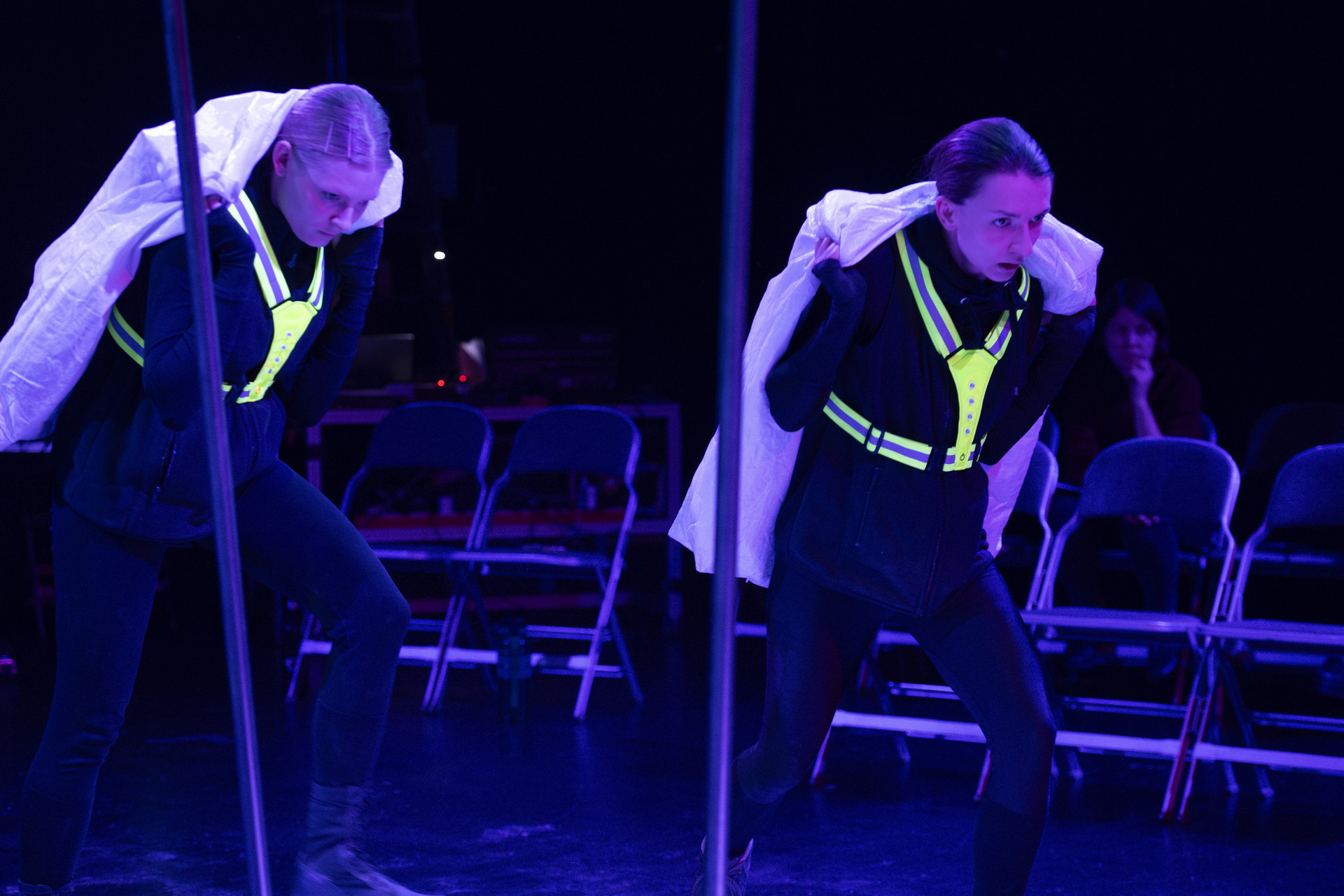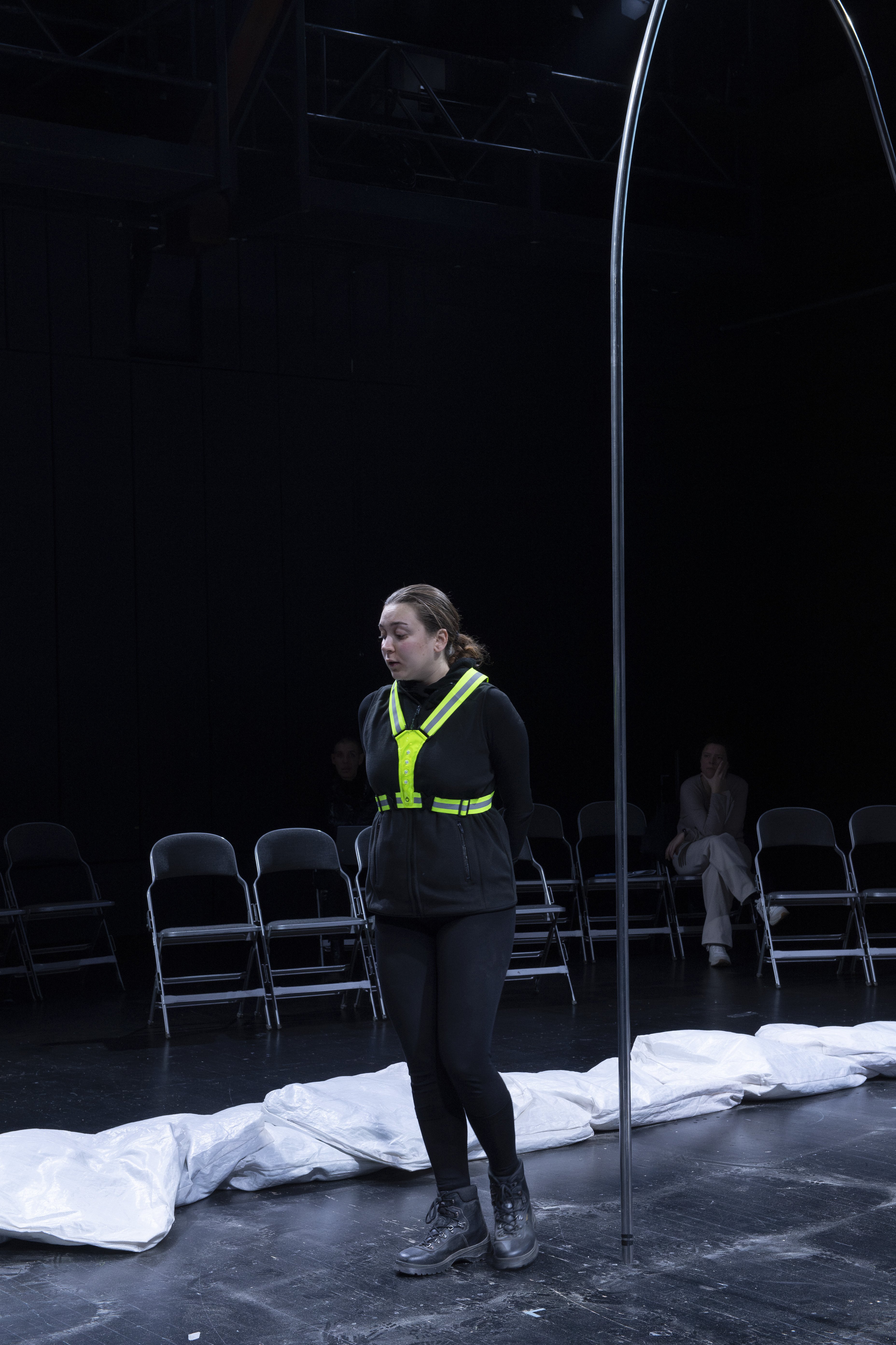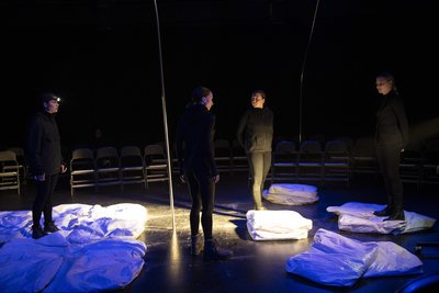 In unserer Inszenierung sind die Ereignisse aus dem Stück längst vergangen. Der Schneesturm beschwört die Arbeiter und den Ingenieur wieder herauf. Können sie sich jetzt einander verletzlich zeigen, in ihrer Schuld und in ihrer Sehnsucht?