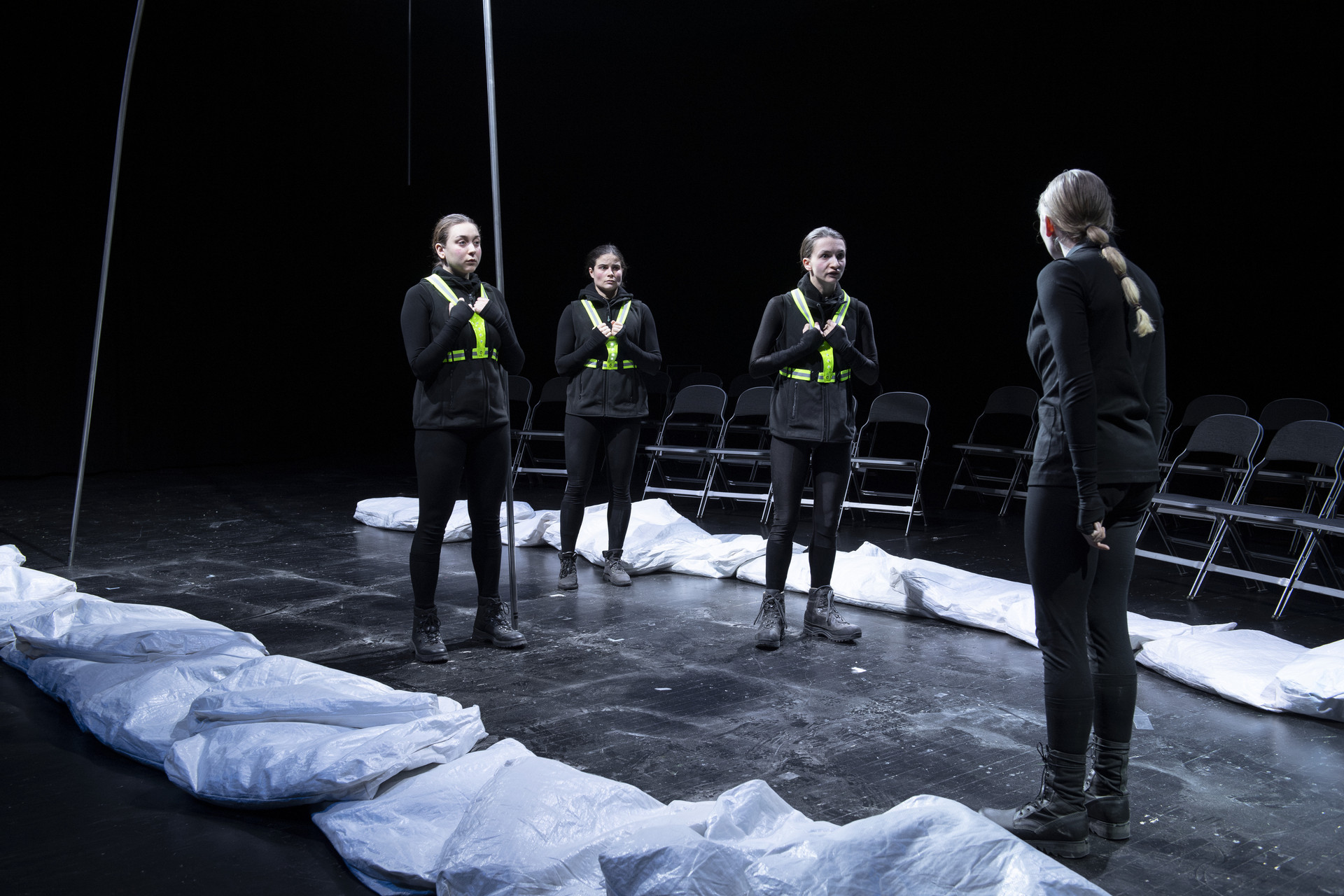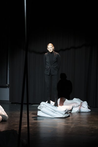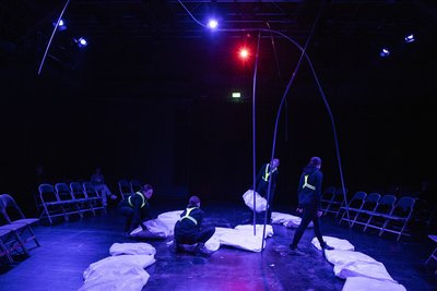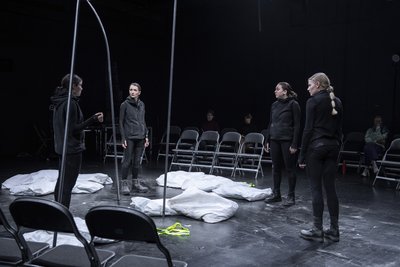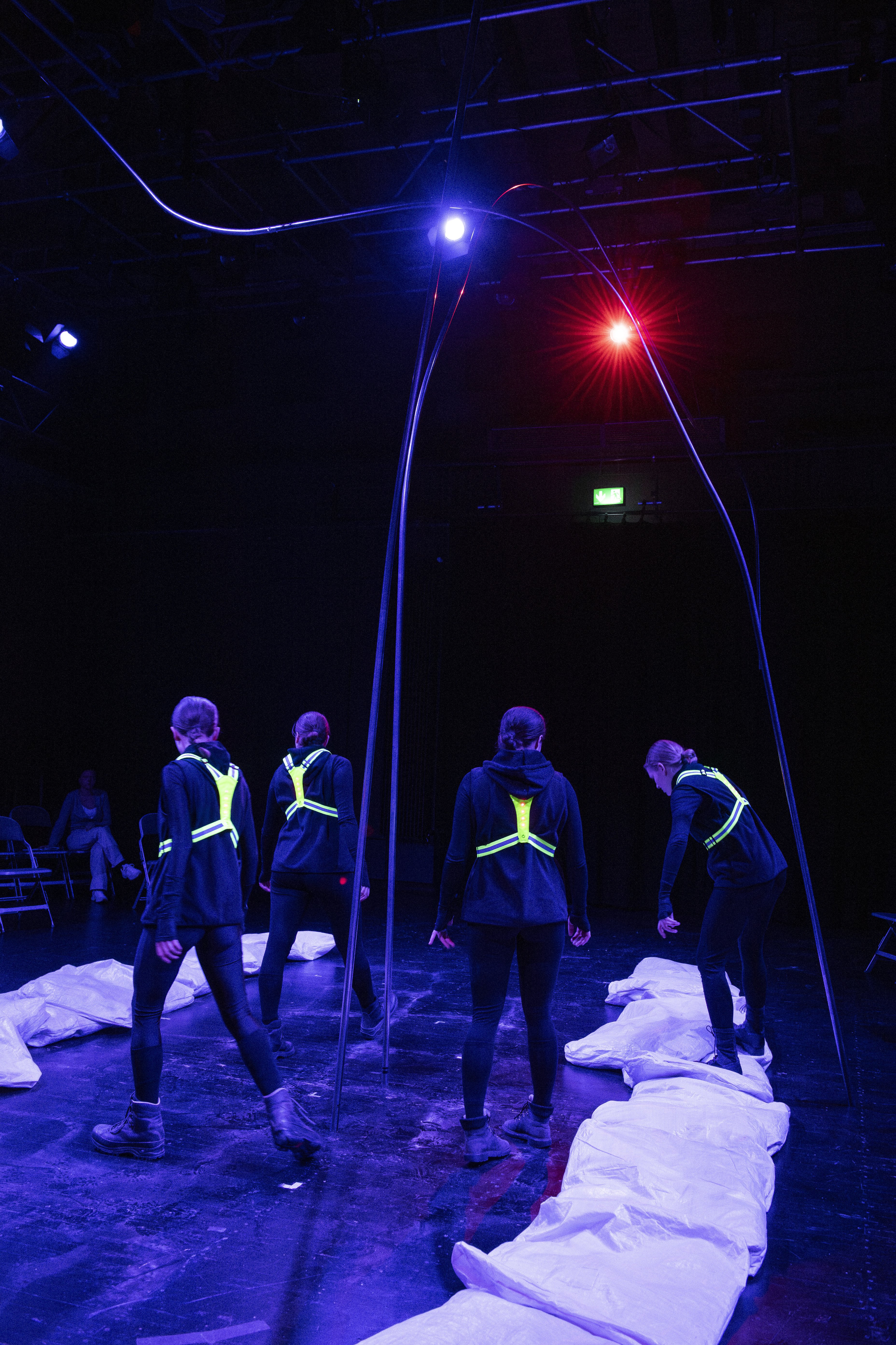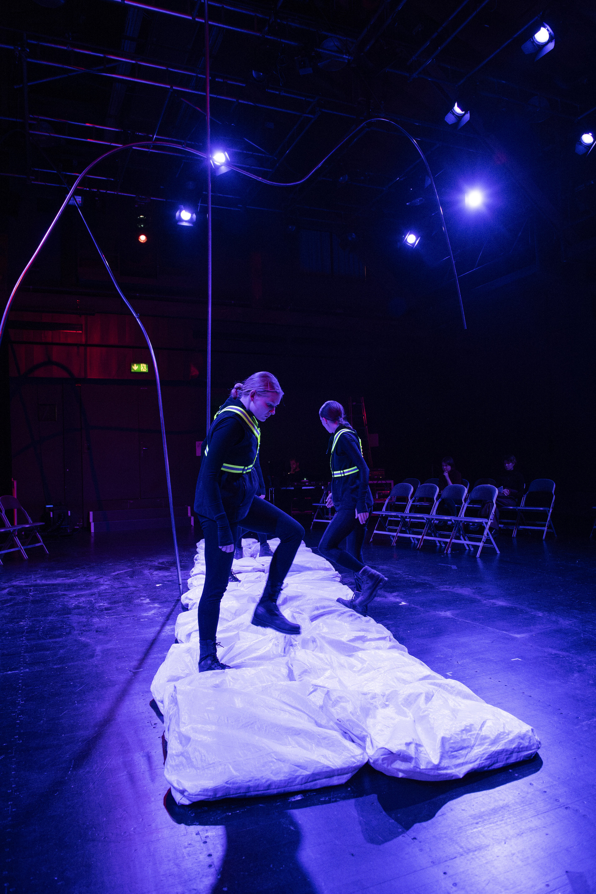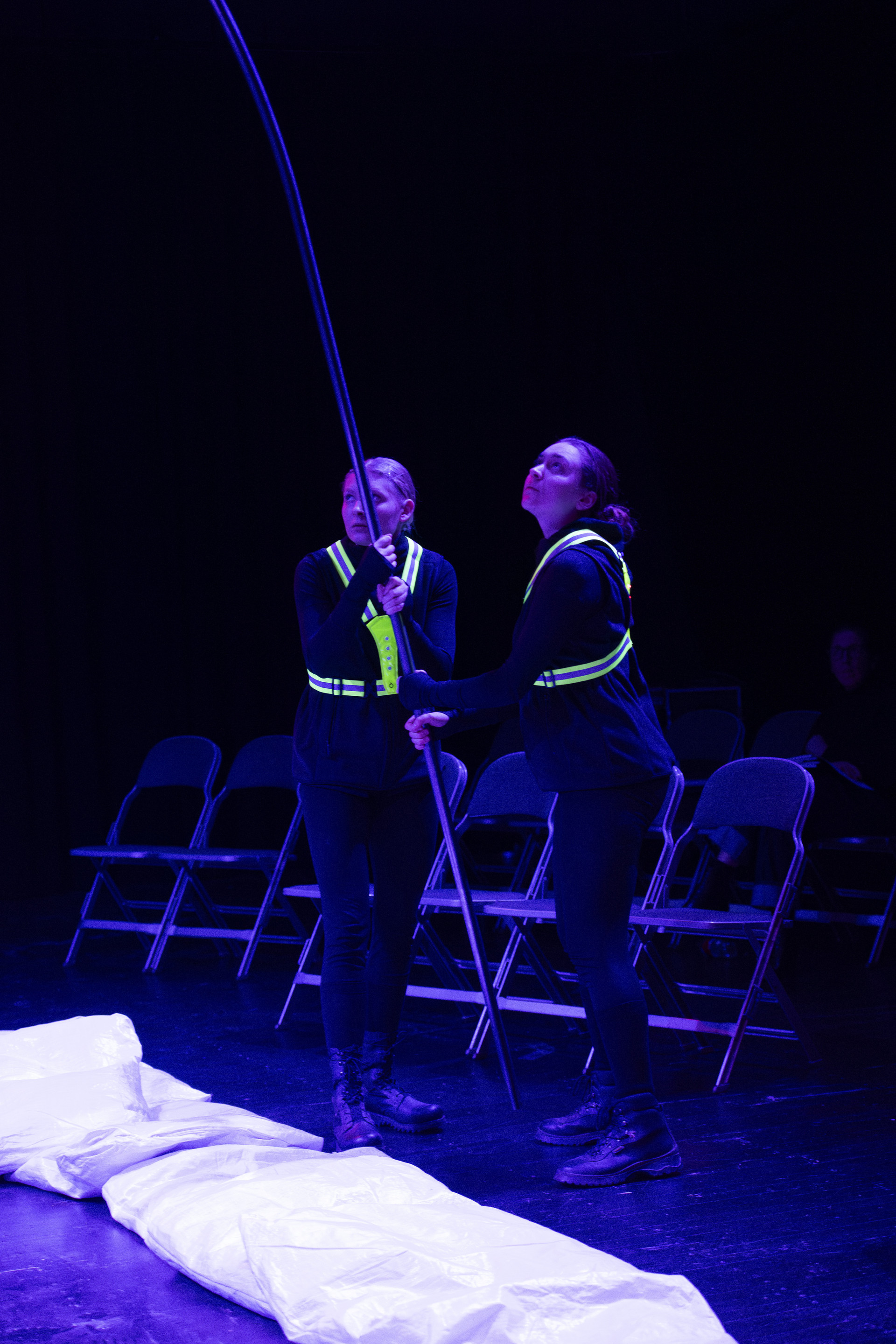 In unserer Inszenierung sind die Ereignisse aus dem Stück längst vergangen. Der Schneesturm beschwört die Arbeiter und den Ingenieur wieder herauf. Können sie sich jetzt einander verletzlich zeigen, in ihrer Schuld und in ihrer Sehnsucht?