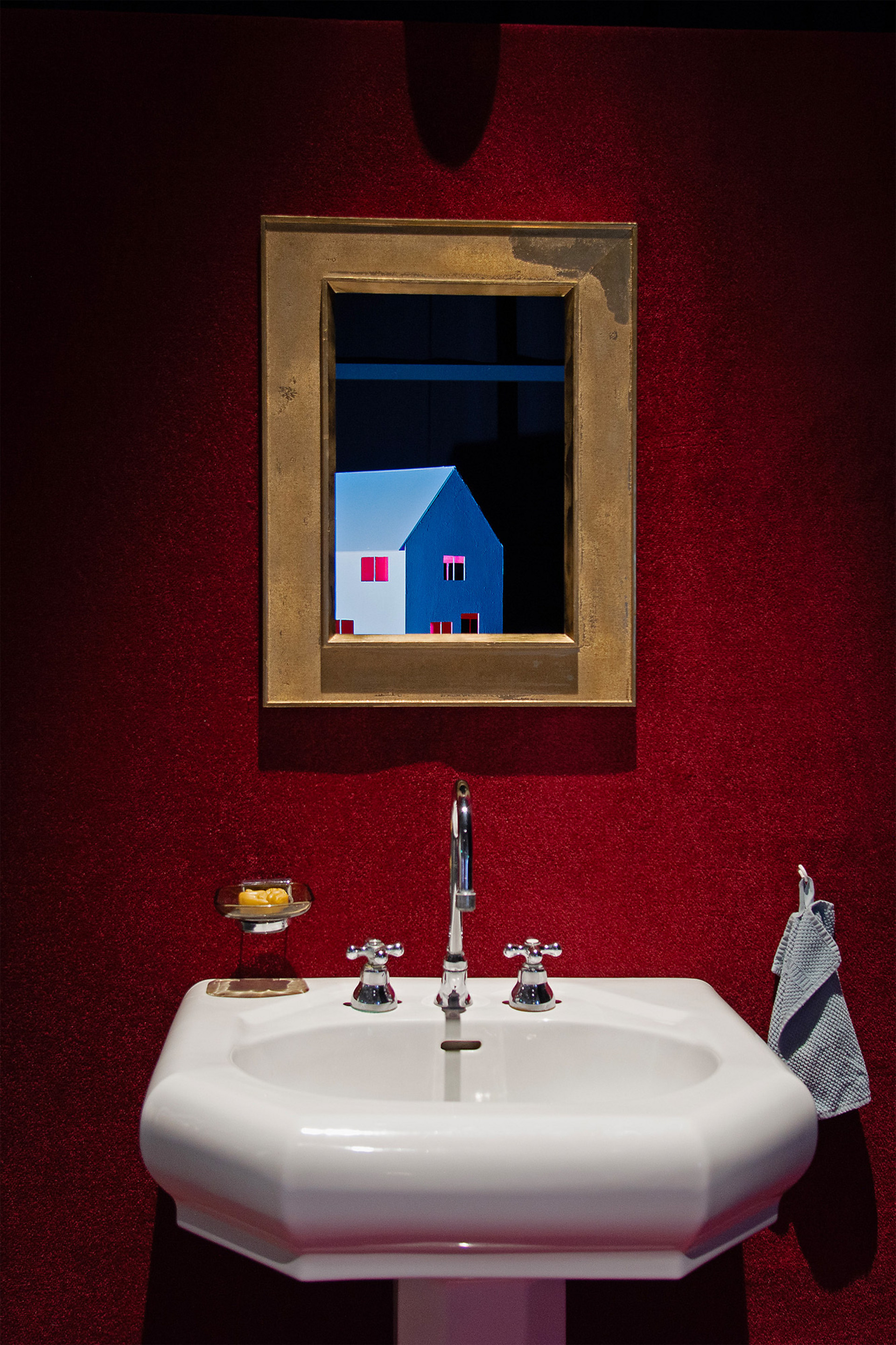 Warum bleiben manche Details lebendig, während andere verblassen? Ein nachgestellter Flur mit rotem Teppich, ein Waschbecken und ein goldener Spiegel schaffen eine Atmosphäre, die durch Klänge wie Kinderlachen und Vogelgezwitscher ergänzt wird. Der Duft einer vertrauten Seife weckt Erinnerungen, während ein Modell des Hauses im Spiegel erscheint.
