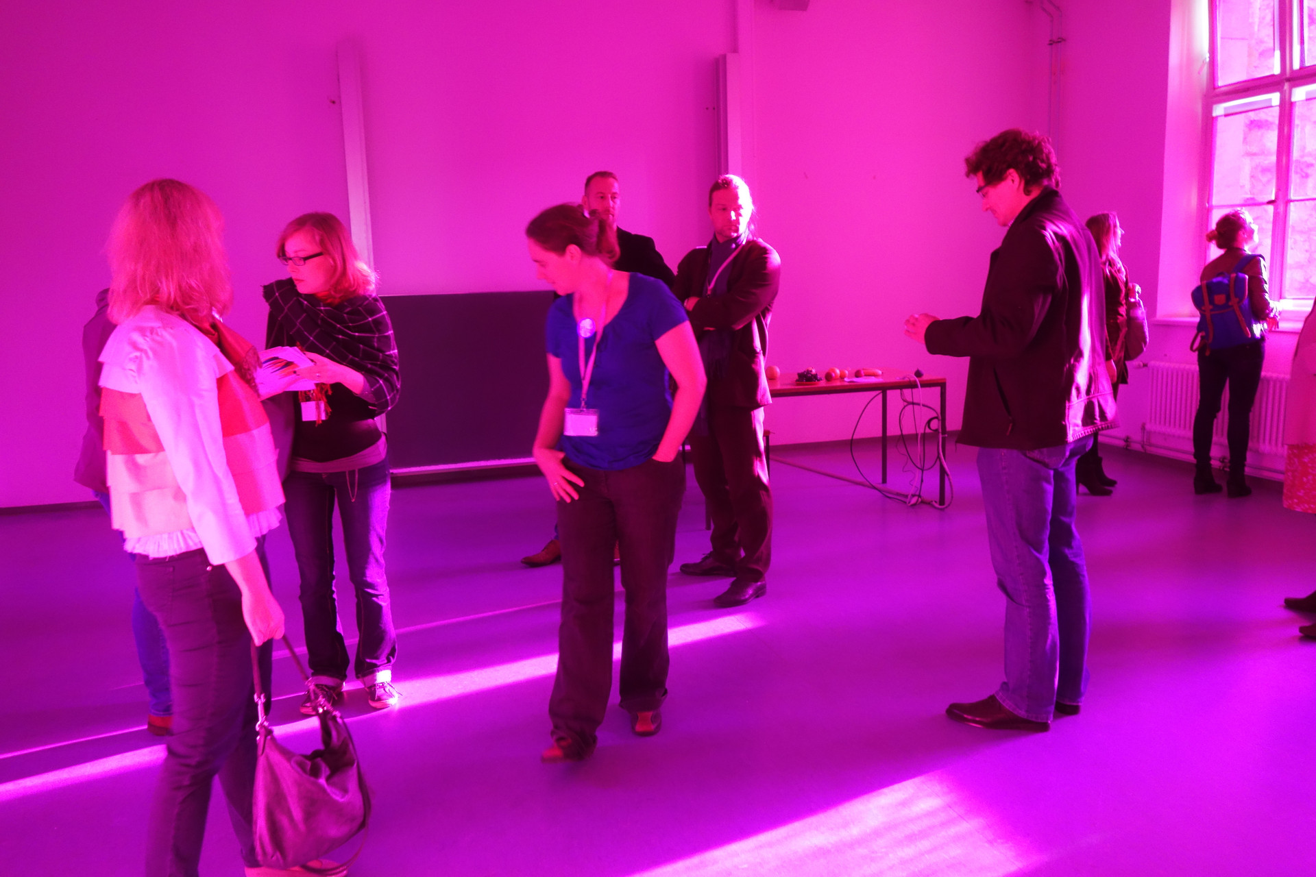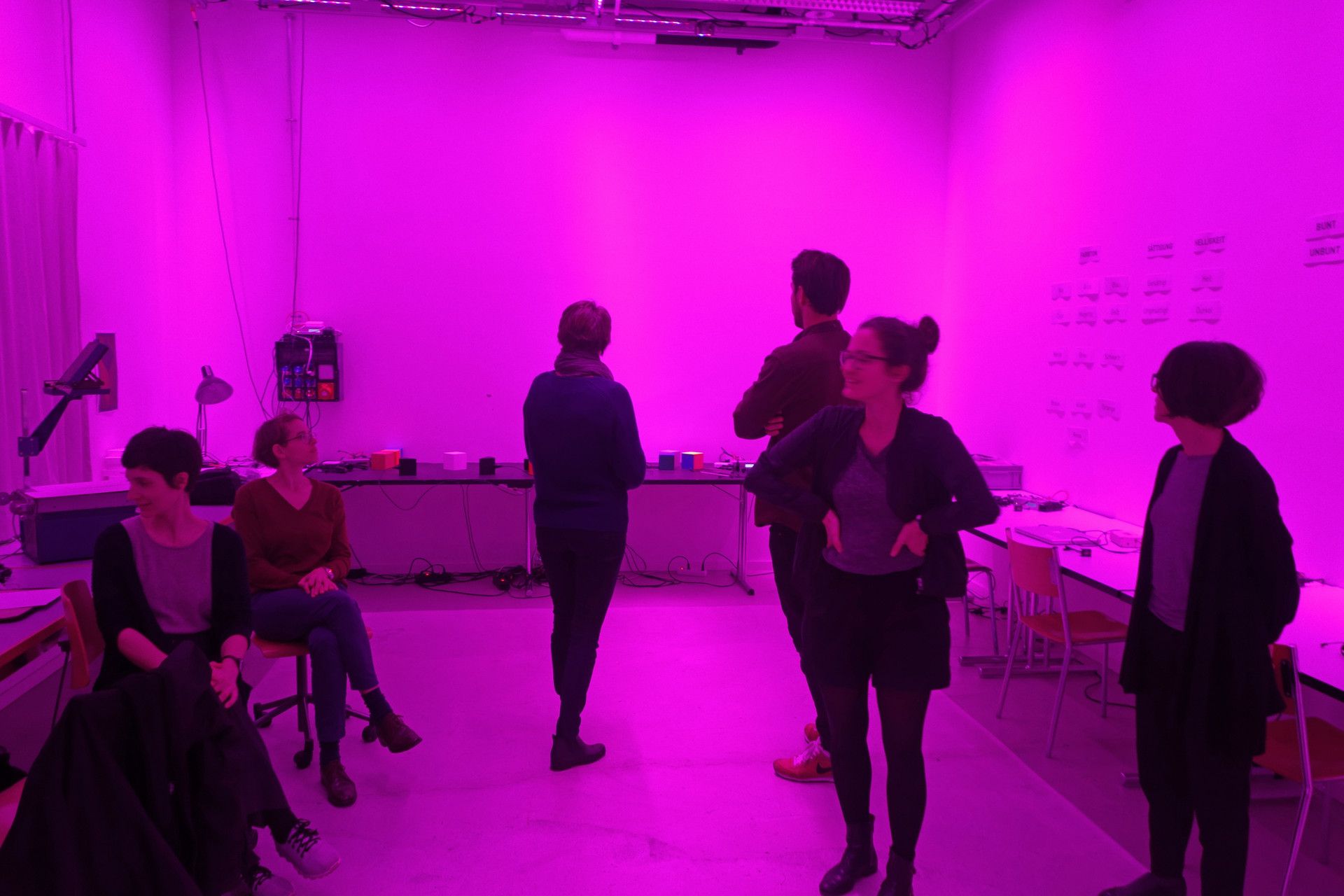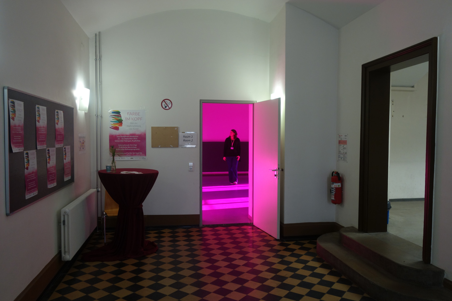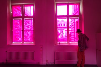 Diese Installation führt uns eindrücklich die selektive Adaptation unserer Farbrezeptoren und die entsprechende selektive Abschwächung der Farbwahrnehmung vor Augen mit entsprechender Verschiebung des Weisspunktes. Besonders eindrücklich ist, dass gleichzeitig Magenta als Raumlicht und Grün als Nachbild (beim Blick nach aussen auf weisses Licht) wahrgenommen werden können und nicht zeitlich hintereinander, wie es typisch ist für das Nachbild.