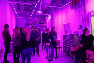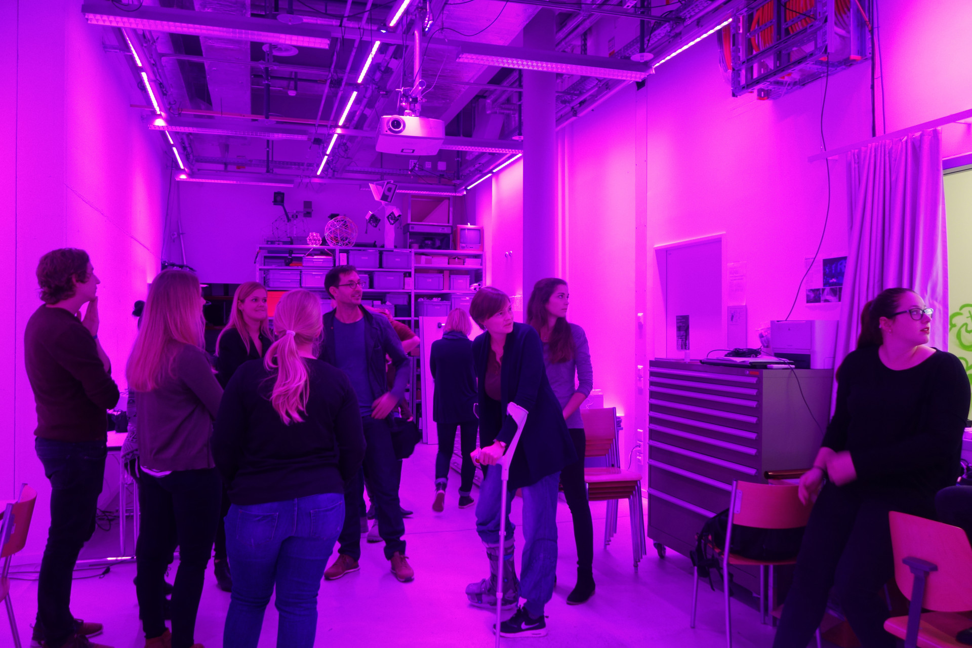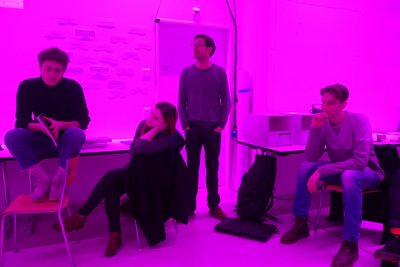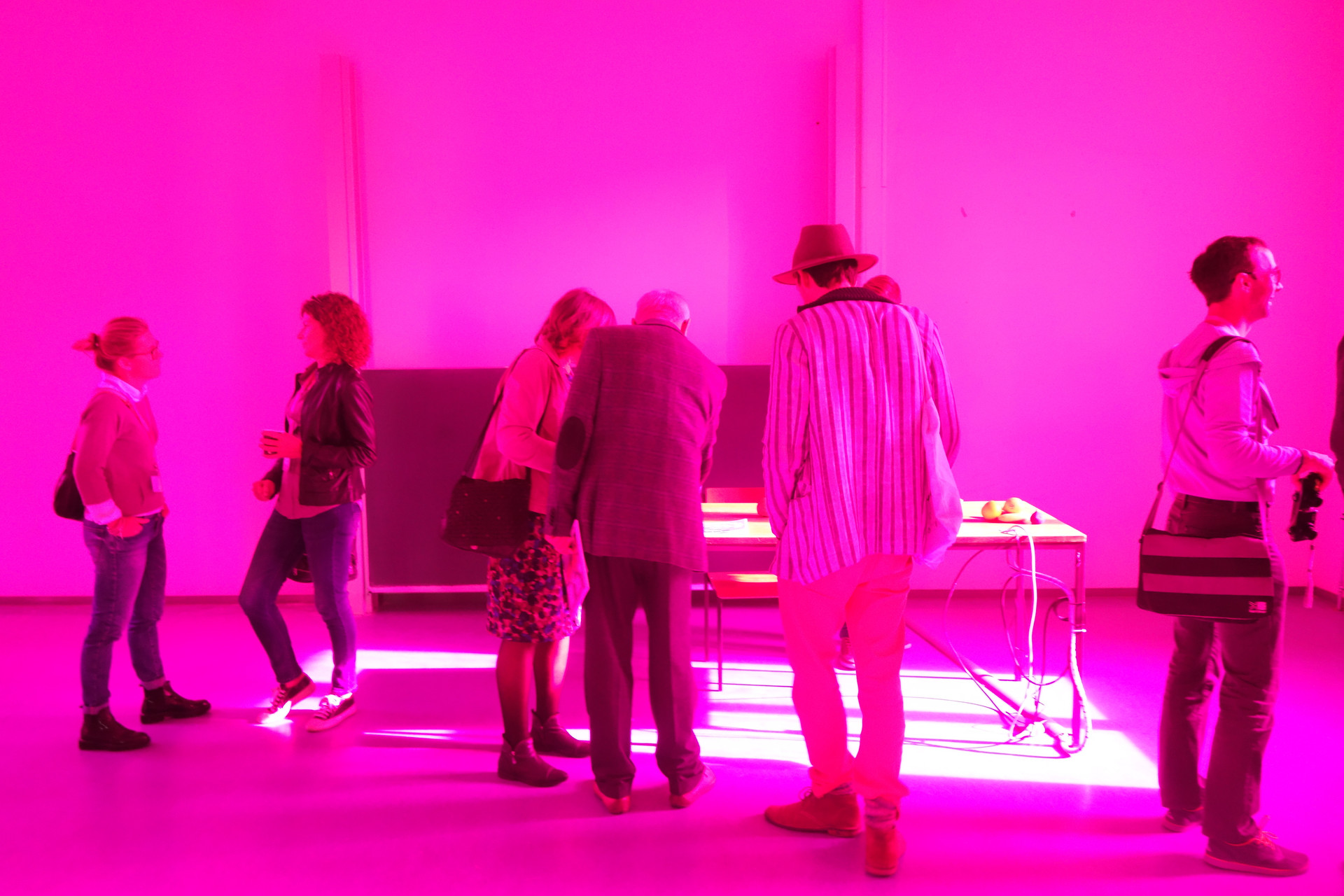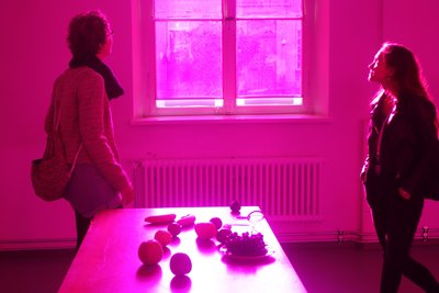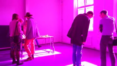Diese Installation führt uns eindrücklich die selektive Adaptation unserer Farbrezeptoren und die entsprechende selektive Abschwächung der Farbwahrnehmung vor Augen mit entsprechender Verschiebung des Weisspunktes. Besonders eindrücklich ist, dass gleichzeitig Magenta als Raumlicht und Grün als Nachbild (beim Blick nach aussen auf weisses Licht) wahrgenommen werden können und nicht zeitlich hintereinander, wie es typisch ist für das Nachbild.