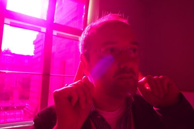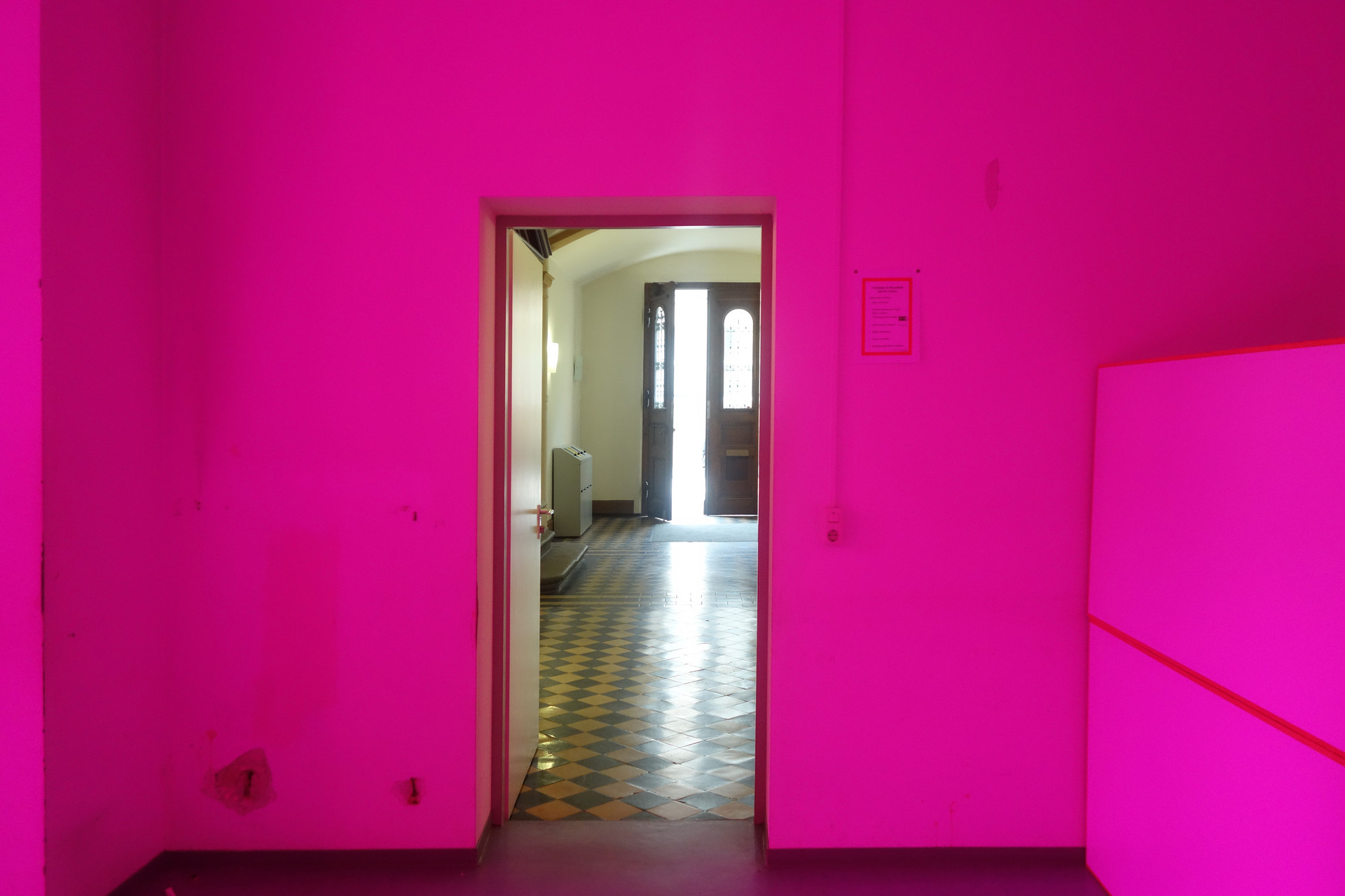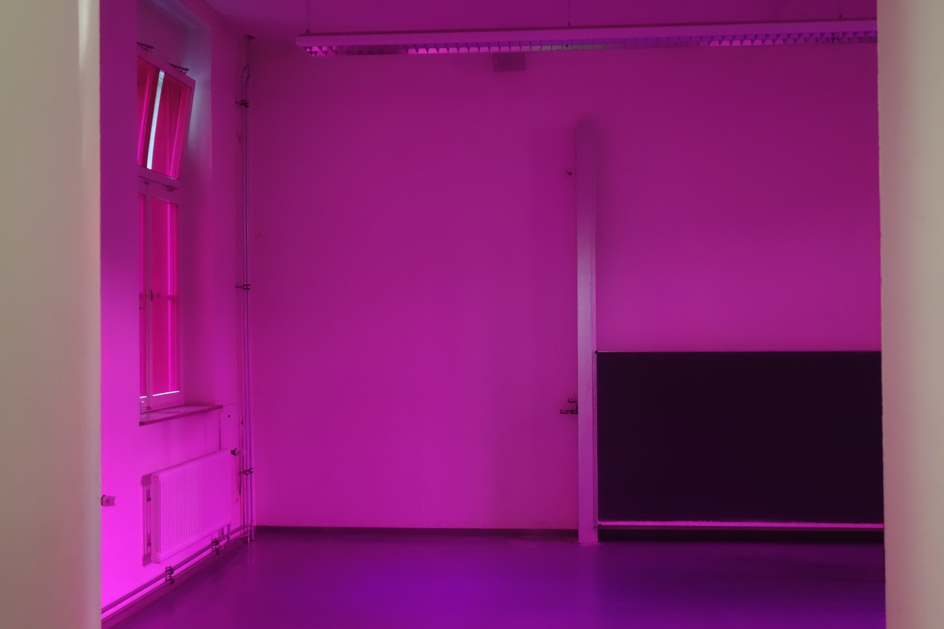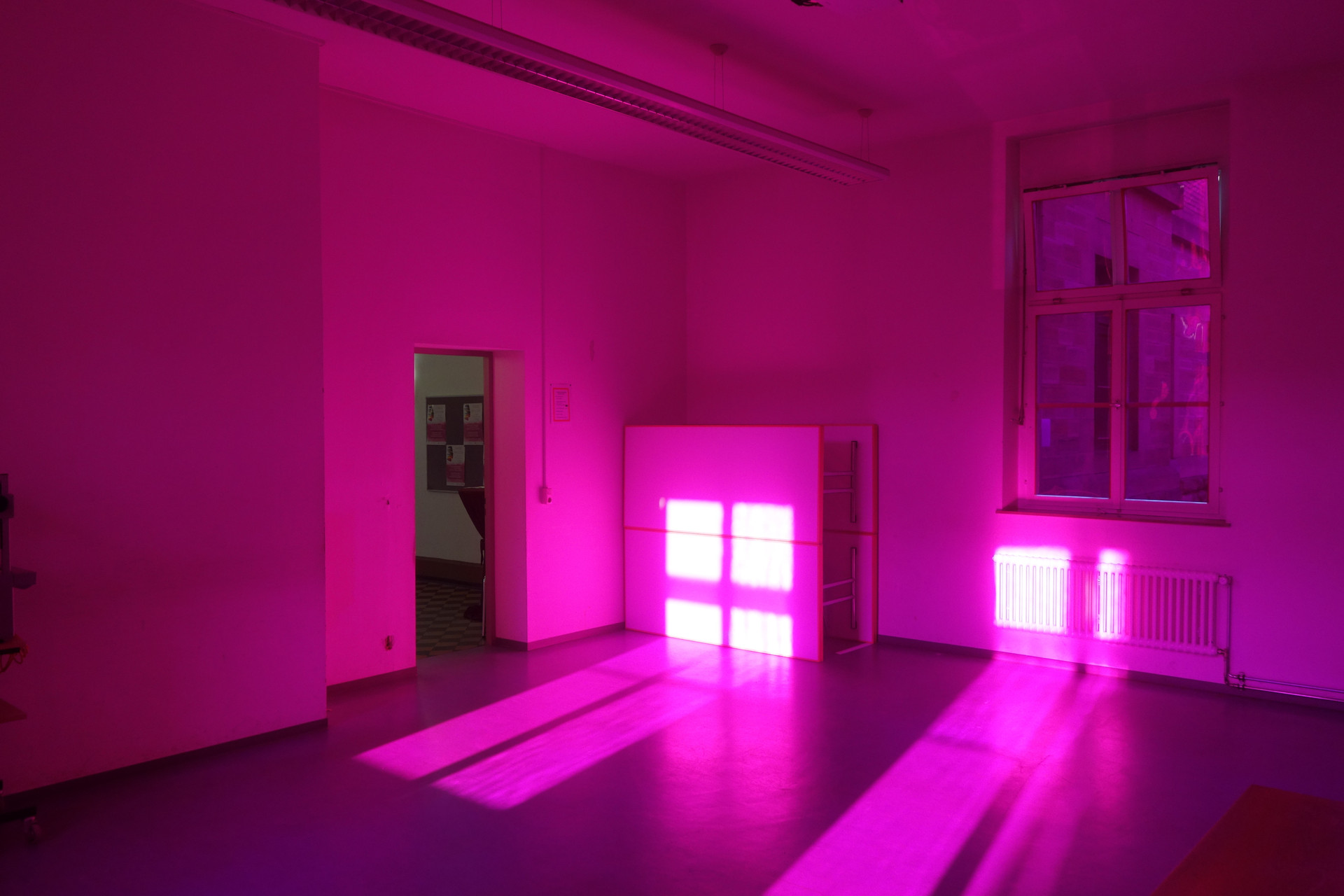 Doch ist man lange genug im Raum, scheint sich das Magenta stark abzuschwächen und blickt man zum Ausgang oder ein offenes Fenster in weisses Licht, taucht auch das Grün als Nachbild wieder auf.