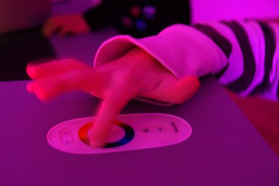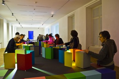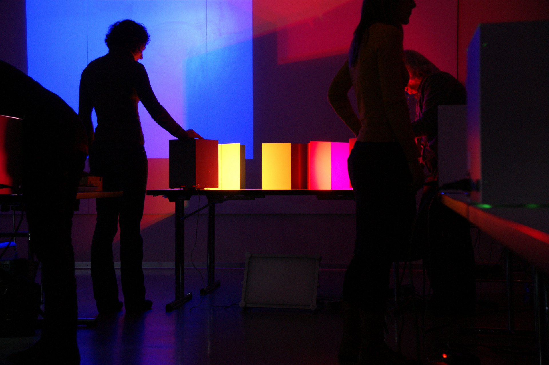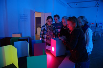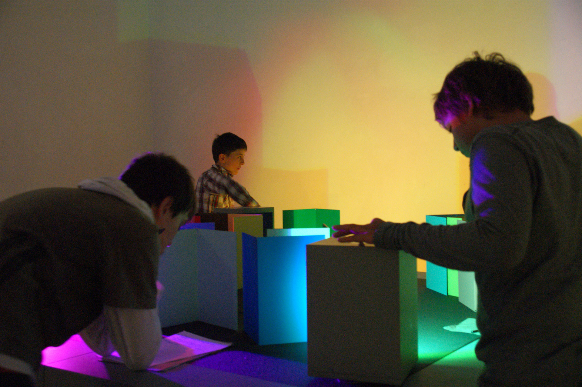 Der Spieltisch lädt zum Experimentieren mit dynamisch steuerbaren LED-Leuchten und farbig beschichteten Blechwinkeln ein, welche in verschiedenen Farb- und Raumkombinationen aufgebaut werden können. Farbton, Sättigung und Helligkeit des Lichts können manuell verändert werden, sodass aktiv grundlegende Erfahrungen mit Wechselwirkungen zwischen Oberflächenfarben und farbigem Licht gemacht werden können.