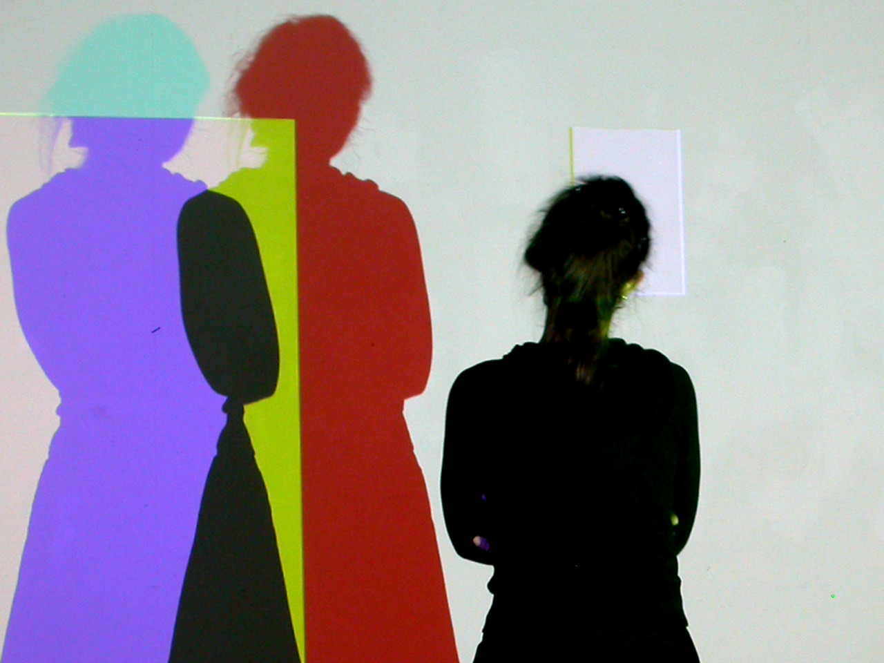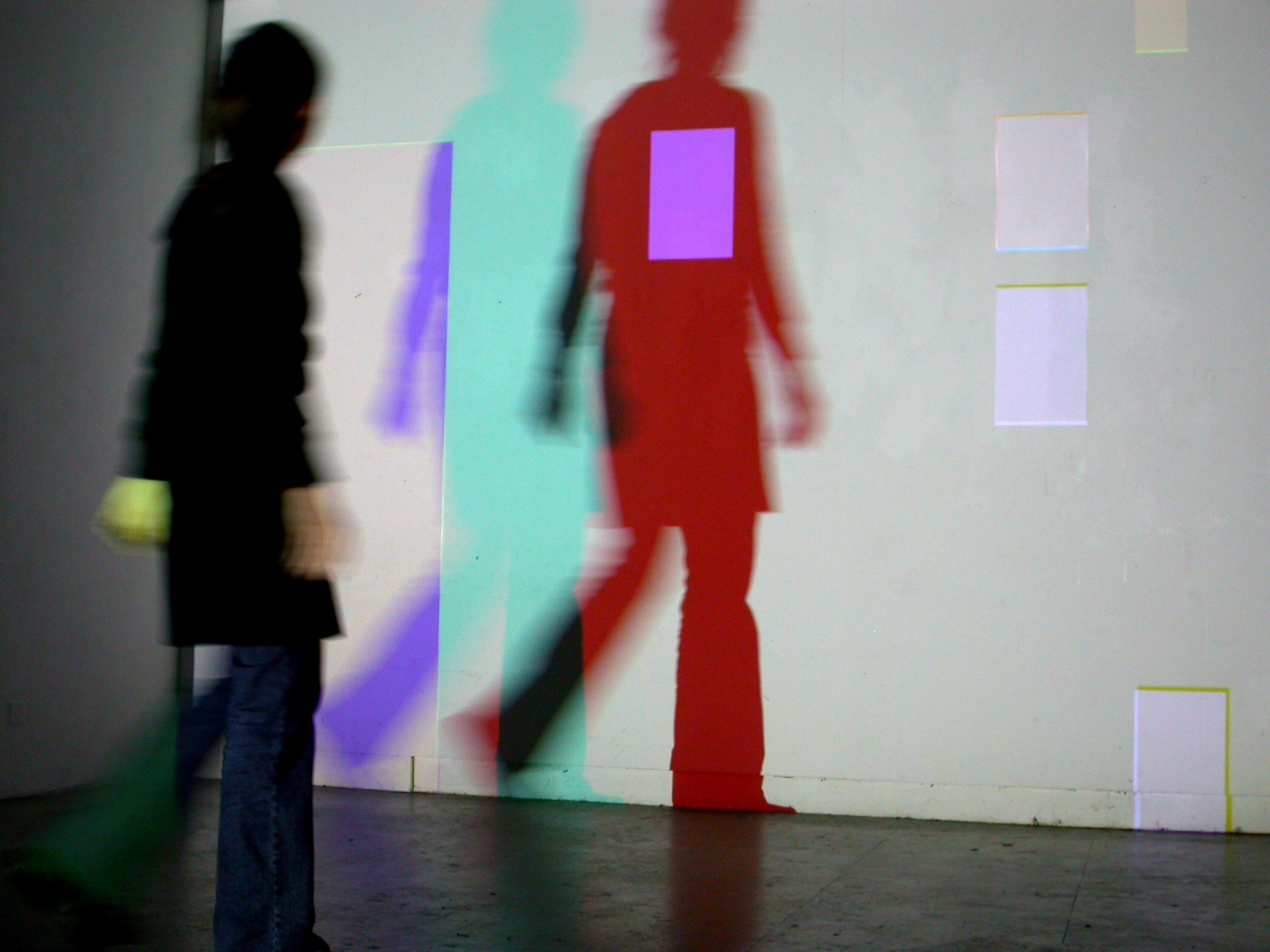 Der Schatten des Betrachters legt Teile der Bilder frei und eröffnet ihm deren farbliche Zusammensetzung. Über zwei Bildschirme, die sich im Raum befinden, ist es jederzeit möglich, sich farblich zu orientieren. Man kann die Projektion nach ihrem farblichen Aufbau abtasten und erfährt über die eigene Bewegung und Handlung, welche Farben additiv zusammengemischt Weiss ergeben.
