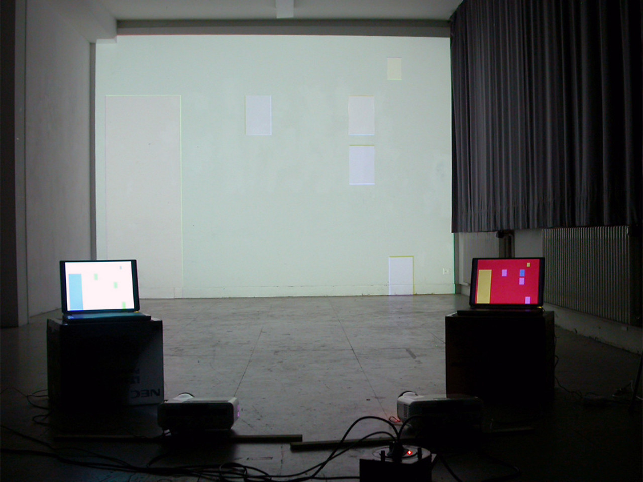 Diese Arbeit thematisiert additive Mischungen von farbigem Licht hin zu weißem. Die Ausgangslage bildet ein mehrfarbiges Bild, welches wandfüllend projiziert wird. Mit einer zweiten Projektion wird dasselbe Bild in den Komplementärfarben darüber gelegt. Das Ergebnis ist ein Lichtbild, dessen Farben sehr zurückhaltend sind.