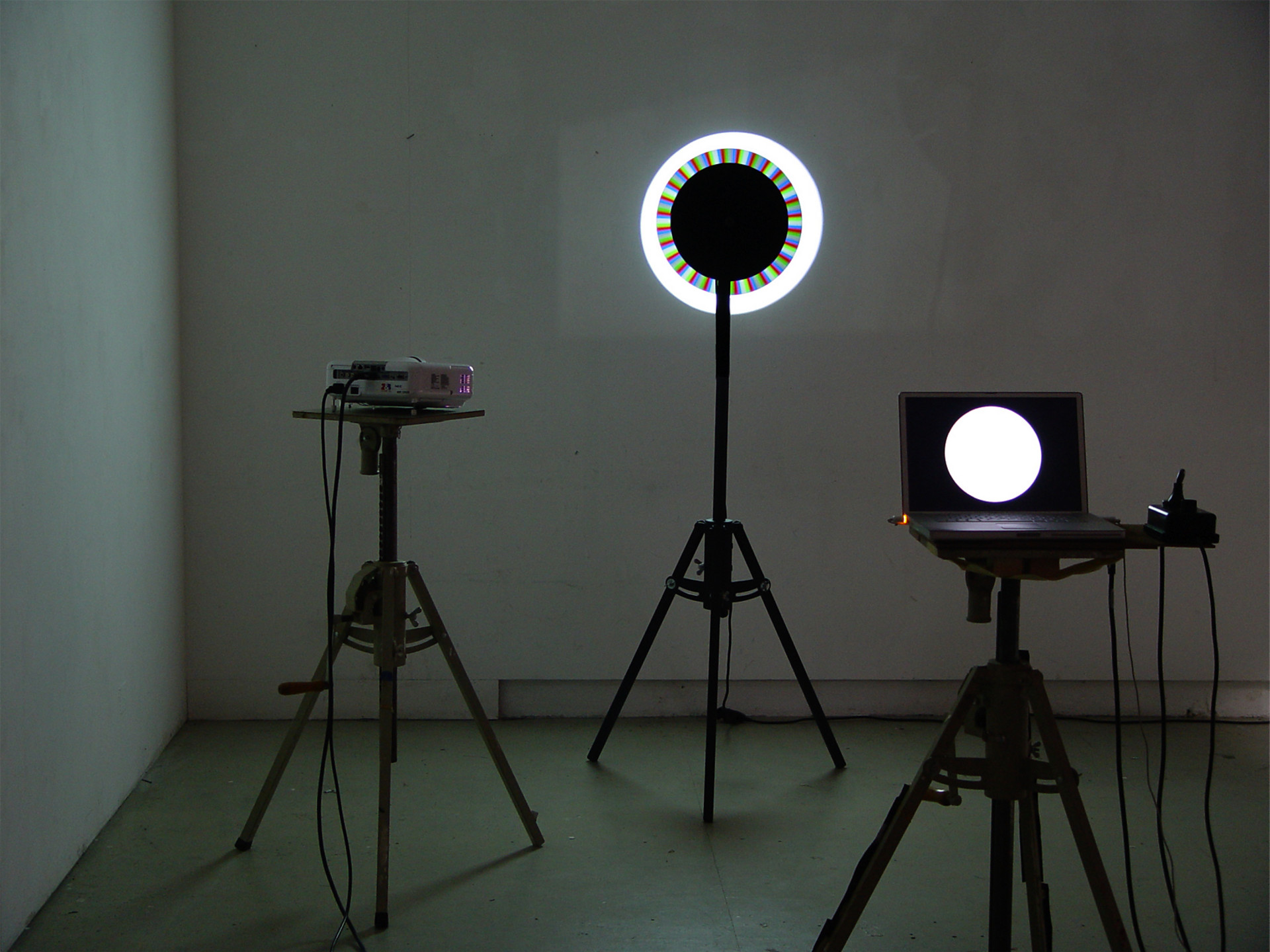 Beim Projektionsverfahren von DLP-Beamern (Digital Light Processing) werden die einzelnen Farben jeweils durch schnell hintereinander projizierte Farbpixel in den Grundfarben Rot, Grün und Blau zusammengesetzt, was zu einer optischen Farbmischung führt. Zur Darstellung von Weiss wird zusätzlich zu den drei Grundfarben noch weisses Licht verwendet, welches bei grauem Licht fehlt. Die Farbmischungen können in der interaktiven Installation durch eine sich drehende stroboskopische Scheibe rückgängig gemacht werden, sodass die Zusammensetzung des Beamerlichts sichtbar wird: Weiss setzt sich zusammen aus Rot, Grün, Blau und Weiss, Grau aus Rot, Grün und Blau, Cyan aus Blau und Grün, Magenta aus Blau und Rot, Gelb aus Rot und Grün. Die Grundfarben lassen sich demgegenüber nicht mehr weiter auftrennen.