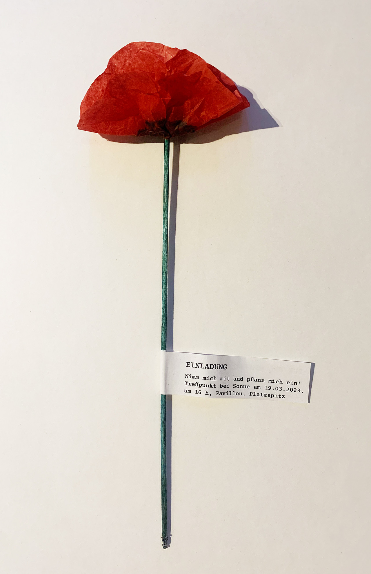 Die Zeit der offenen Drogenszene auf dem Platzspitz von 1986–1992 war einschneidend und traumatisch, aber auf dem Platz selbst erzählt nichts von dieser Geschichte. Das Mohnmal, bestehend aus Mohnblumen und einer Gedenktafel am Pavillon, ändert das nun. Die Aussaat findet am 19. 3. 2023 statt. Gemeinsam werden Papiermohnblumen, die Samenträger, in die Erde gesteckt. Die Besucher:innen der Diplomausstellung sind dazu eingeladen, eine Papierblume aus der Installation zu pflücken und am Happening teilzunehmen. So wird ein kollektives Erinnern angeregt und ein Mahnmal gepflanzt für die Verstorbenen, aber auch für die Überlebenden. Gegen das Vergessen.