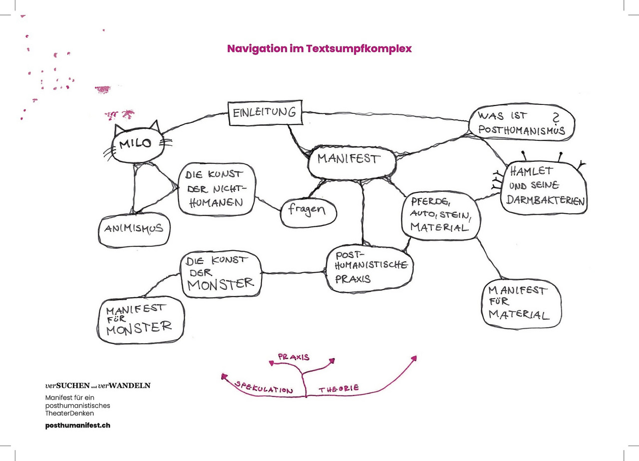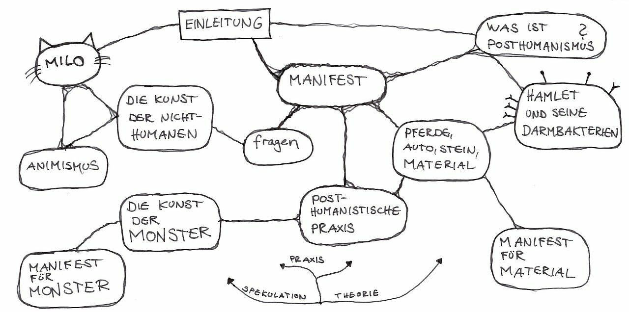 Im Zentrum dieses Textkomplexes steht ein Manifest, welches ein posthumanistisches TheaterDenken fordert. Ein Denken, welches nicht mehr den Menschen ins Zentrum stellt, sondern die vielfältigen Vernetzungen, Symbiosen und Kollaborationen von menschlichen und nichtmenschlichen Wesen zum Ausgangspunkt nimmt. Wie lässt sich dieses Denken im Theater umsetzen? Was muss sich am Theater verändern, damit nichtmenschliche Akteur*innen in künstlerischen Prozessen auf Augenhöhe mit menschlichen Akteur*innen kollaborieren können? Damit beschäftigt sich dieser Textkomplex.