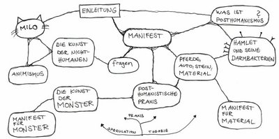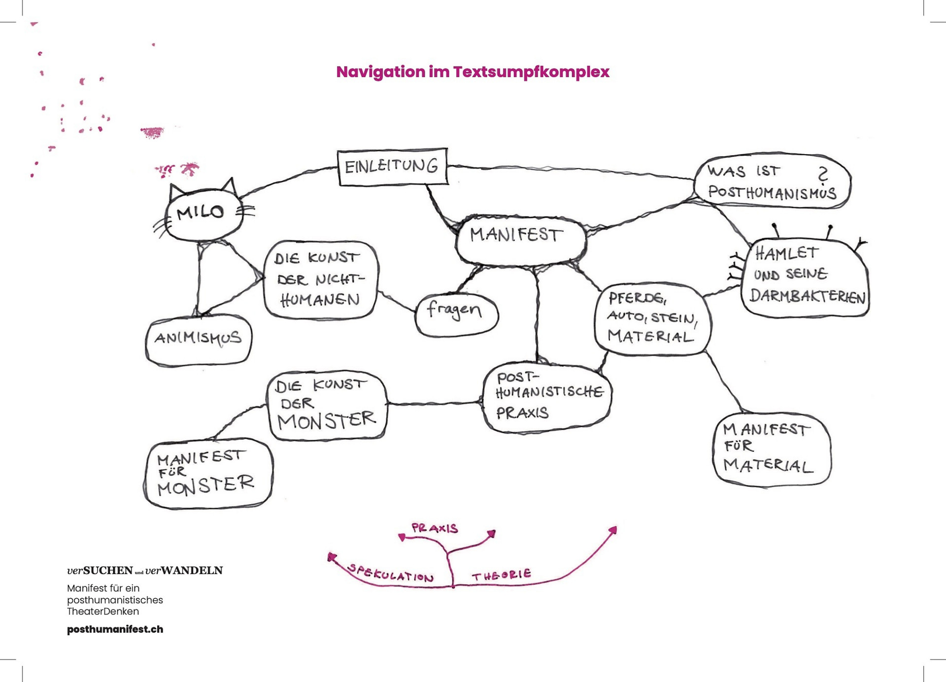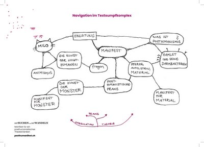 Der Textkomplex ist nonlinear aufgebaut und auf der Website www.posthumanifest.ch zu lesen. Die Arbeit am Textkomplex ist bewusst nicht abgeschlossen, weshalb es auch keine Printversion des Textkomplexes gibt. Die einzige physische Existenz der Masterarbeit ist als Flyer mit einem Einführungstext, einem QR-Code und einer Karte zur Navigation im Textkomplex.