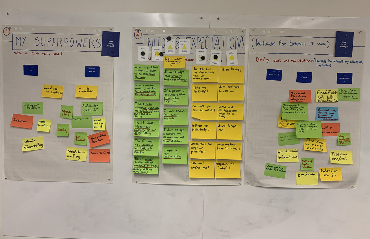 The presented work is located in the context of a public Swiss research funding agency, where the author is employed as a business analyst. She explores how the design thinking approach can improve collaboration between IT and other teams throughout the 400 employees, since the current siloed working environment has become a major barrier to efficient communication and collaboration during the process of digital transformation. In this context, the misalignments between the IT department and the other departments hamper the solutions and services offered by IT to the rest of the organization, leaving both parties dissatisfied. In three interventions undertaken by the author, the positive impact of discussions is shown, as is the need for a new collaborative space. Based on her findings, she proposes a workshop format to increase employees active participation in the ongoing cultural change of their company.