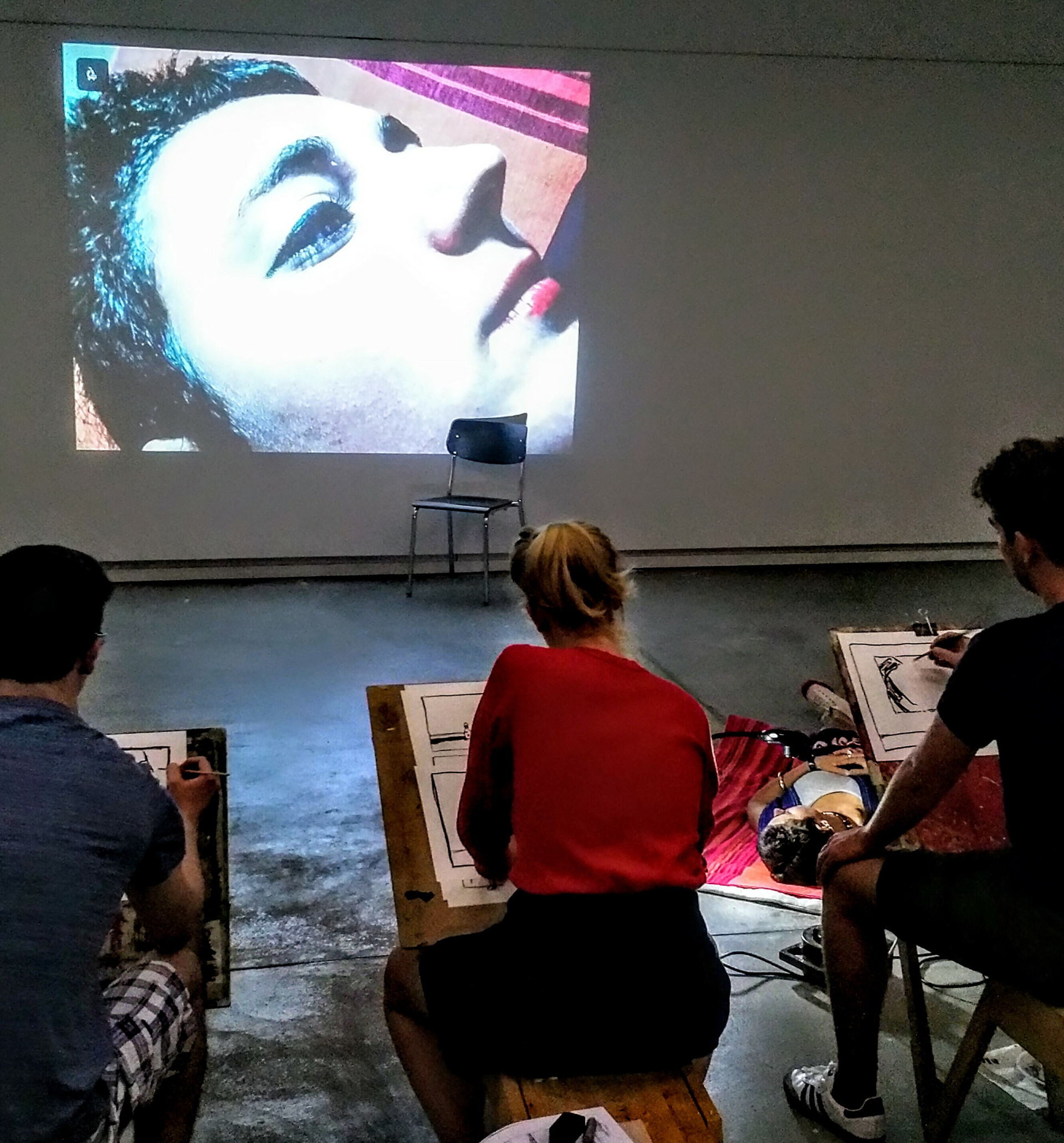Die Situation steht bewusst im Kontrast zum «normalen» Menschenzeichnen in einem Schulraum. Die Möglichkeit, dem Körper des beobachteten Menschen sehr nahe zu kommen, ist nur ein Beispiel. Die kleine Online-Kamera geht an Orte, an welche eine Gruppe von Zeichnenden nicht hingelangt. Zudem bestimmt die dozierende Person, was genau im Bildgeviert erscheint. Die Teilnehmenden müssen sich mit einer gegebenen Bildkomposition auseinandersetzen. Individuelle Perspektiven, Sichtweisen und Fokuspunkte existieren nicht. Eine Reihe neuer Fragen werden in dieser Situation aufgeworfen. Diese werden zeichnend und malend und in einer Diskussion reflektiert.