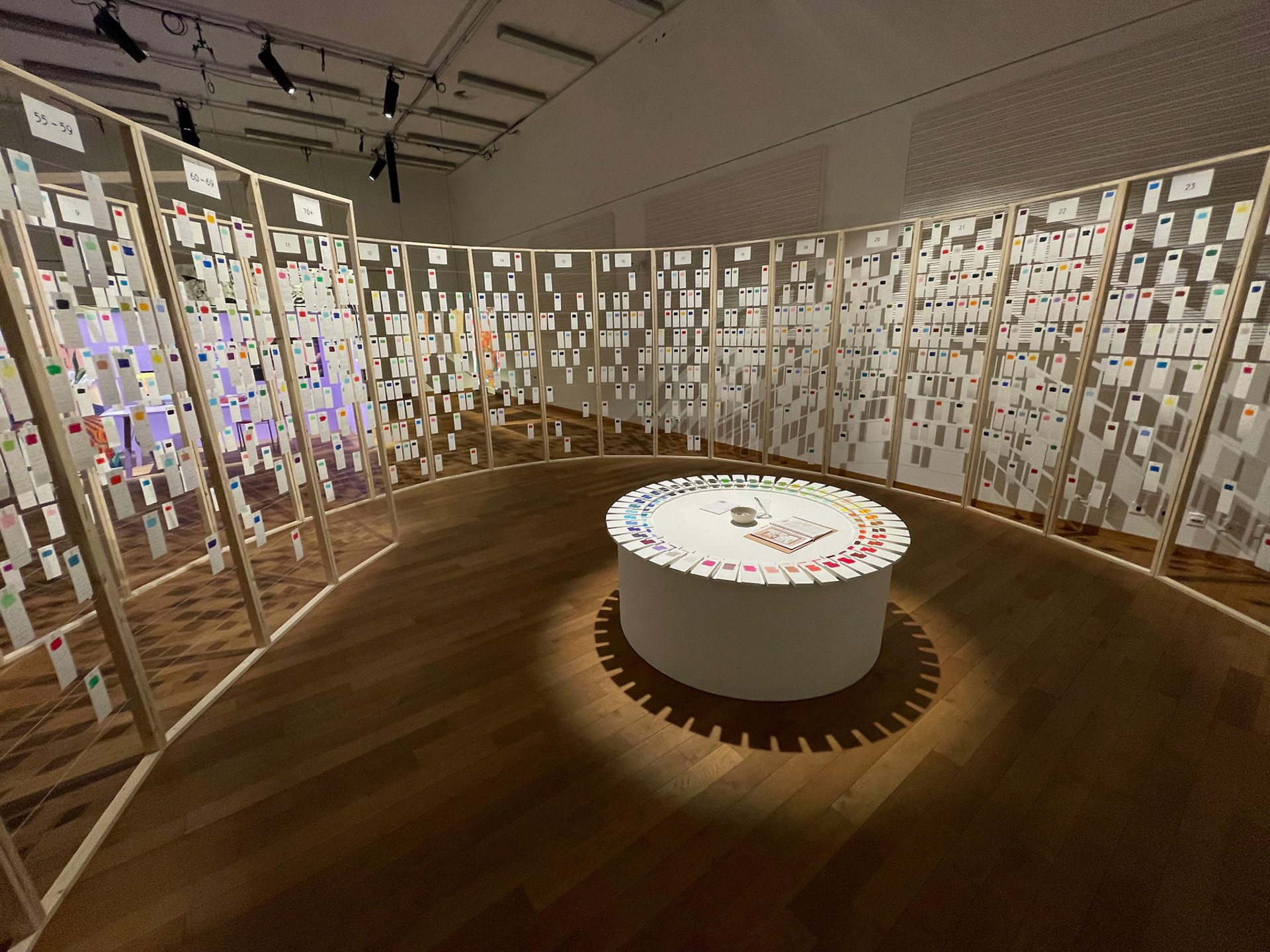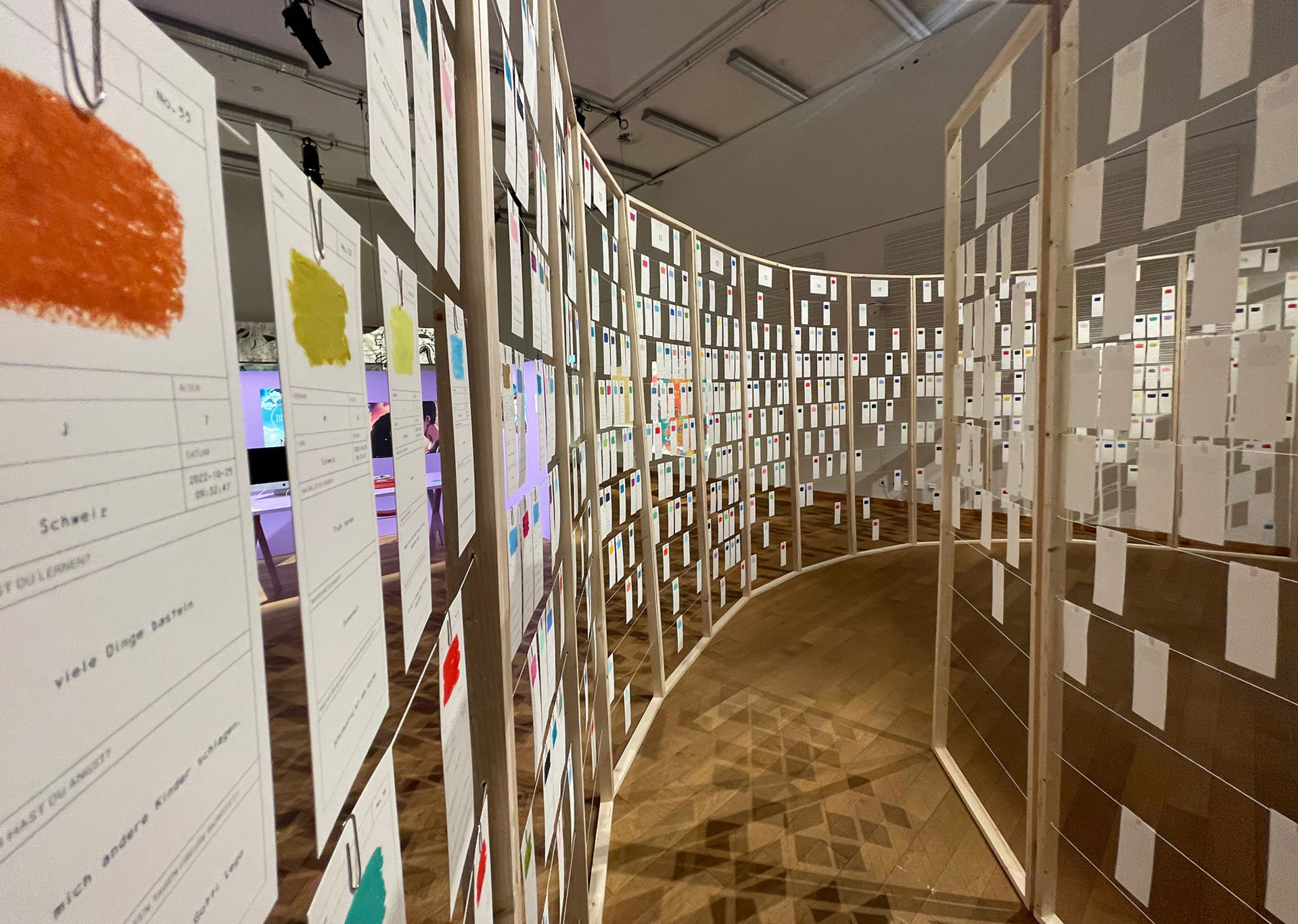 Die Karten sind nach Lebensalter geordnet. Während der Ausstellungsdauer haben die Besuchenden die Möglichkeit, selbst eine Karte auszufüllen und diese dazuzuhängen.